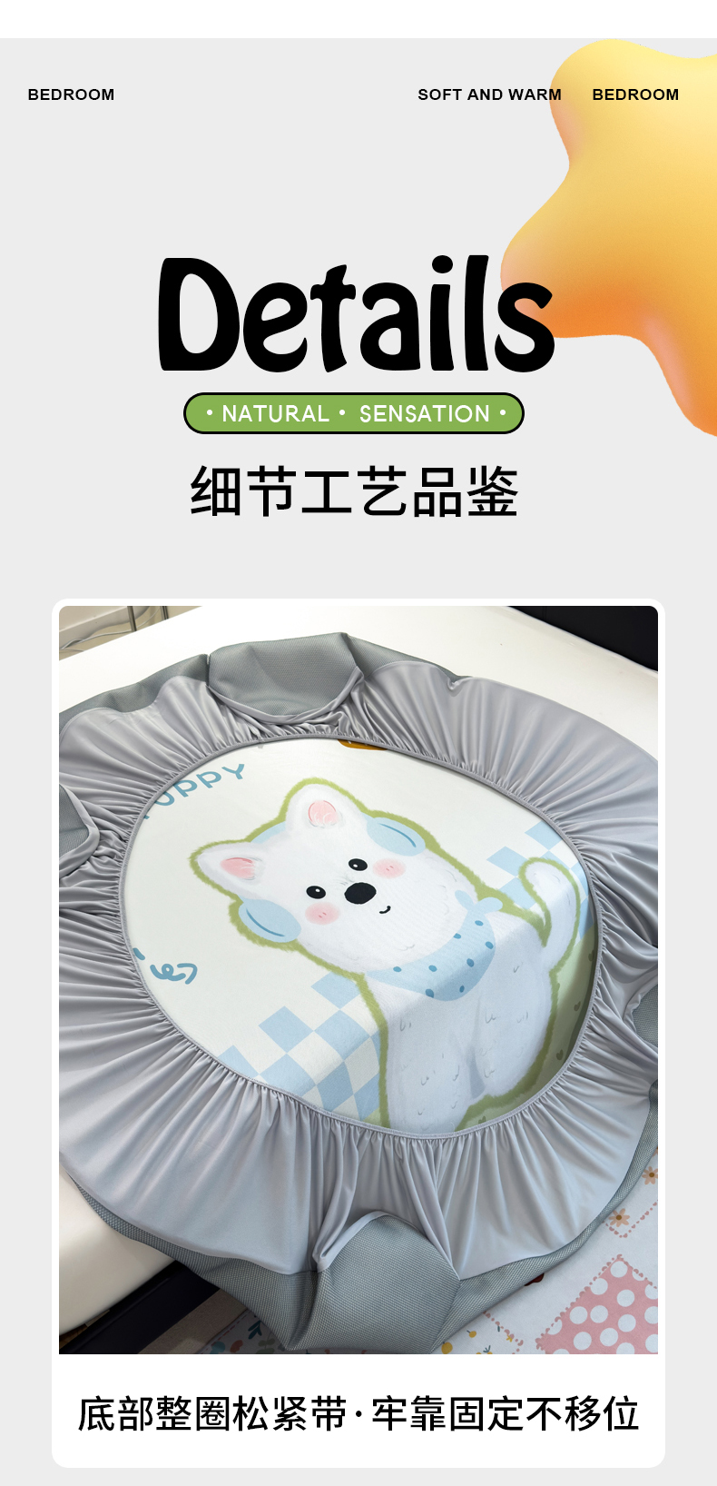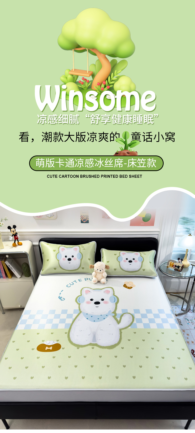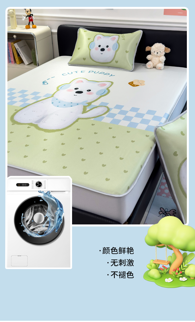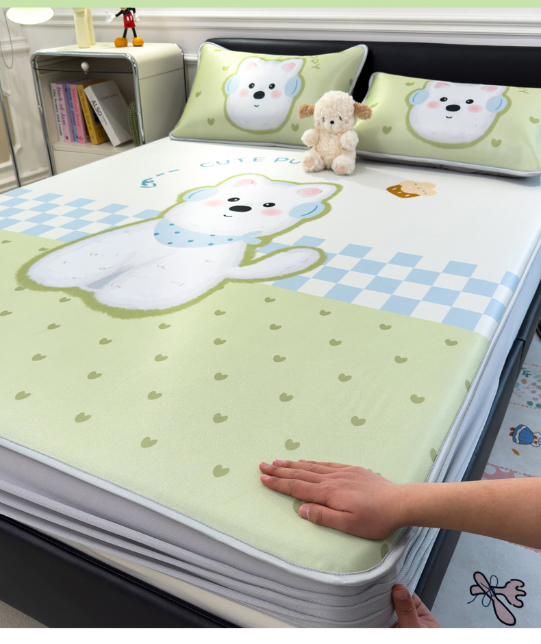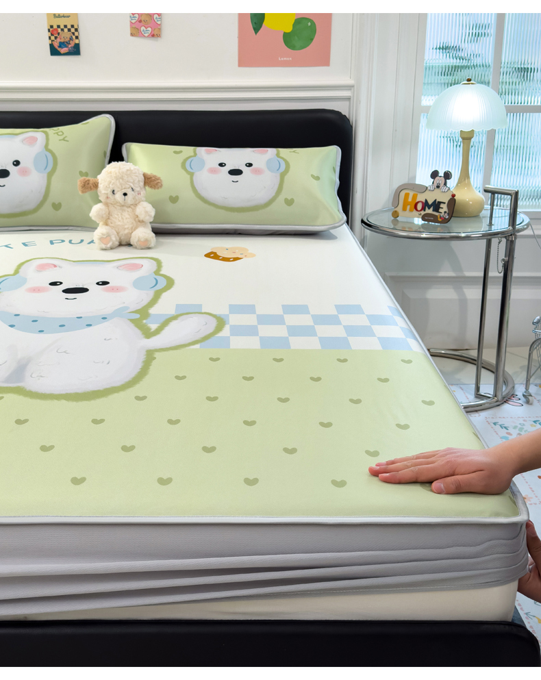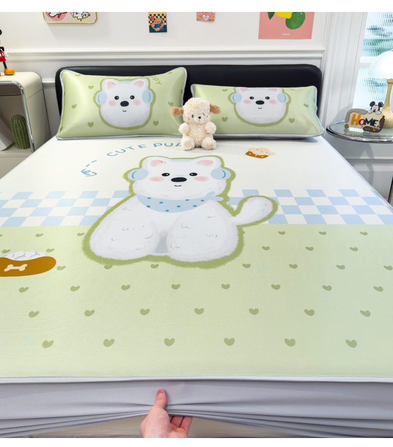 商品名称:丝羽坊 2025新款大版印花冰丝凉席冰丝席碳光冰丝凉席-床笠款 面包犬
