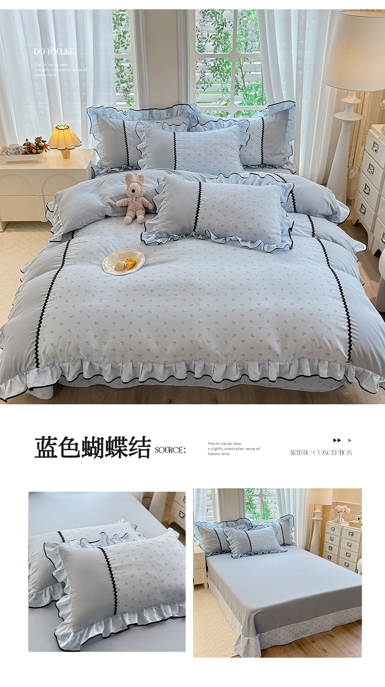 大麦家纺 2025新款韩式花边亲肤棉四件套 蓝色蝴蝶结