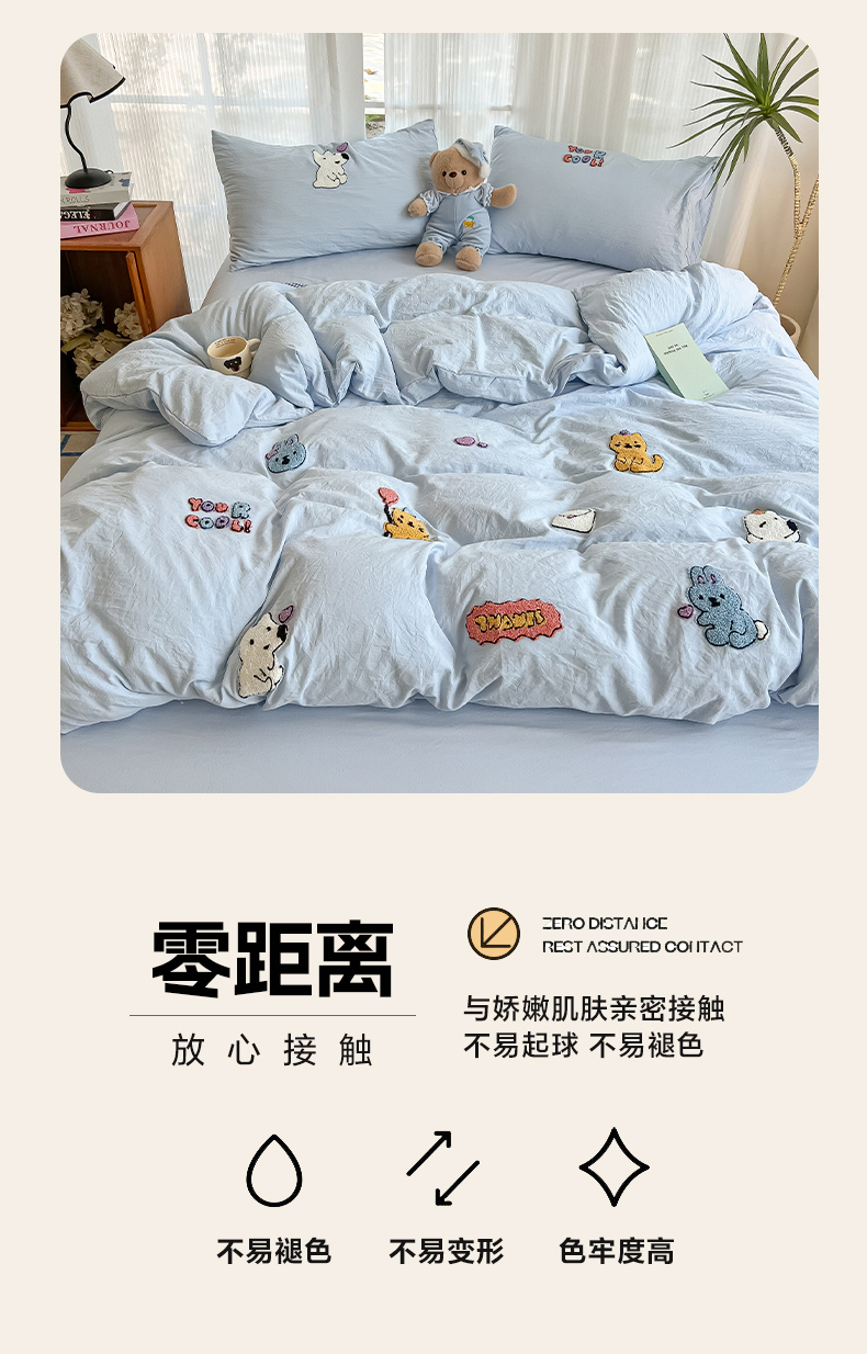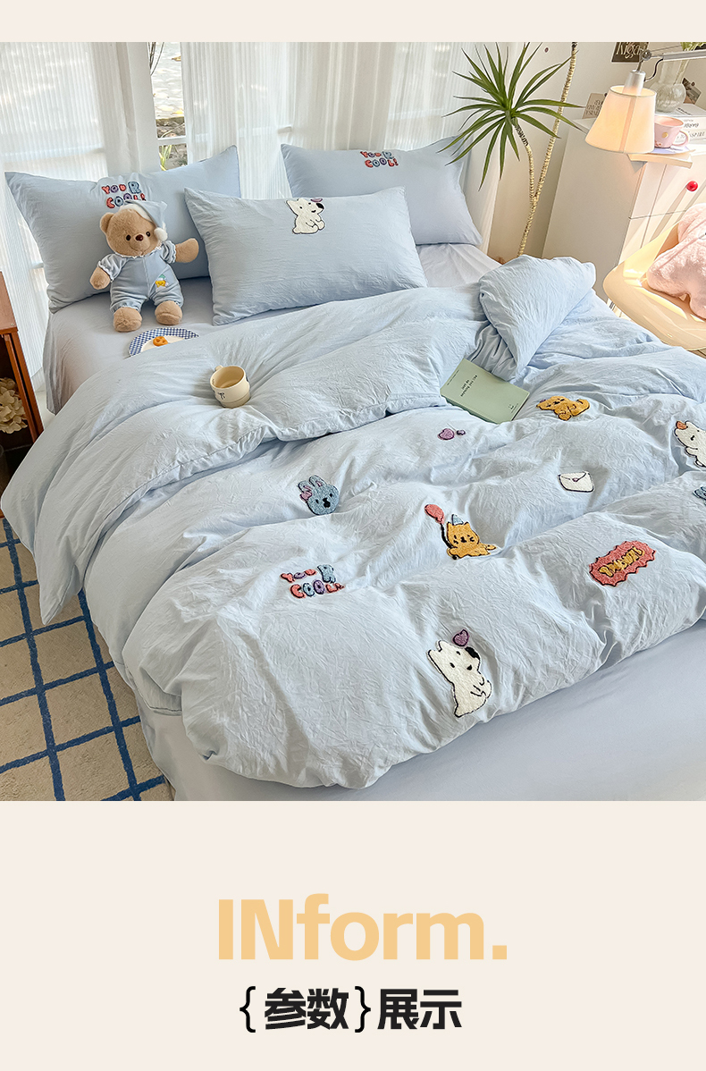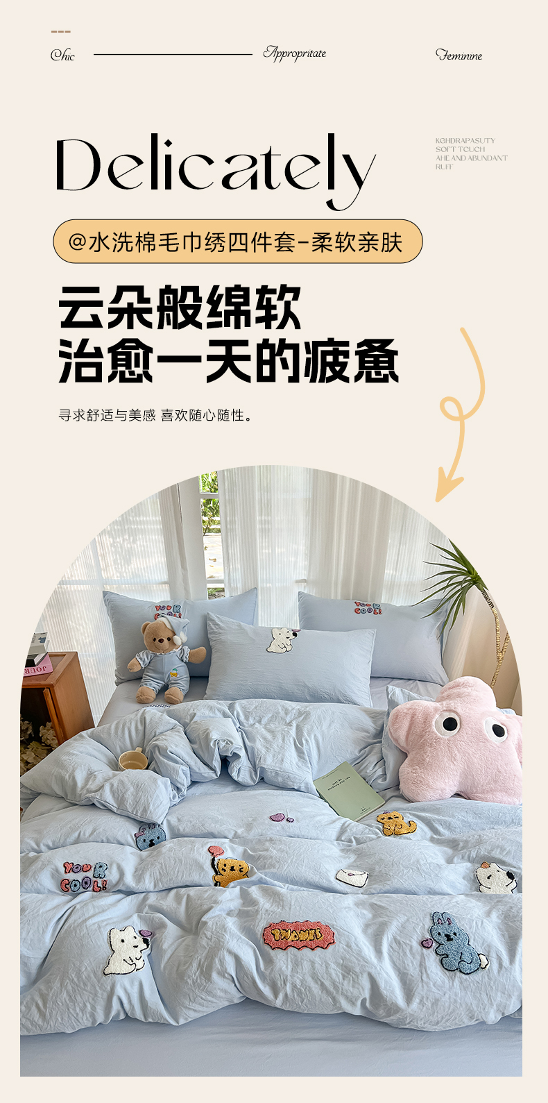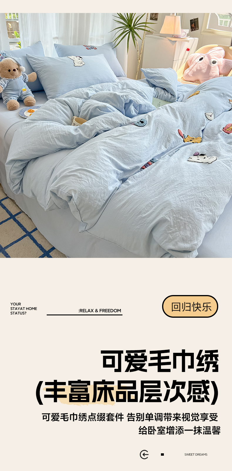 当前位置: 91家纺网 > 商品网购 > 床品套件 > 四件套 > 水洗棉四件套 > 韩巢家纺 2025新款超柔水洗棉毛巾绣四件套 动物乐园-浅蓝