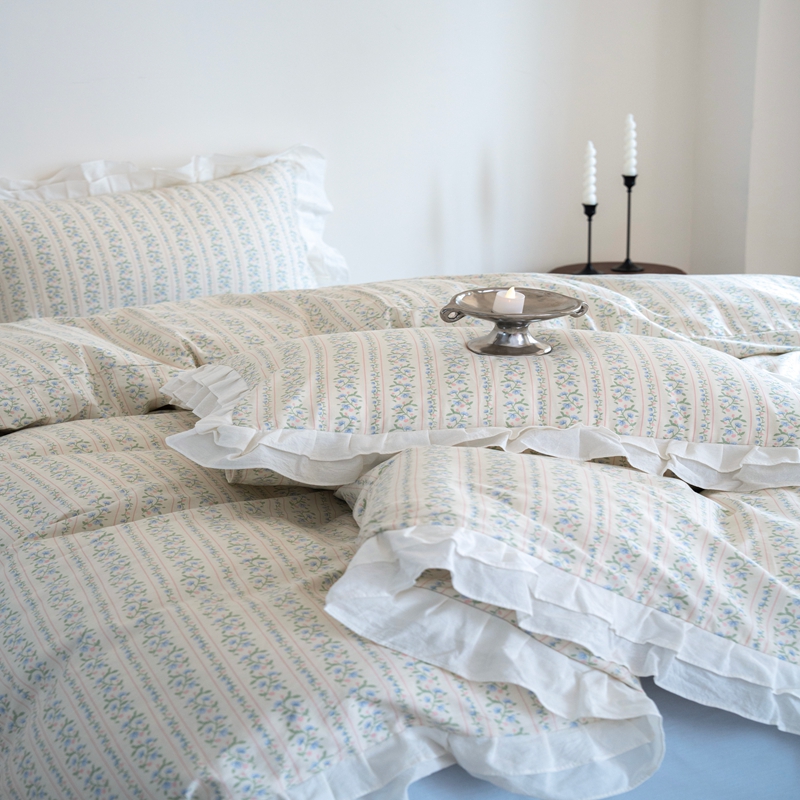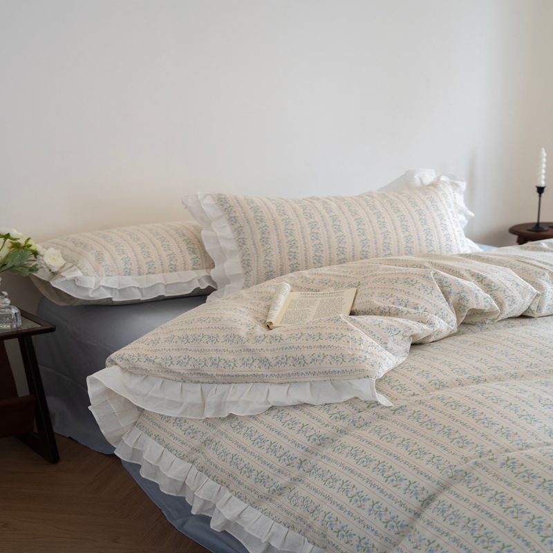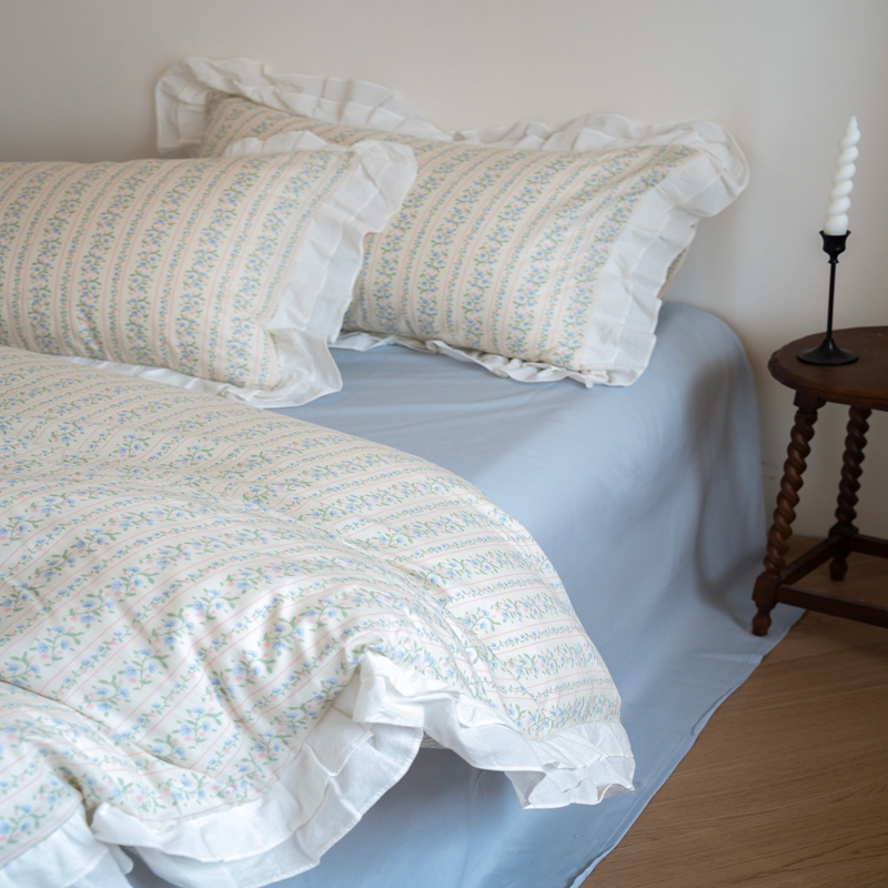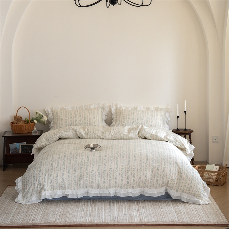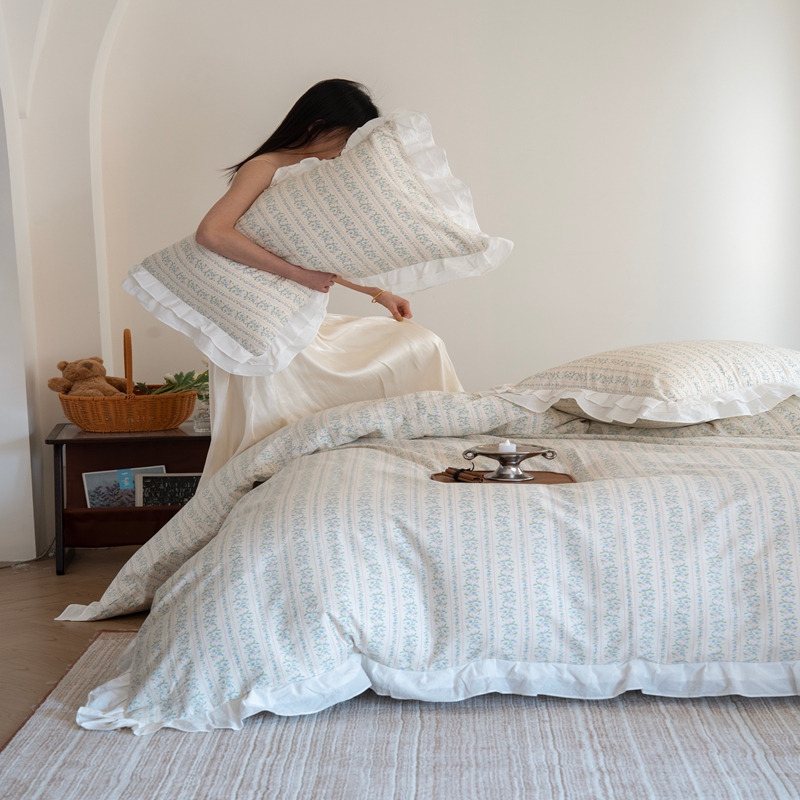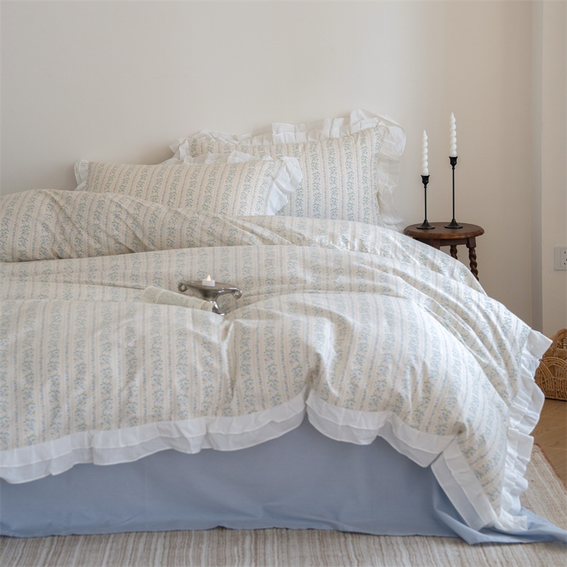 商品名称:尺素 2025新款全棉碎花韩式花边款纯棉四件套纯色加大床单1.8床笠法式大花边被套枕套 花边款知薇-浅蓝