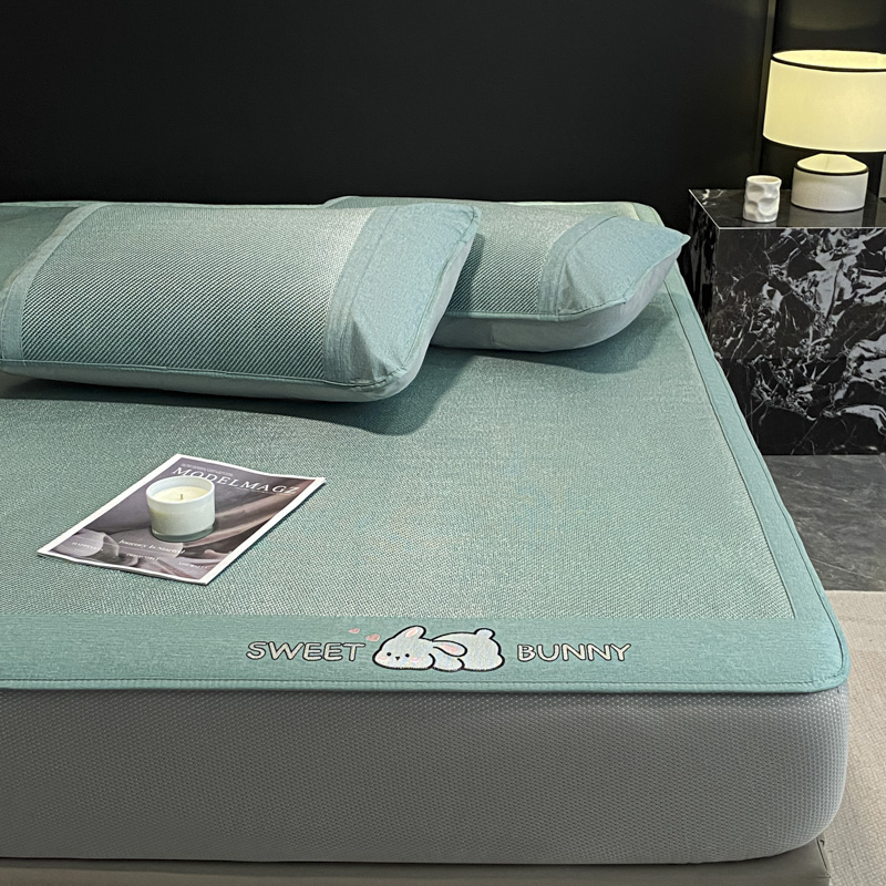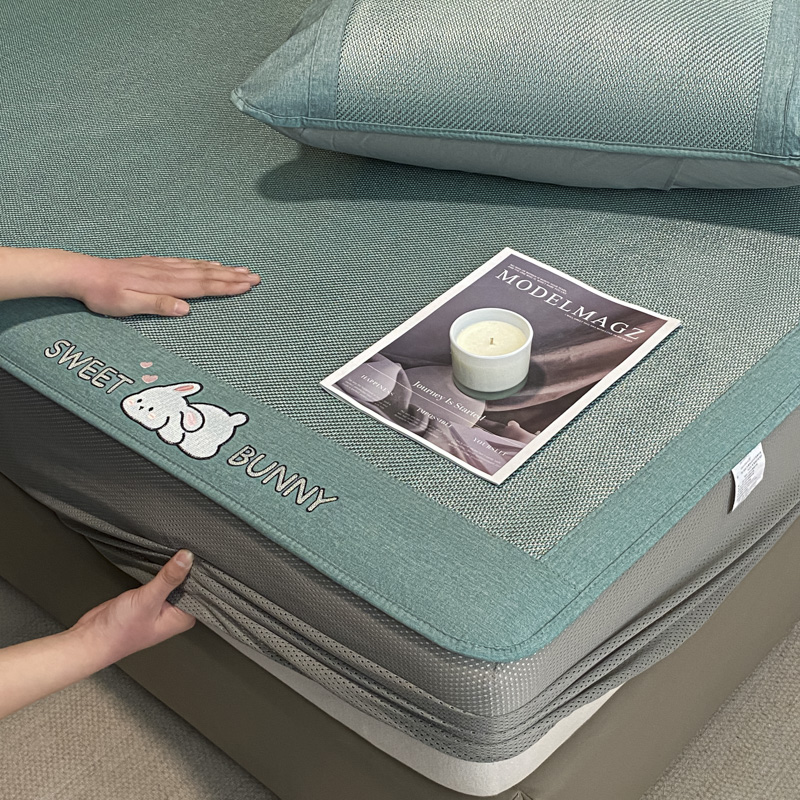 莱米家纺 2025新款加厚凉感绣花冰藤席 可爱兔—湖绿-床笠
