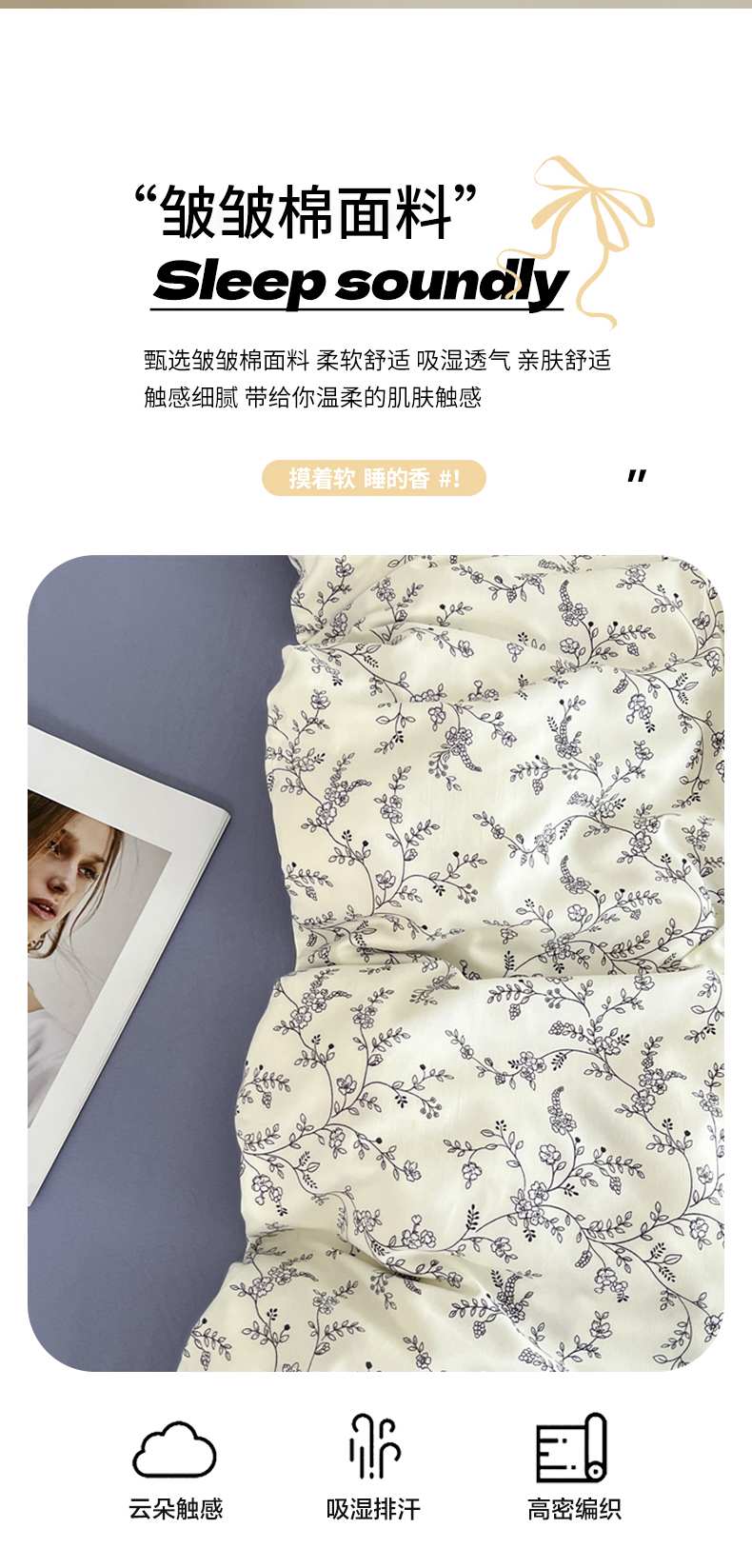 当前位置: 91家纺网 > 商品网购 > 床品套件 > 四件套 > 全棉普通四件套 > 【提供买家秀】2025直播云感皱皱棉四件套水洗棉简约风小碎花被套床笠三件套-平铺图 馥芮蓝