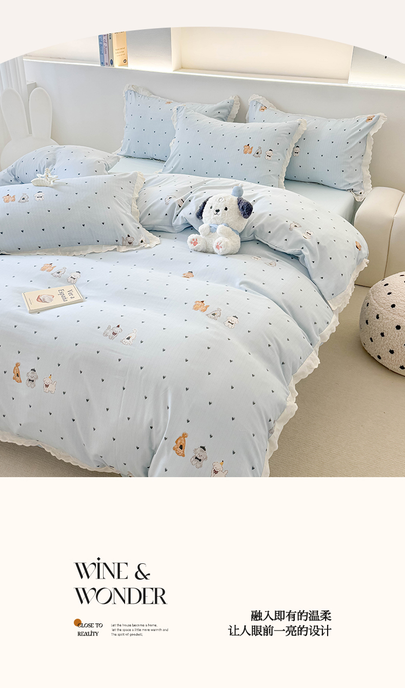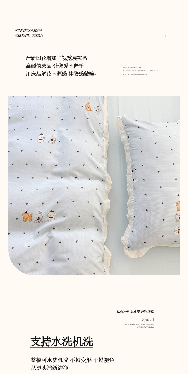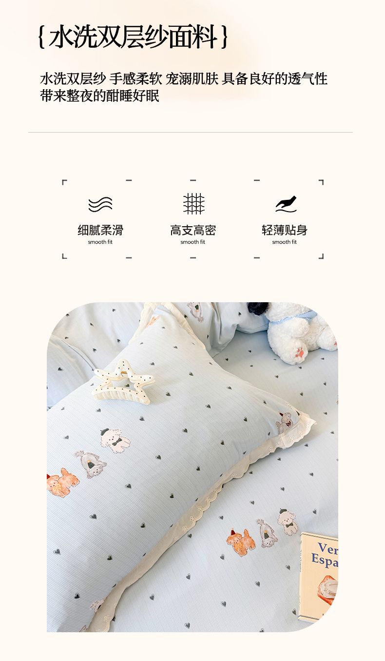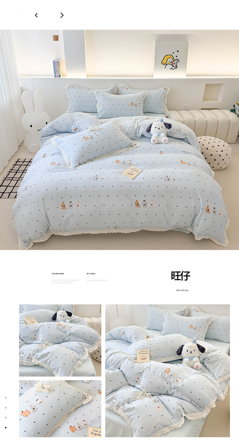 商品名称:吾欢心 2025新款韩版花边水洗双层纱四件套夏被四件套(棚拍图) 旺仔
