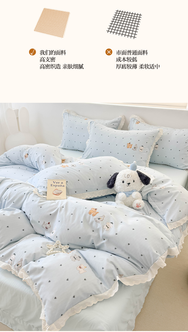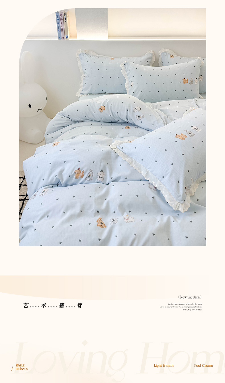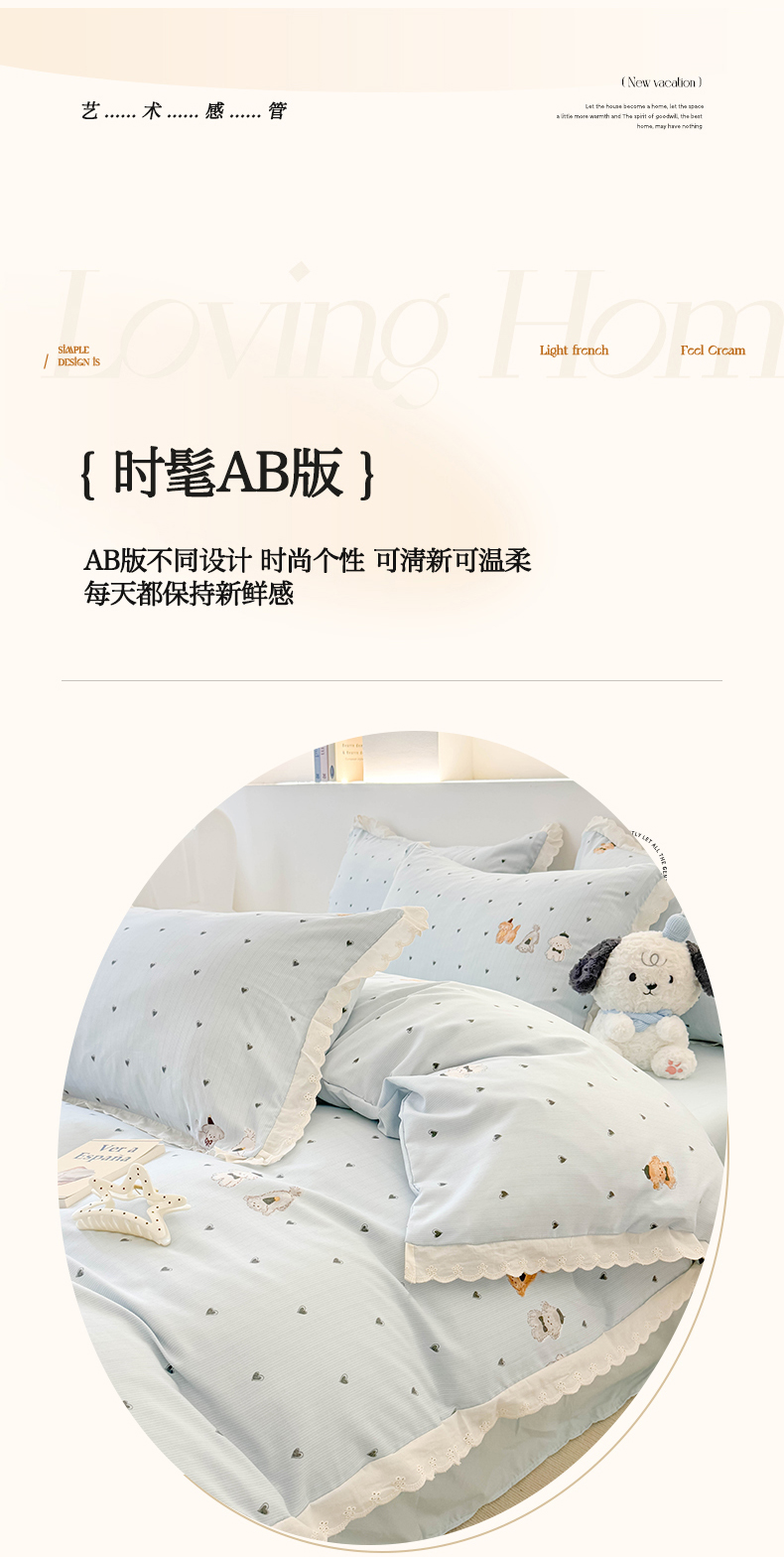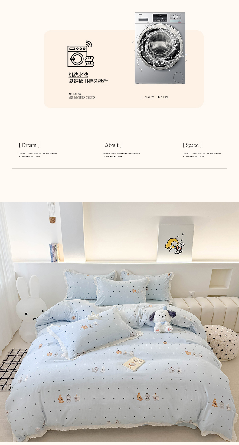 商品名称:吾欢心 2025新款韩版花边水洗双层纱四件套夏被四件套(棚拍图) 旺仔