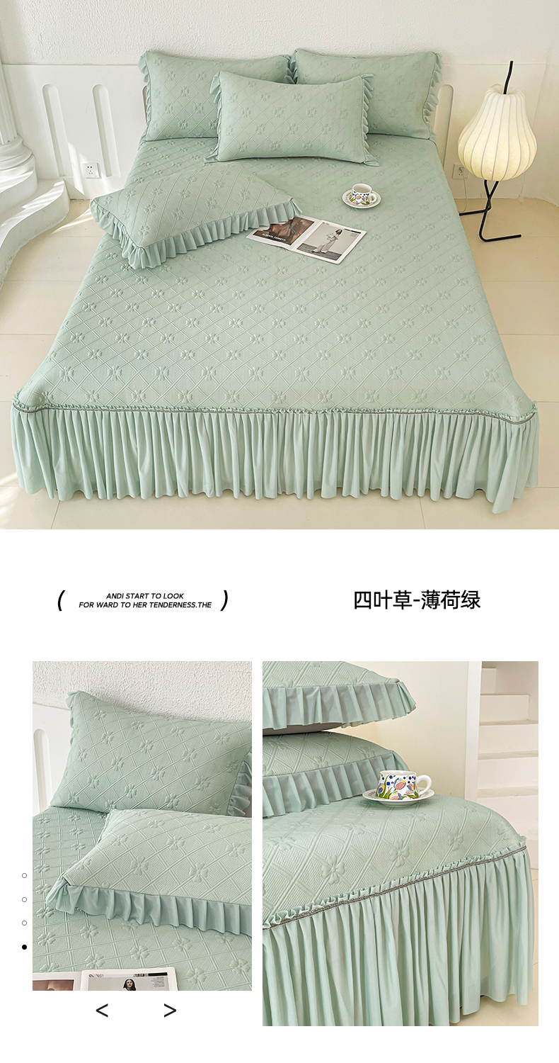 商品名称:2025新款百分百中分子凉感席 冰感床裙款凉席三件套-四叶草 薄荷绿