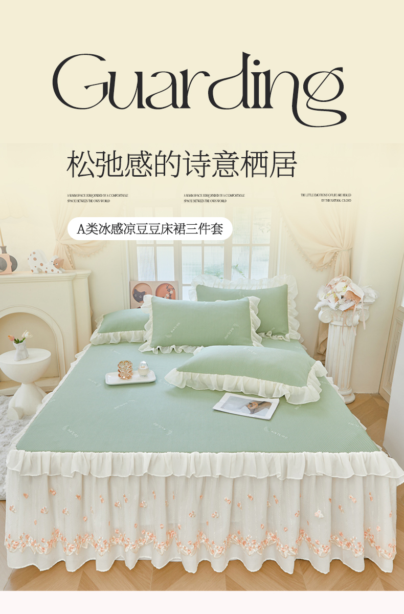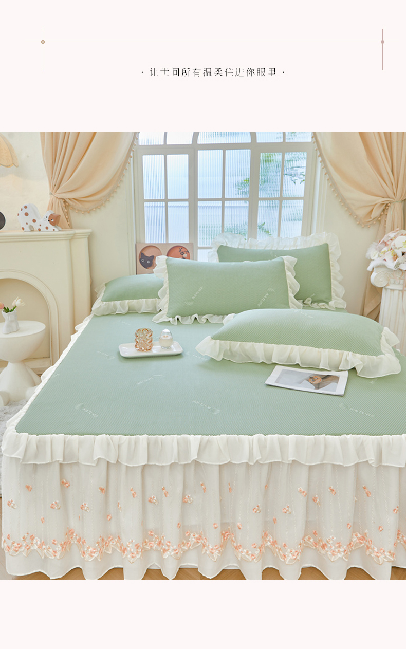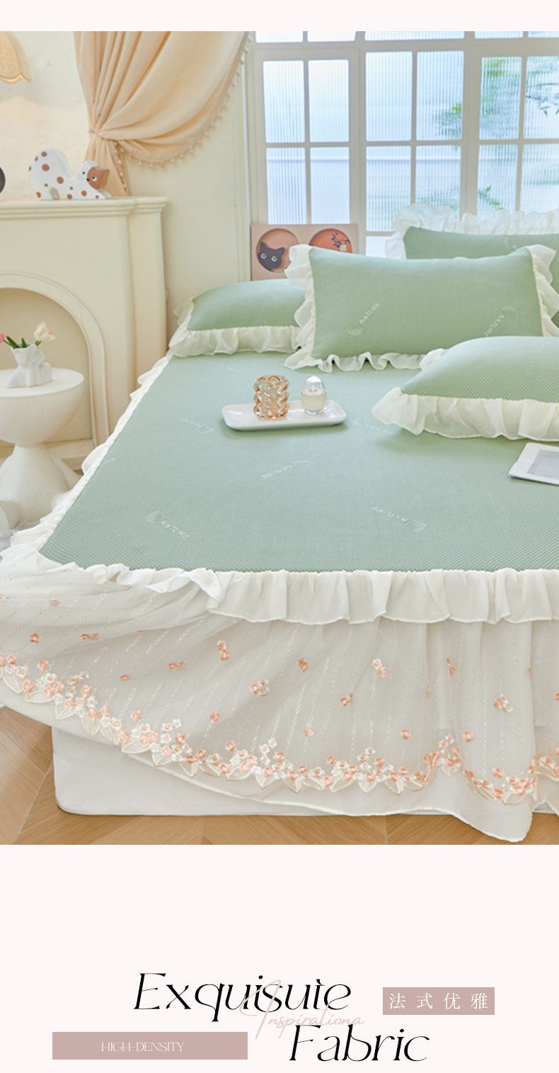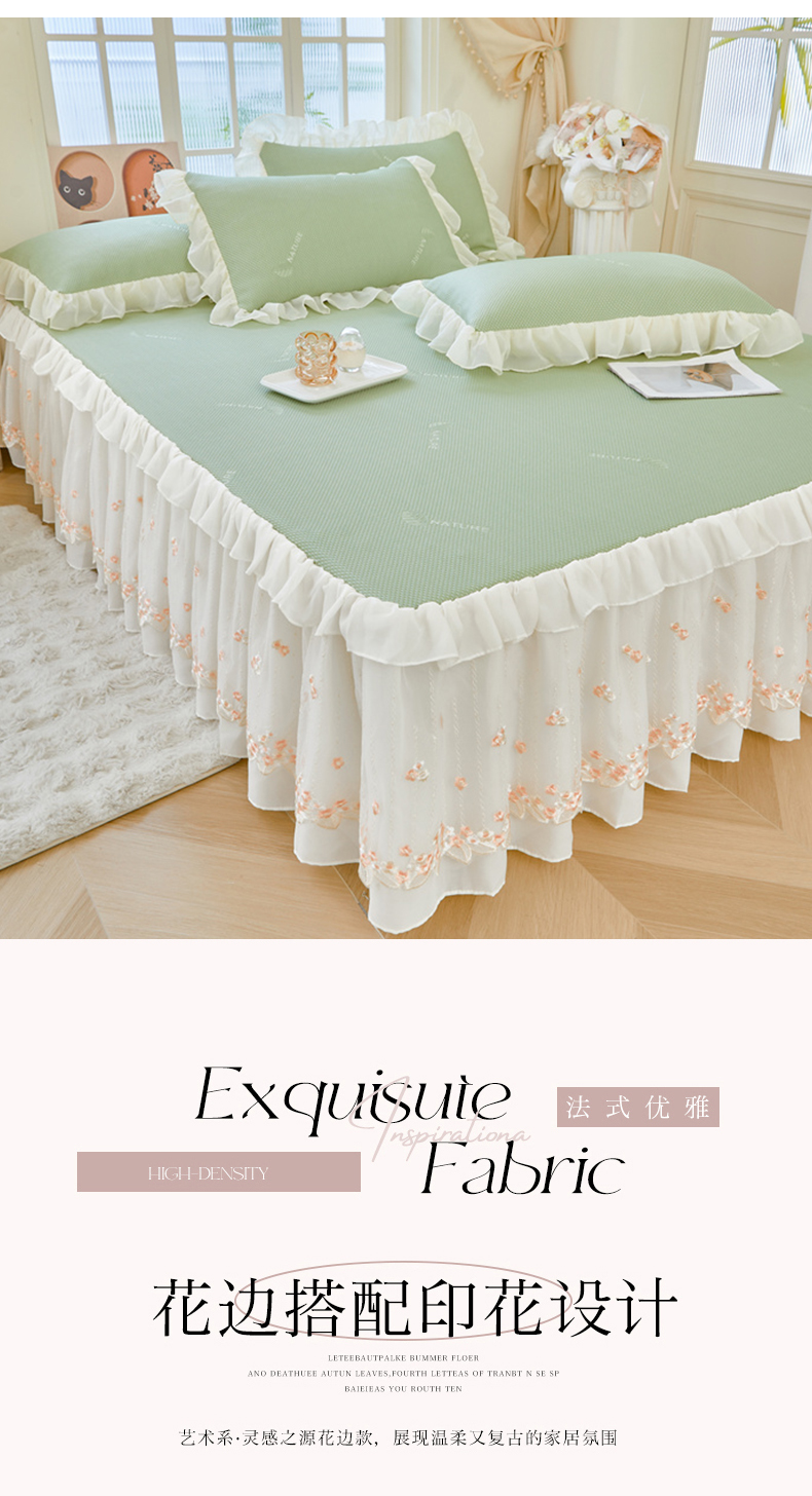 商品名称:虹星家纺 2025新款A类冰感凉豆豆床裙席三件套-素夏 素夏-抹茶绿