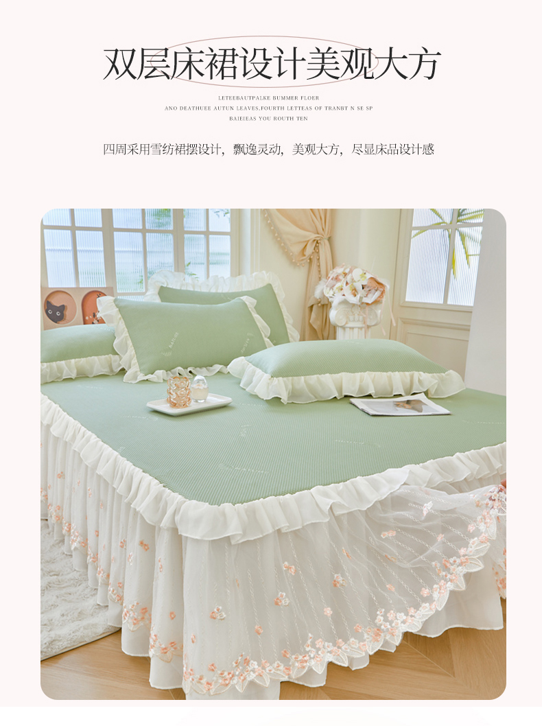 虹星家纺 2025新款A类冰感凉豆豆床裙席三件套-素夏 素夏-抹茶绿