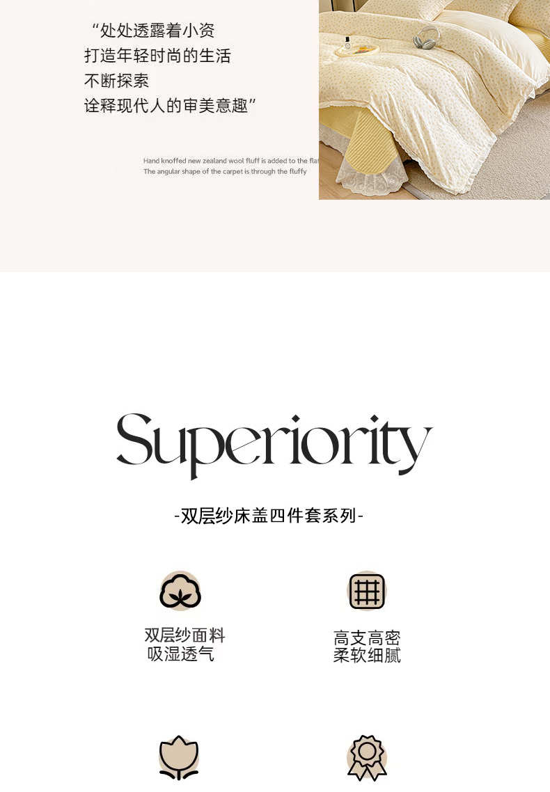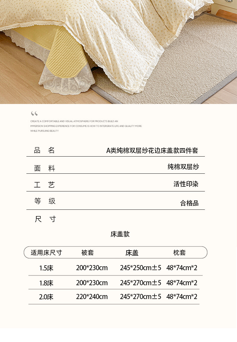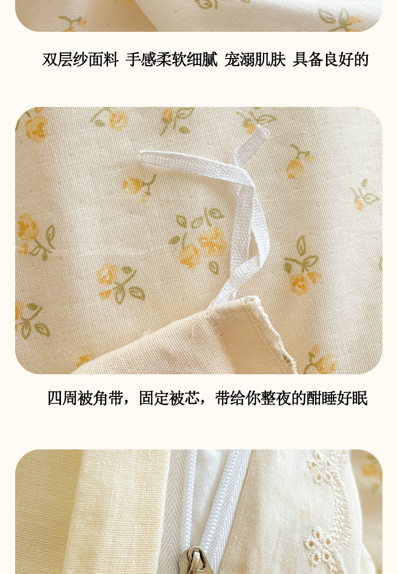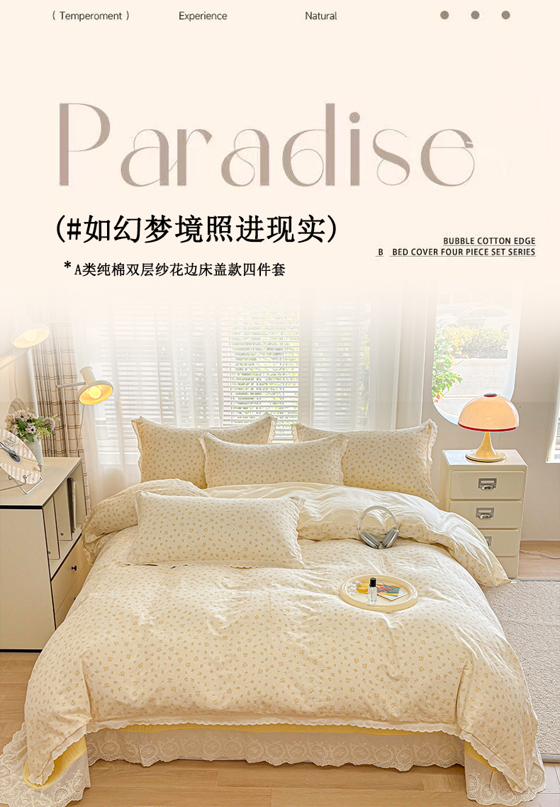商品名称:金艾草2026新款床盖款A类纯棉双层纱花边四件套 奶油黄-小花