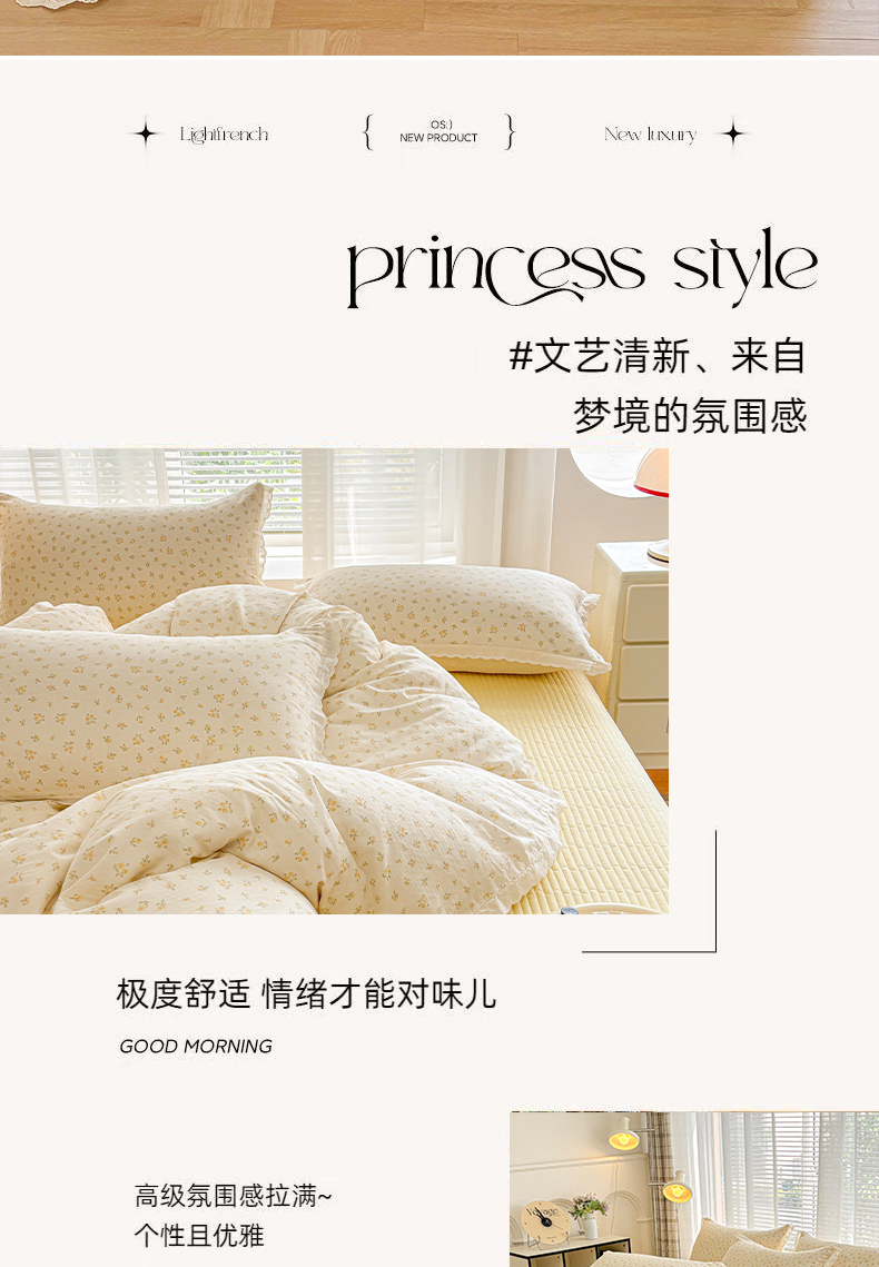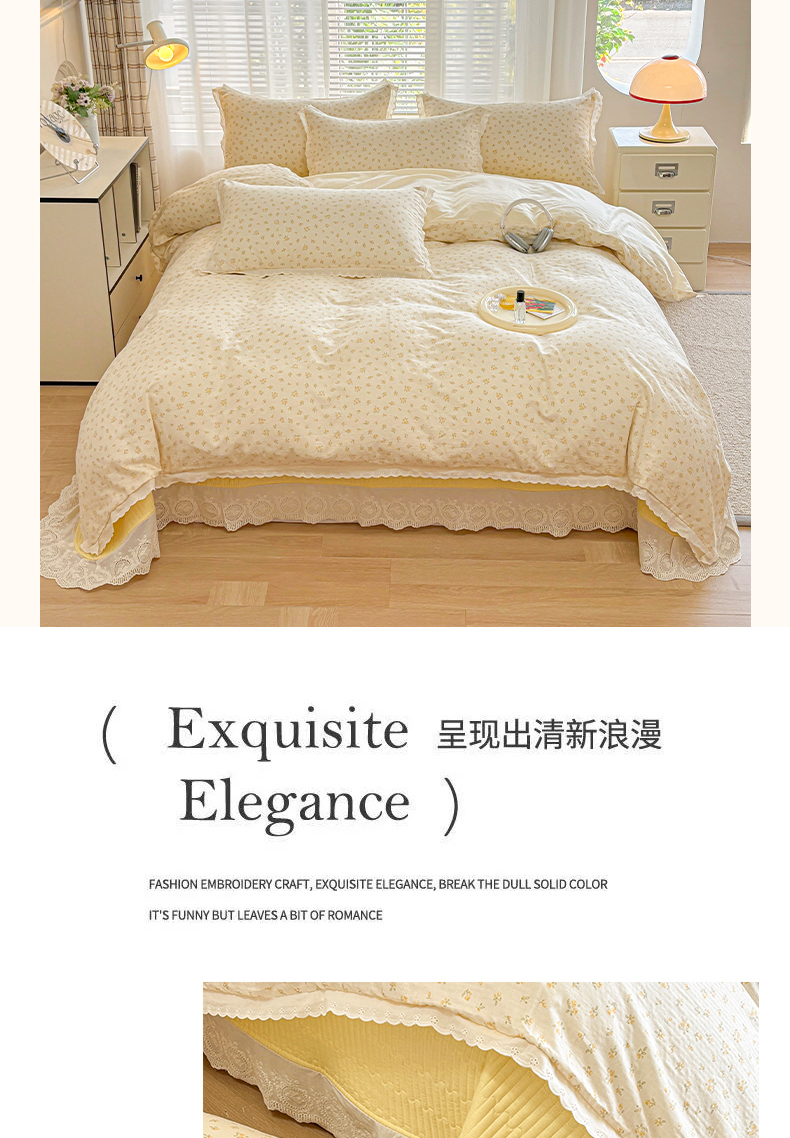 金艾草2026新款床盖款A类纯棉双层纱花边四件套 奶油黄-小花