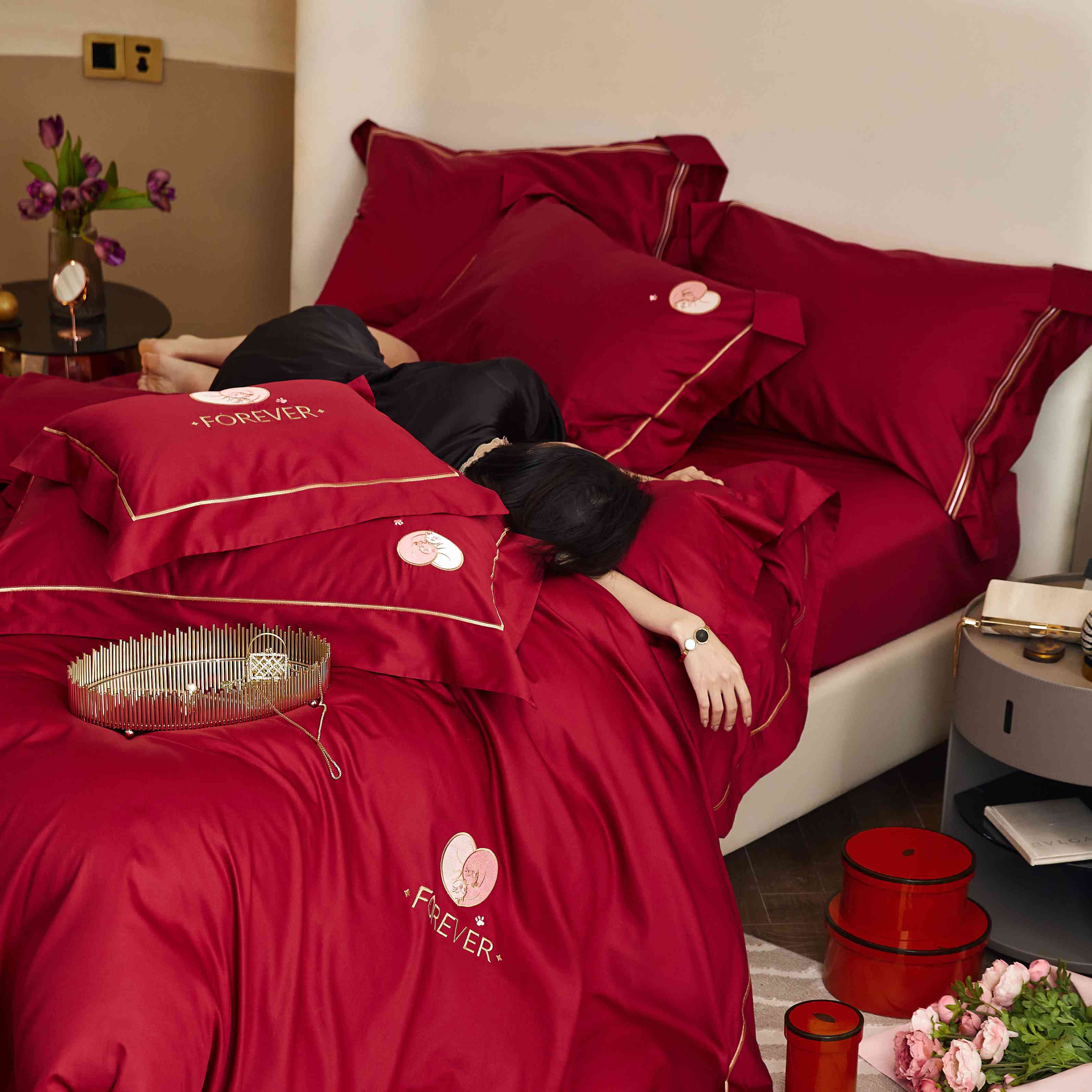 (总)涞澳家纺 2026新款全棉纯棉色织提花(婚庆)四件套,赤韵花影,绯花简语,吉庆红韵,轻红漫花,朱砂暖眠