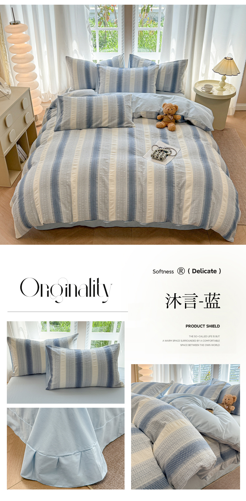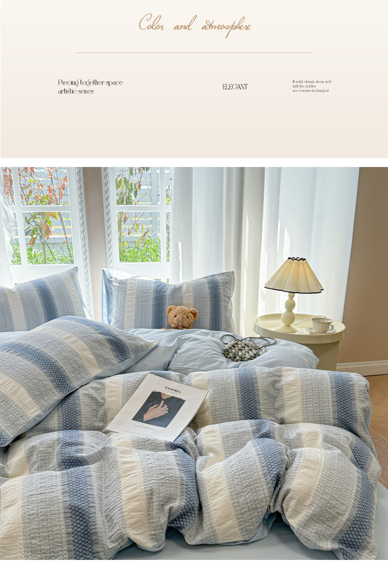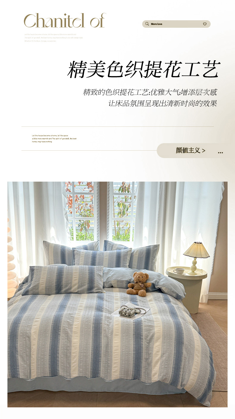 当前位置: 91家纺网 > 商品网购 > 床品套件 > 四件套 > 全棉普通四件套 > 米可2025春夏新款A类色织华夫格提花全棉四件套 沐言-蓝