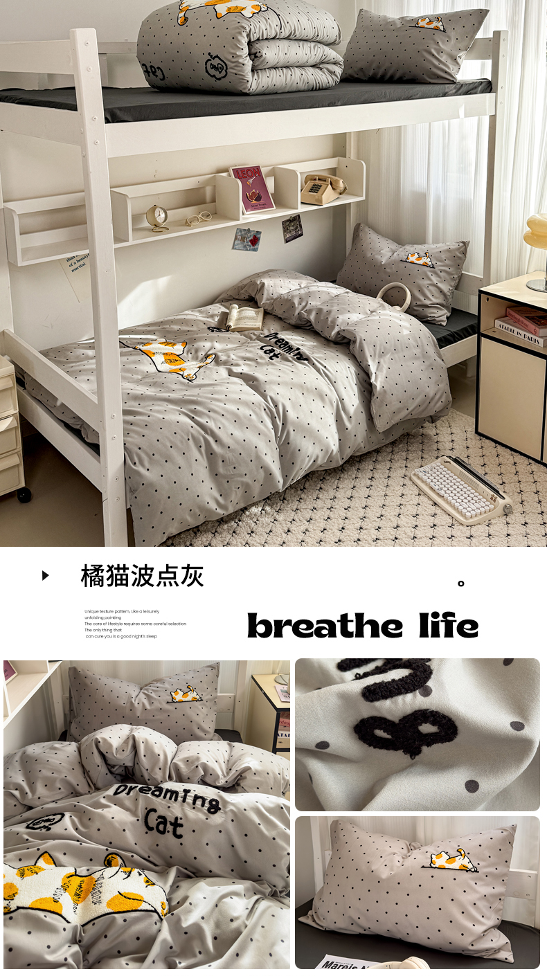 当前位置: 91家纺网 > 商品网购 > 床品套件 > 四件套 > 磨毛活性四件套 > 2025新款 985学姐推荐新款学生季宿舍可爱水洗棉毛巾绣四件套 橘猫波点灰