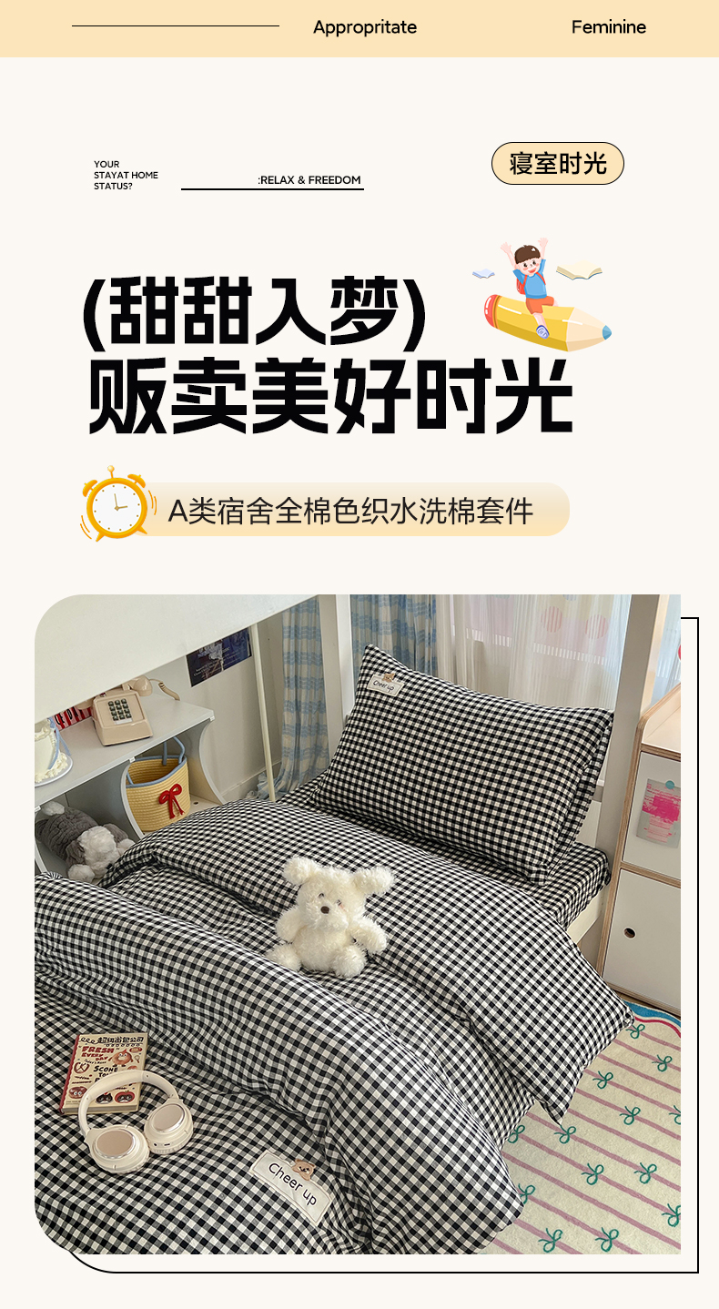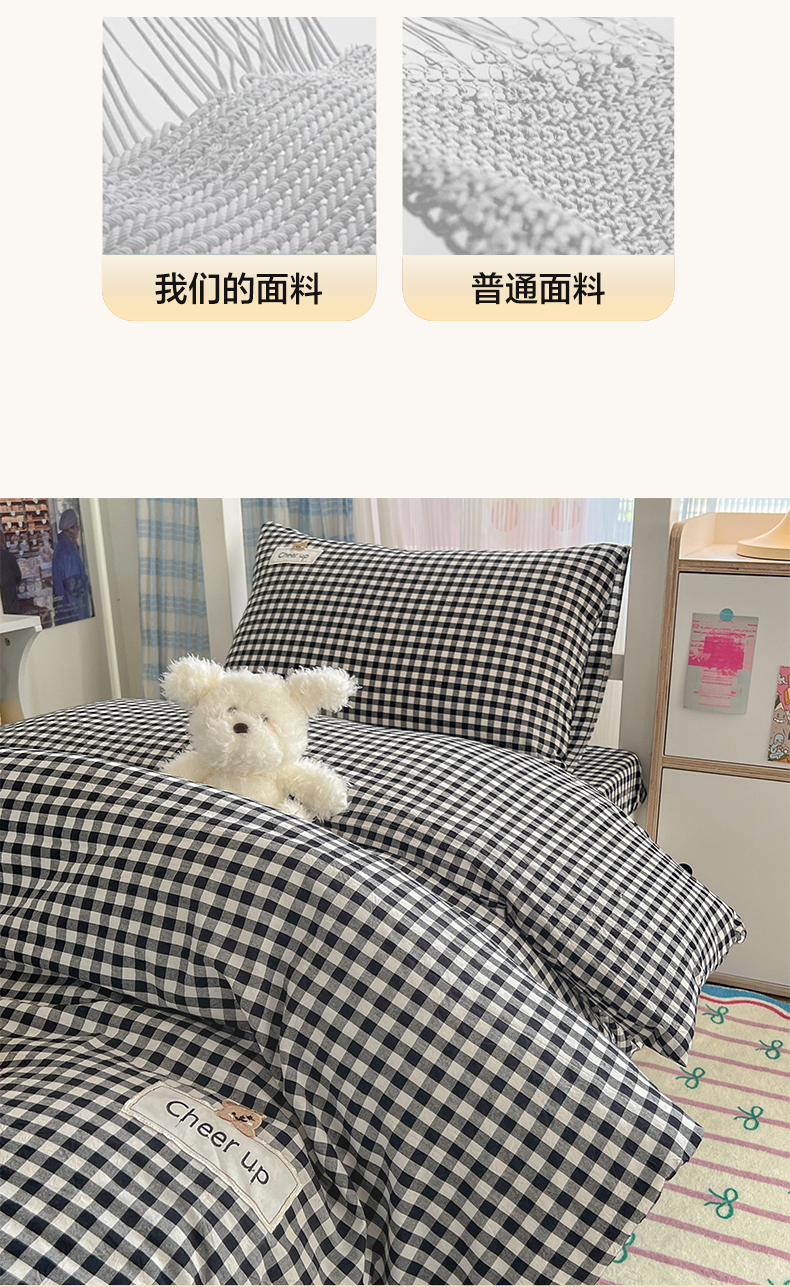 • 91家纺网 家纺一手货源 找家纺 佳笠家居 2025新款kimi熊系列A类宿舍全棉纯棉色织水洗棉床笠单床笠床笠单件 黑白格