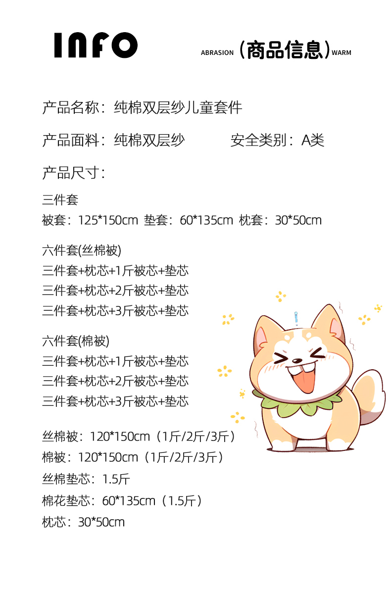 儿童六件套丝棉被 三件套+枕芯+1斤 被芯+ 垫芯 | ¥135.00 |
