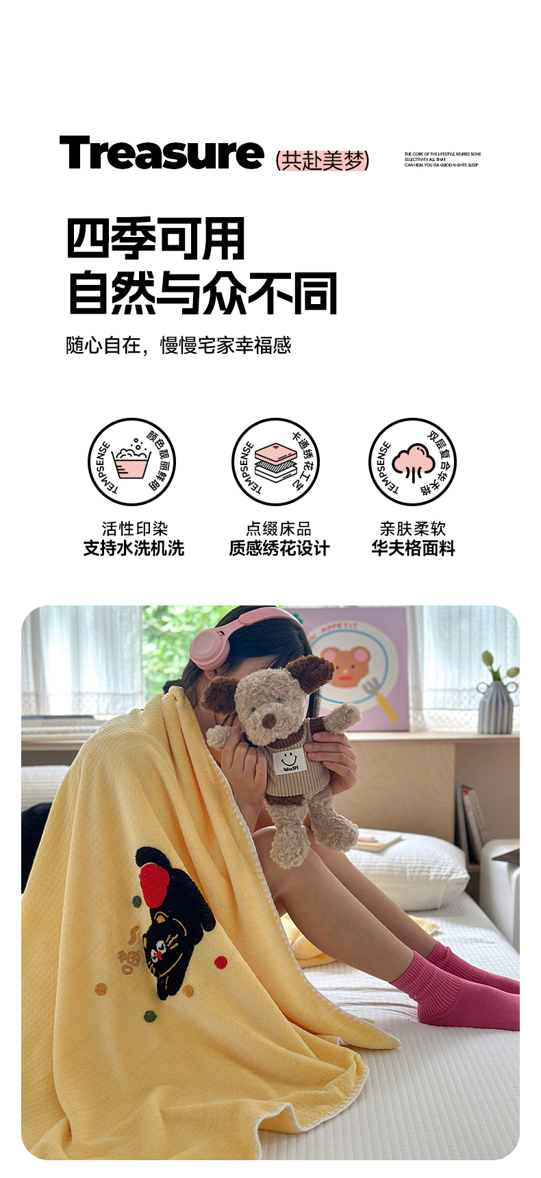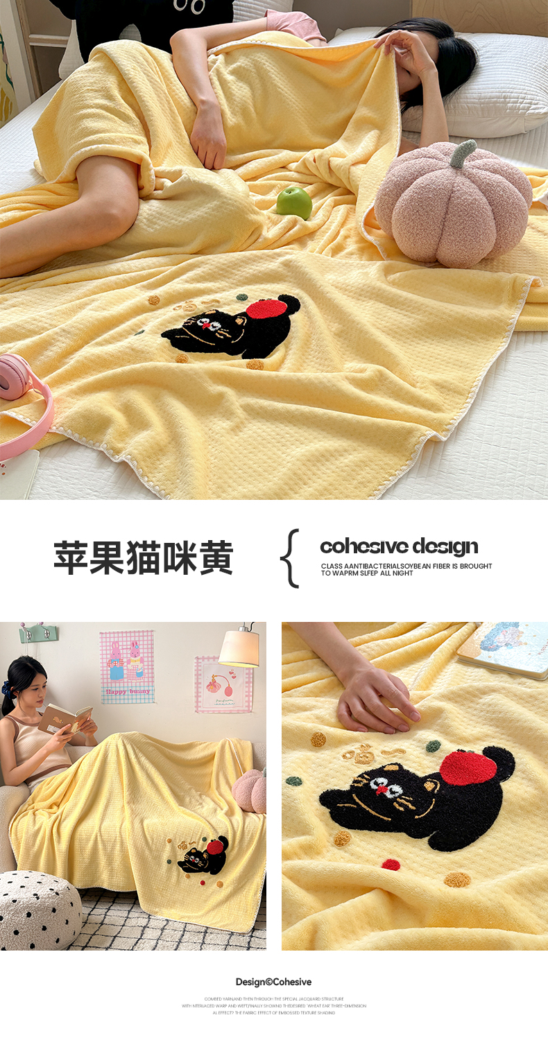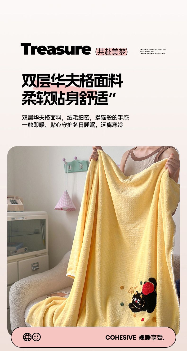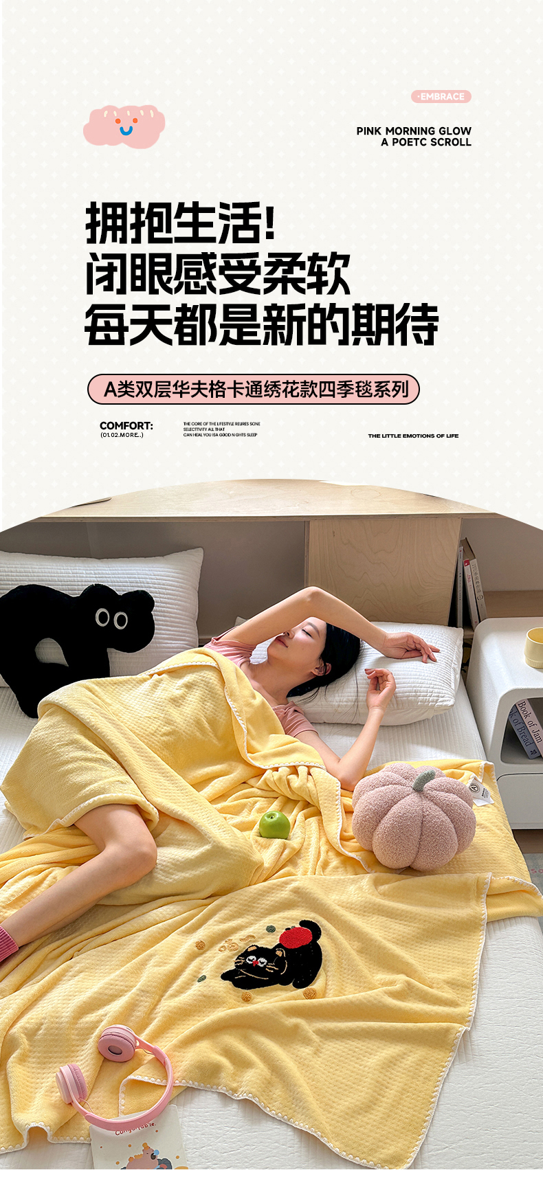 商品名称:艾佳2025新款卡通绣花款小华夫格毛毯毯子 华夫毯-苹果猫咪黄