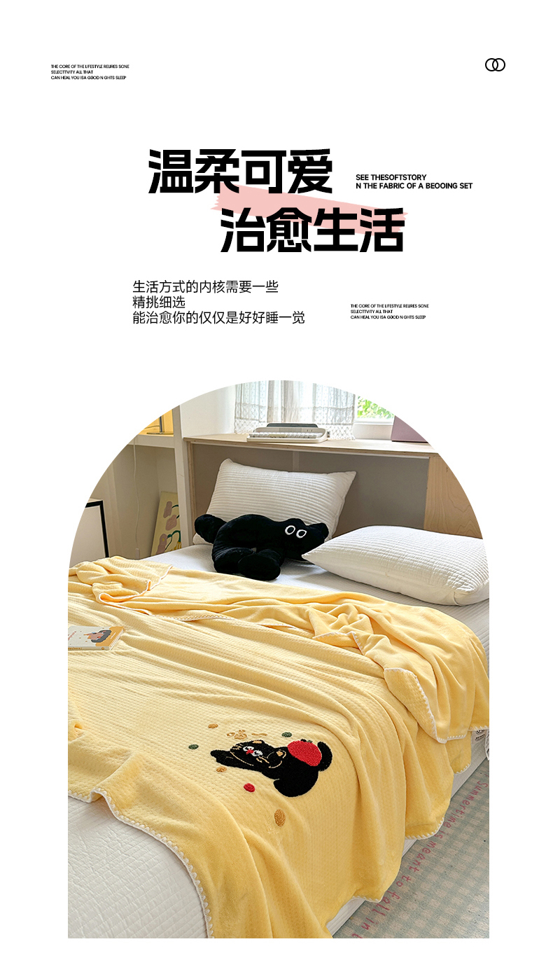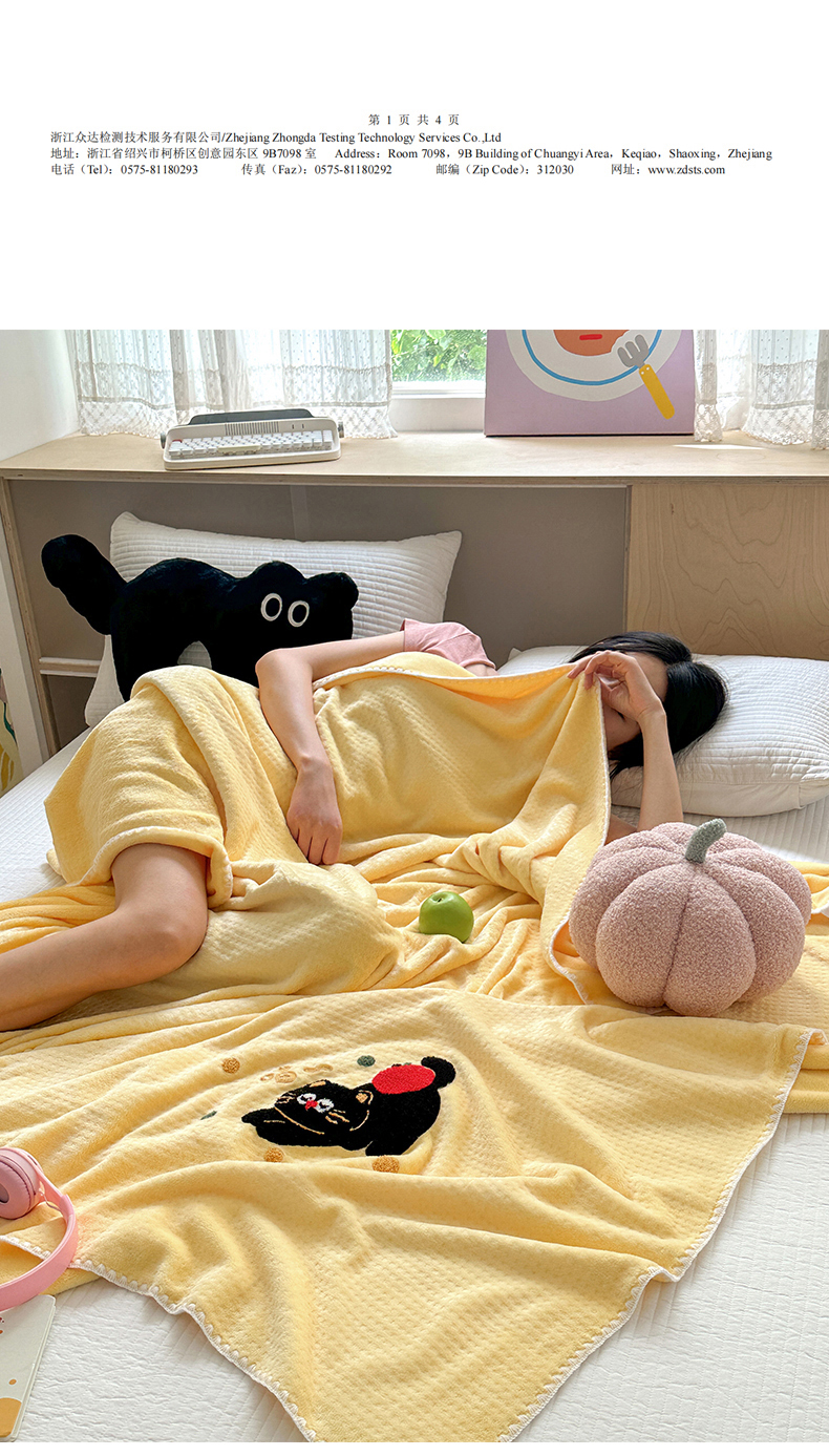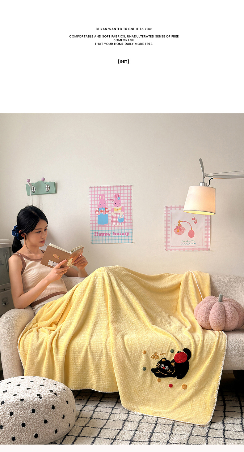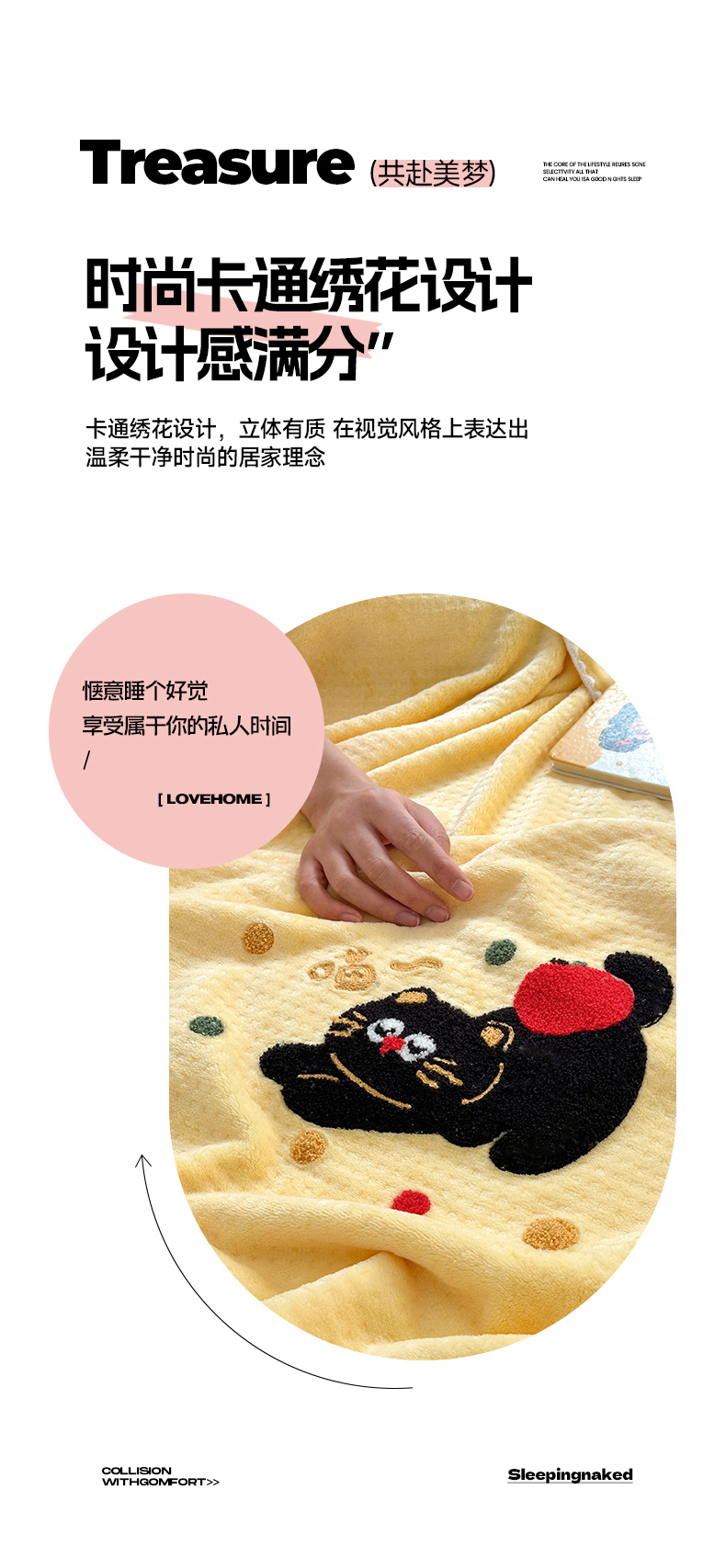 商品名称:艾佳2025新款卡通绣花款小华夫格毛毯毯子 华夫毯-苹果猫咪黄