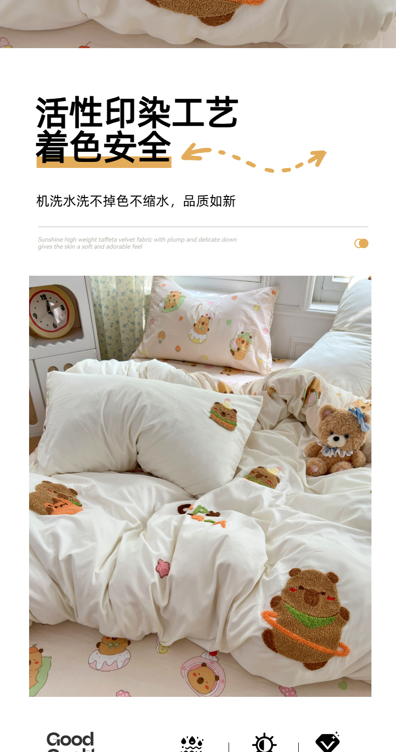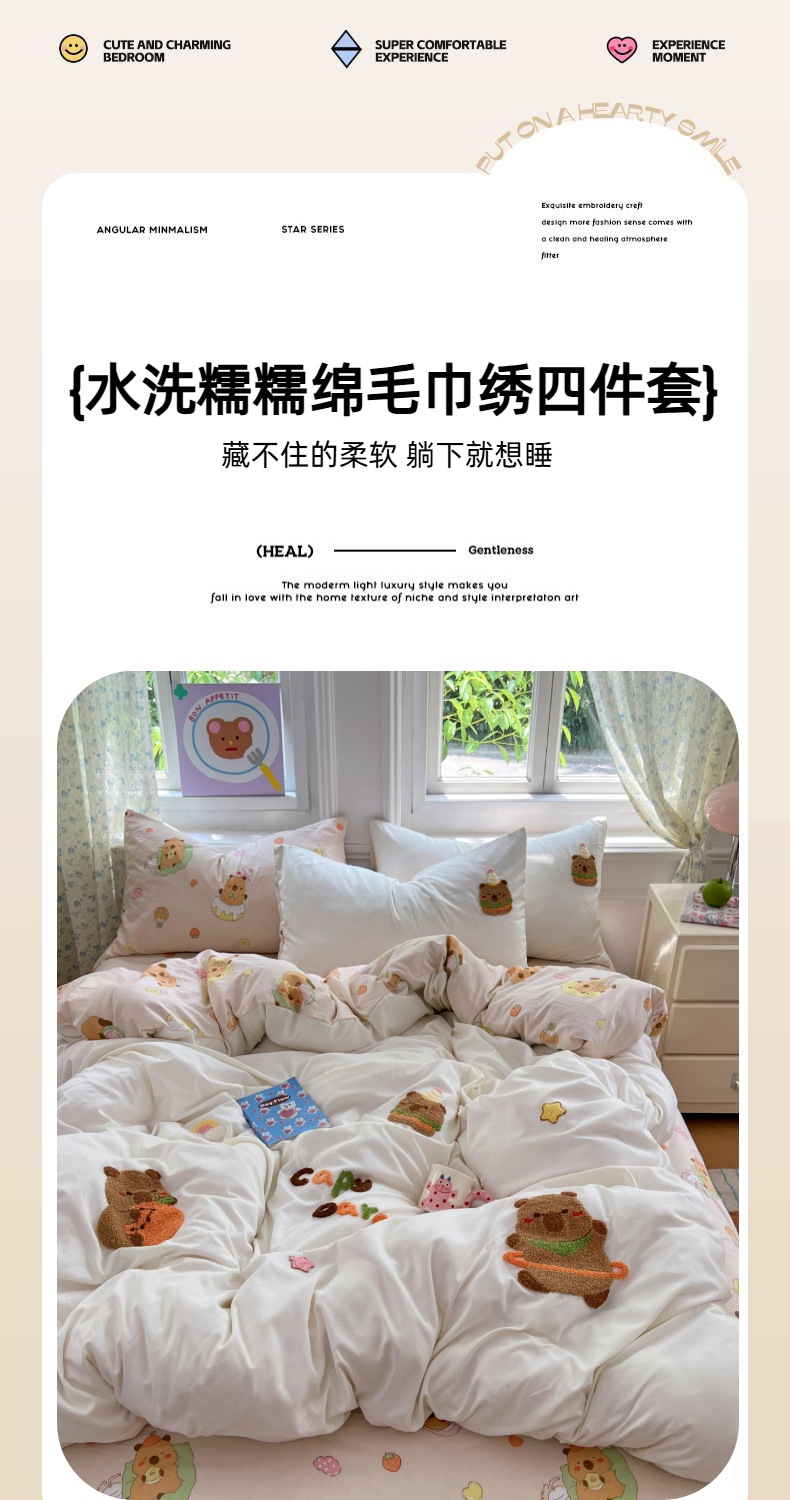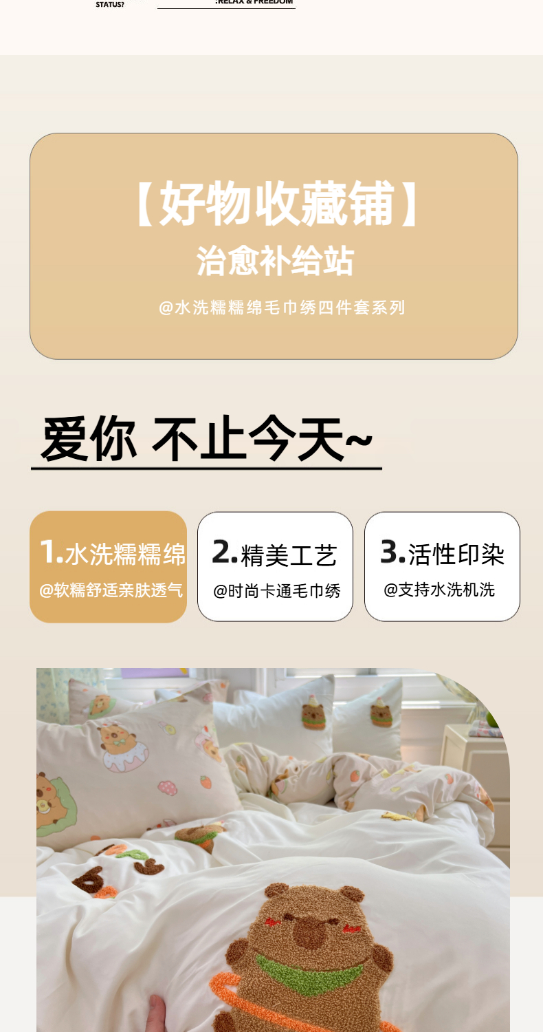 当前位置: 91家纺网 > 商品网购 > 床品套件 > 四件套 > 毛巾绣四件套 > 优尚佳生活馆 2025新款水洗棉印花毛巾绣四件套【提供买家秀】 卡皮巴拉