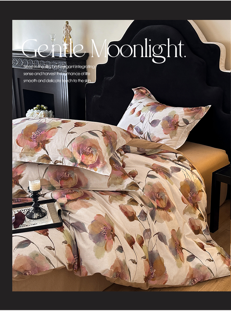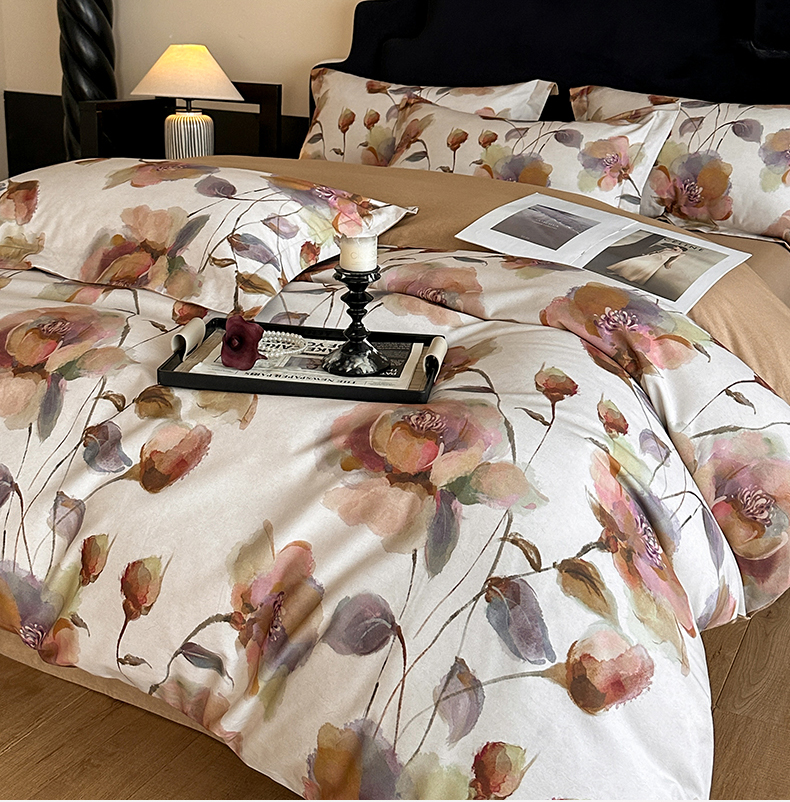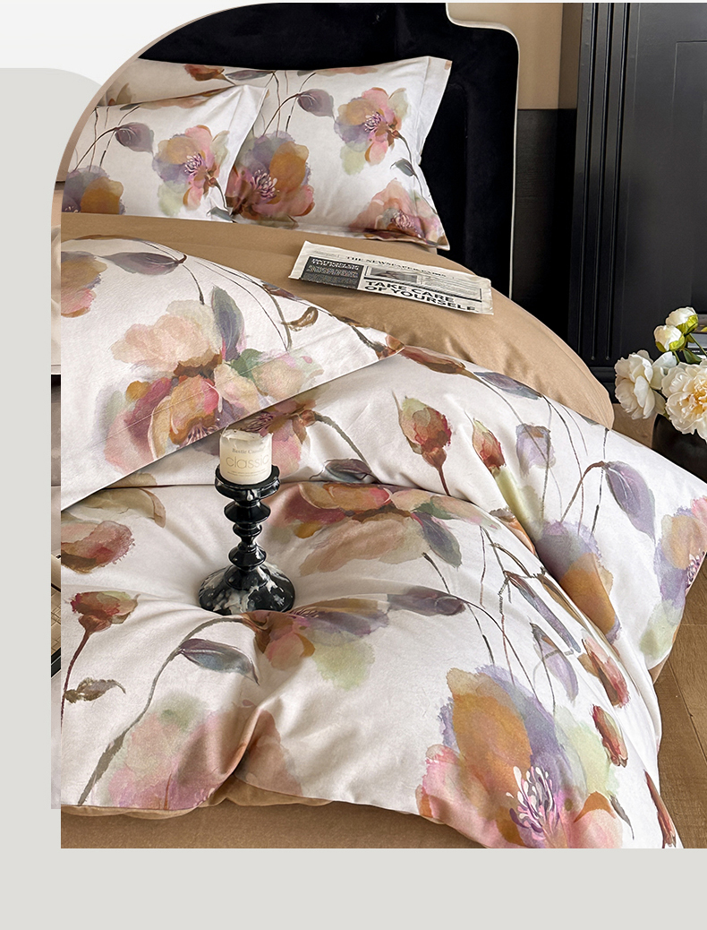 羚羊语家纺 2025新款A类全棉生态磨毛100棉数码印花四件套活性磨毛轻奢美拉德系简约花卉床单床笠三件套 浮光跃