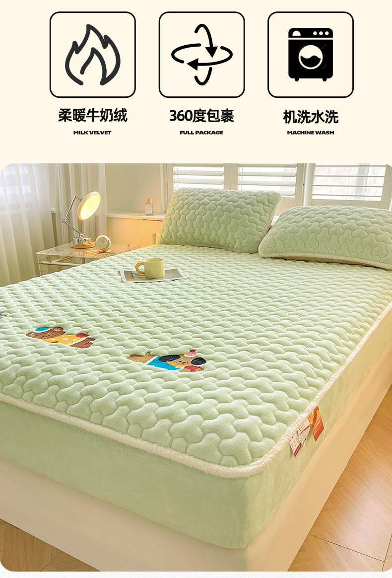 (总)雯豆家纺 2025新款刺绣牛奶绒夹棉床笠绣花款卡通床笠三件套