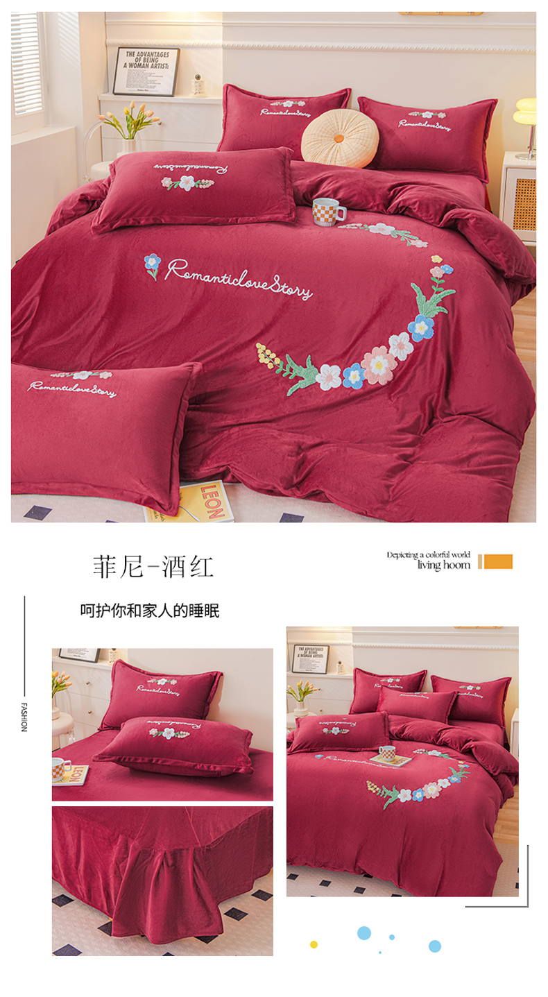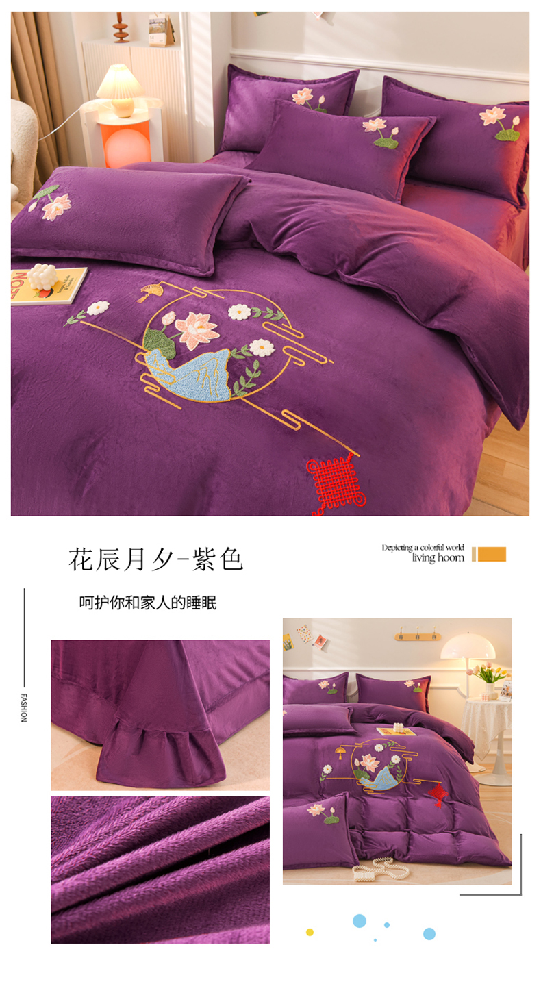 (总)2025新款保暖水晶绒床裙款四件套,紫色,浅豆沙,玫红,深豆沙,酒红,大红,深紫,灰色,蓝色,粉玉,果绿色,橘色,米色,驼色,雾蓝色