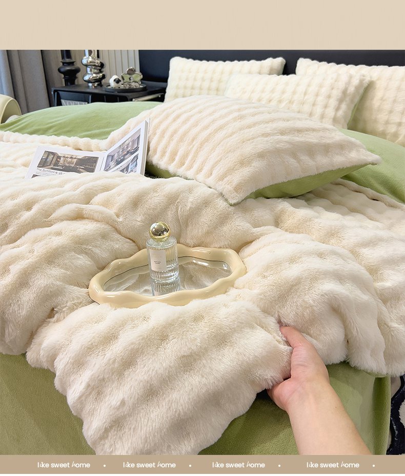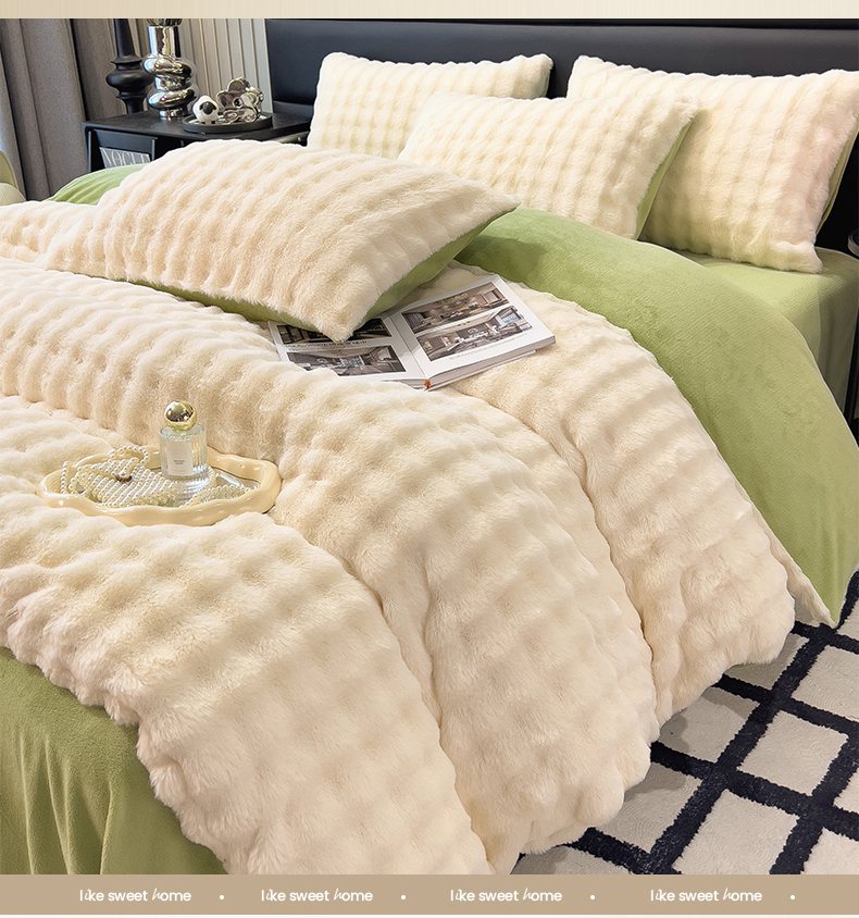 商品名称:摩妮卡 2025新款加厚大泡泡兔毛牛奶绒四件套 暖白+暗苔绿