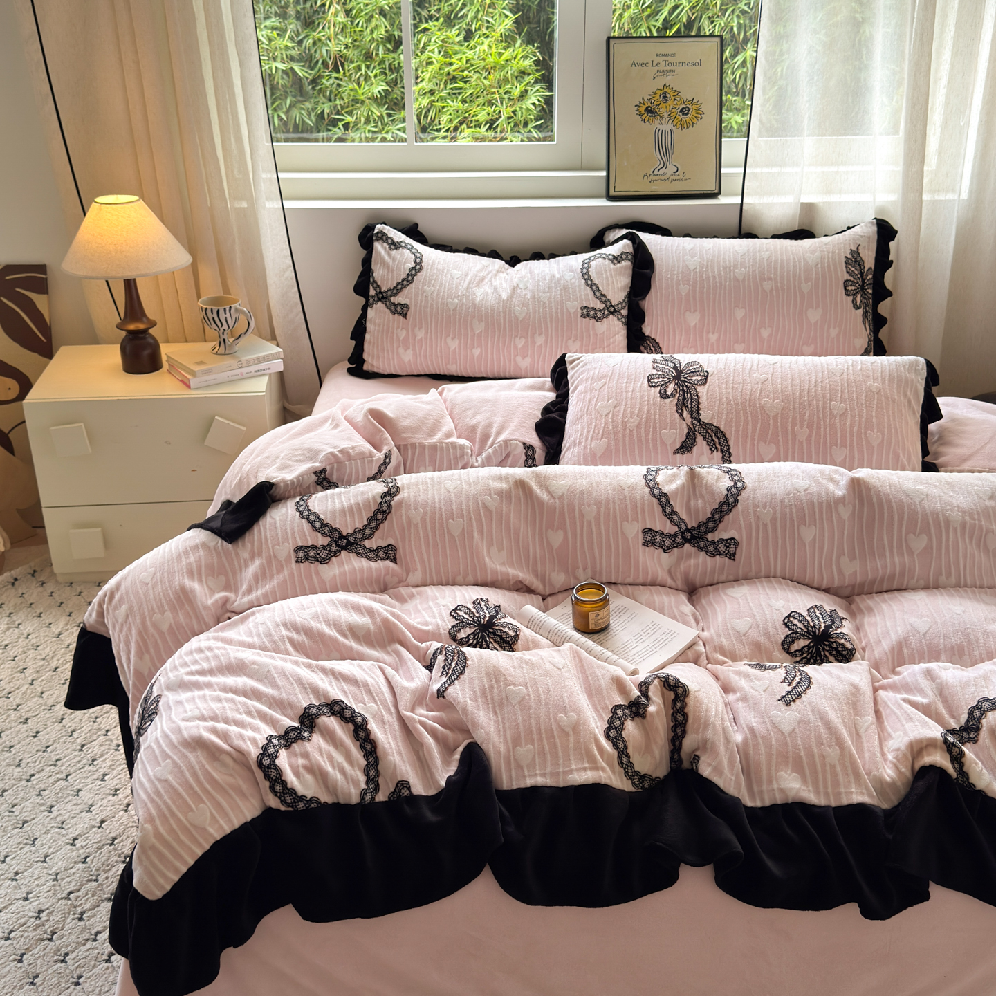 (总)德比尔斯 2025新款高克重赫本风黑色花边牛奶绒四件套,爱意满满,奥莱迪,朵拉粉