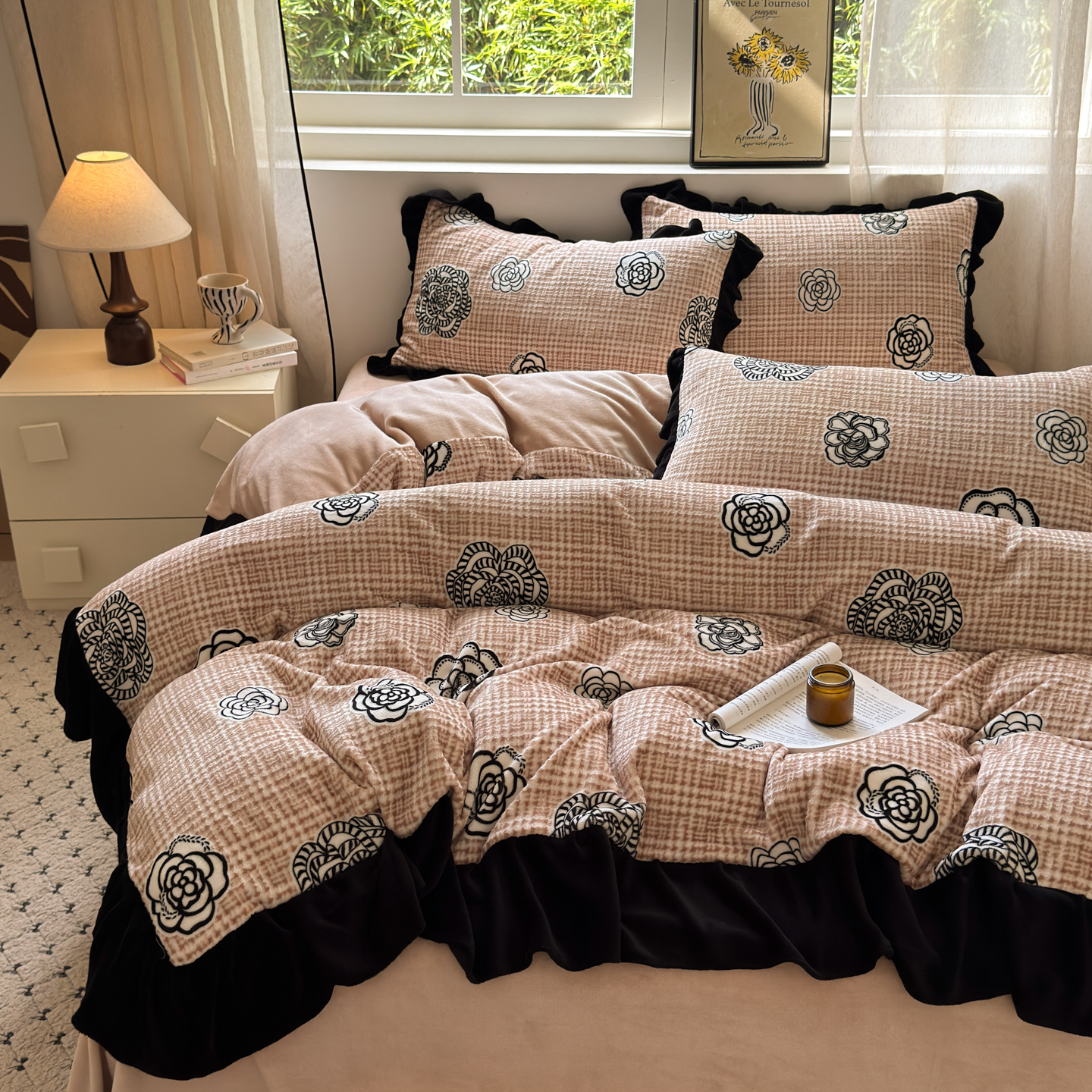 德比尔斯 2025新款高克重赫本风黑色花边牛奶绒四件套 朵拉粉