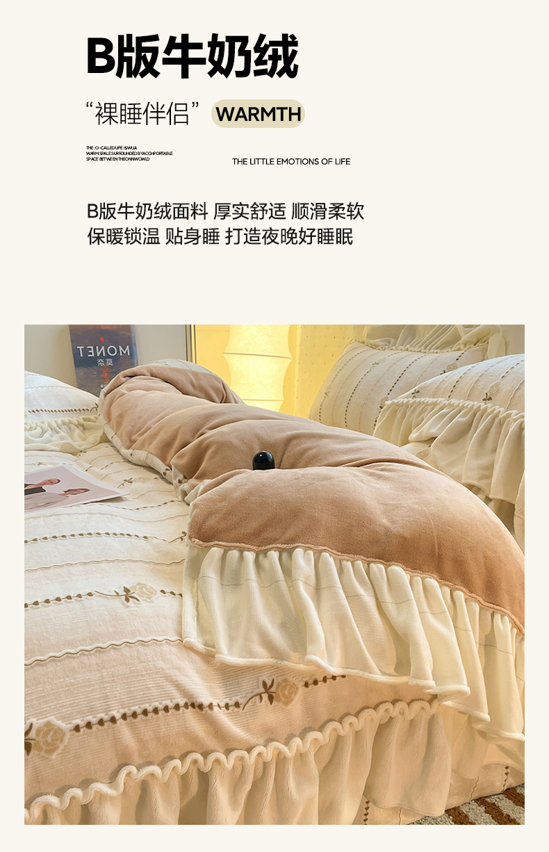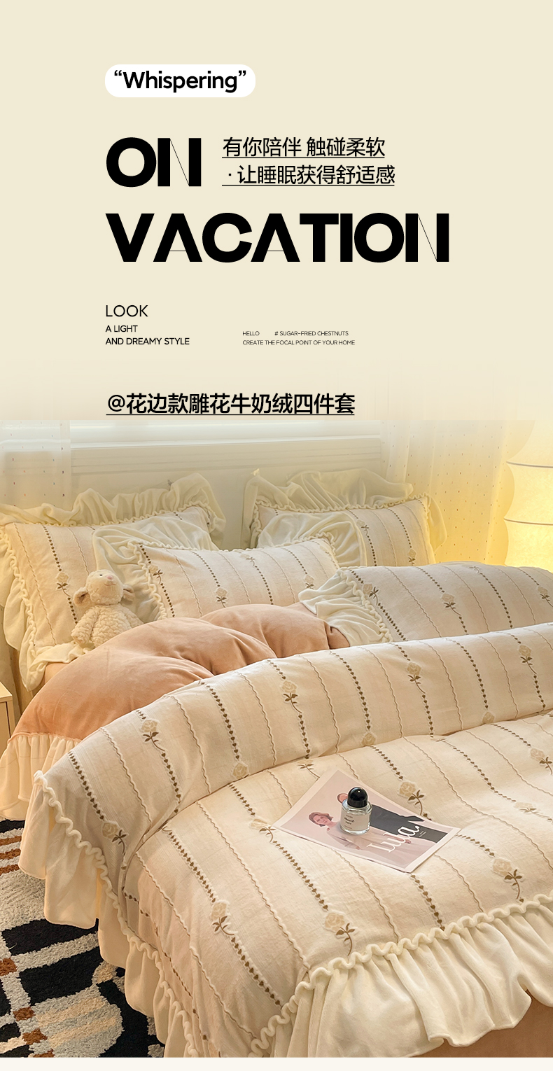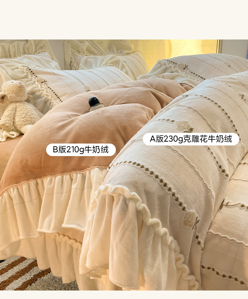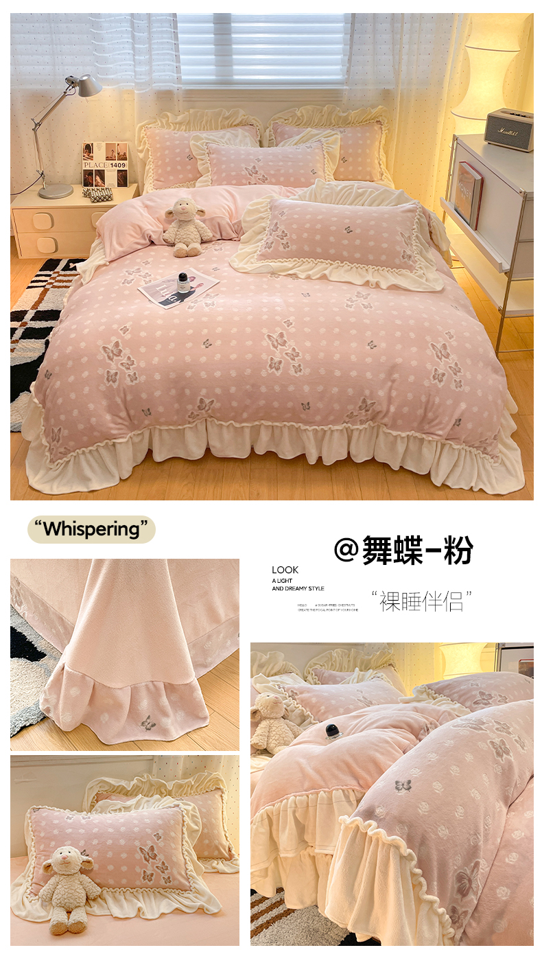(总)利欧 2025新款褶皱边雕花牛奶绒四件套,玫影-紫,蝶舞-蓝,蝶舞-绿,玫影-橙,少女结-粉,少女结-灰,少女结-蓝,舞蝶-粉