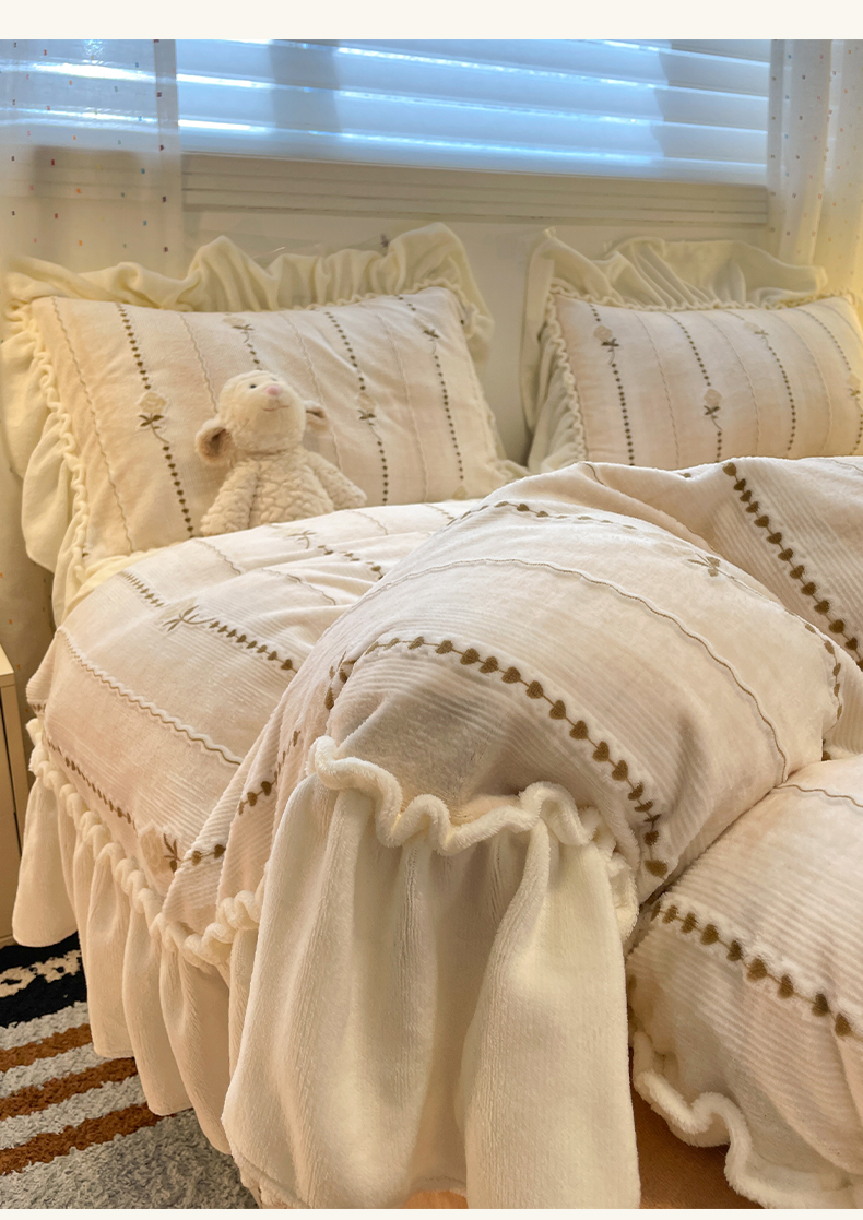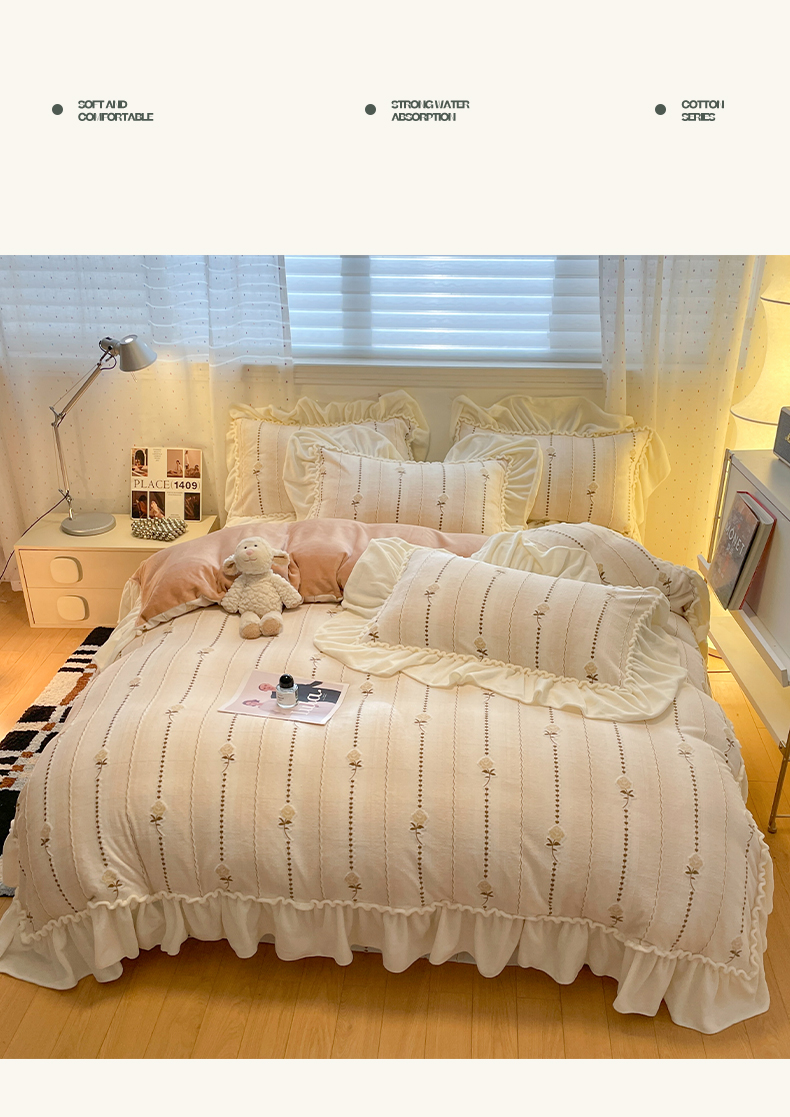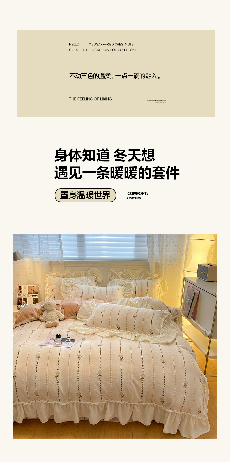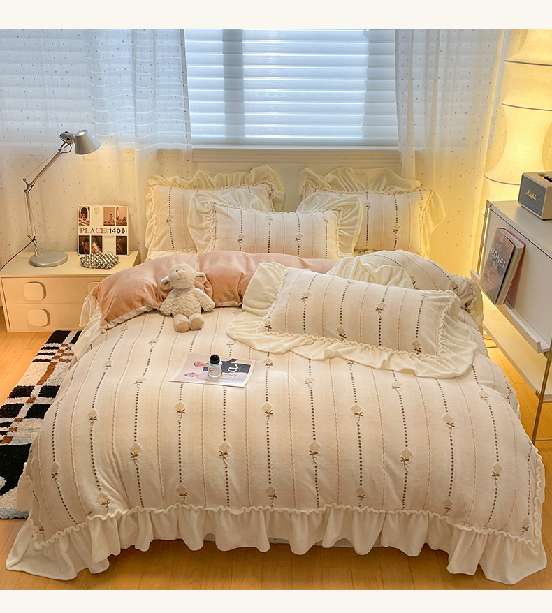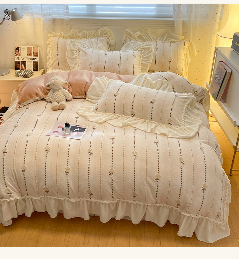 (总)利欧 2025新款褶皱边雕花牛奶绒四件套,玫影-紫,蝶舞-蓝,蝶舞-绿,玫影-橙,少女结-粉,少女结-灰,少女结-蓝,舞蝶-粉
