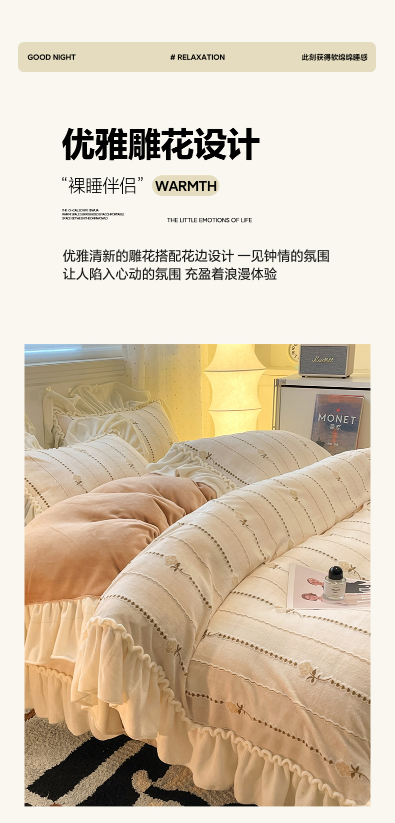 利欧 2025新款褶皱边雕花牛奶绒四件套 玫影-橙