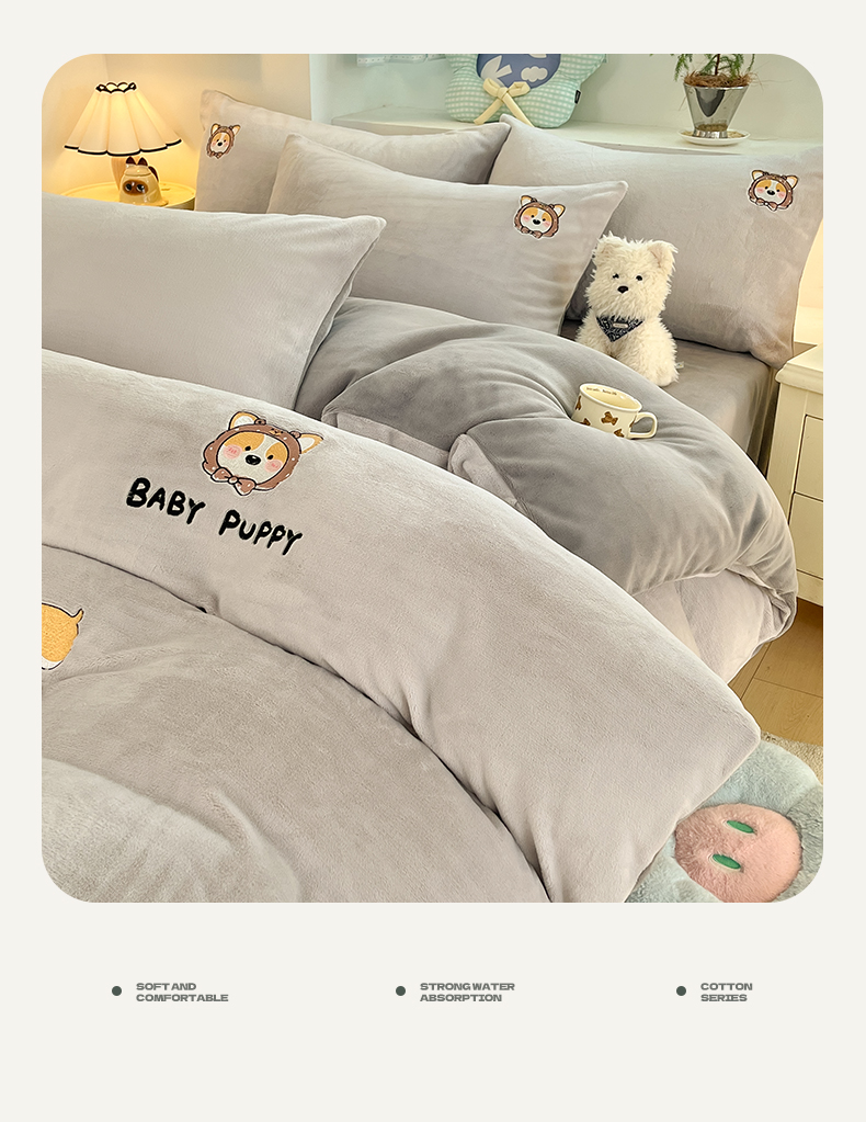利欧 2025新款满绣卡通牛奶绒刺绣四件套 快乐柯基-米白