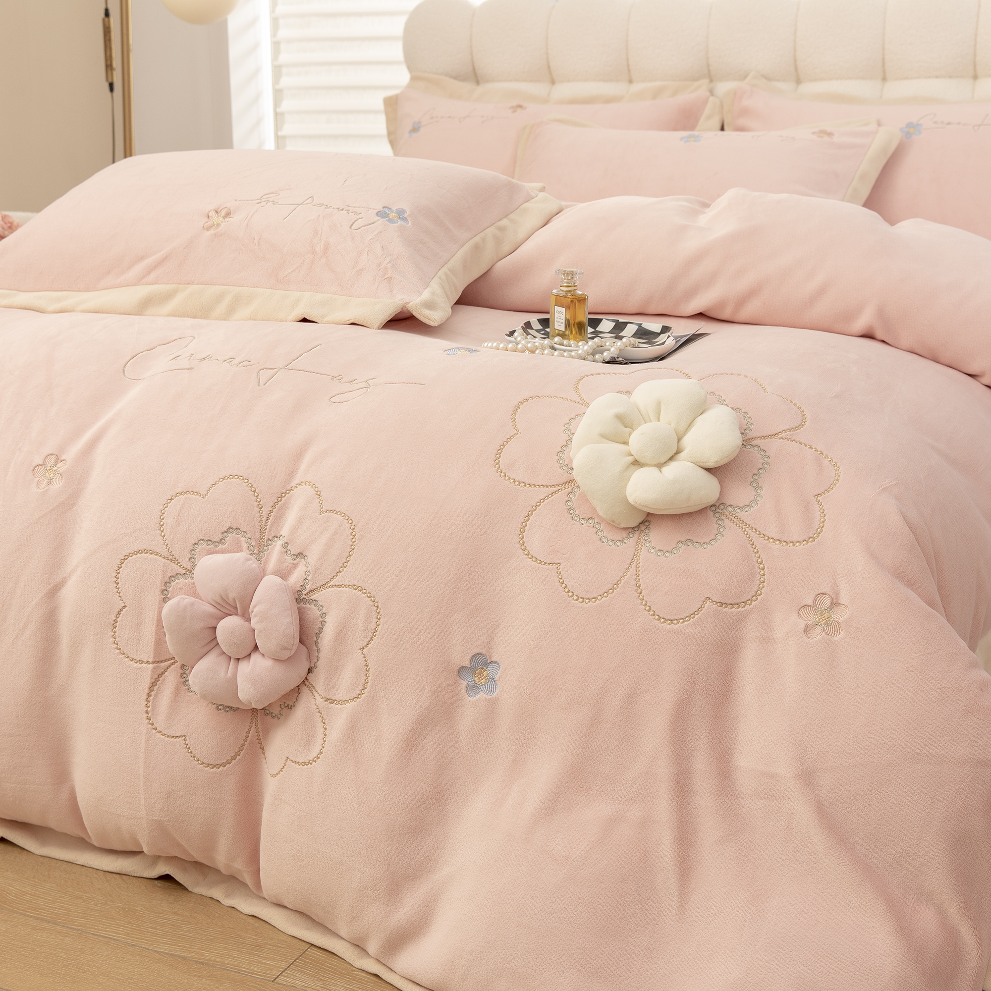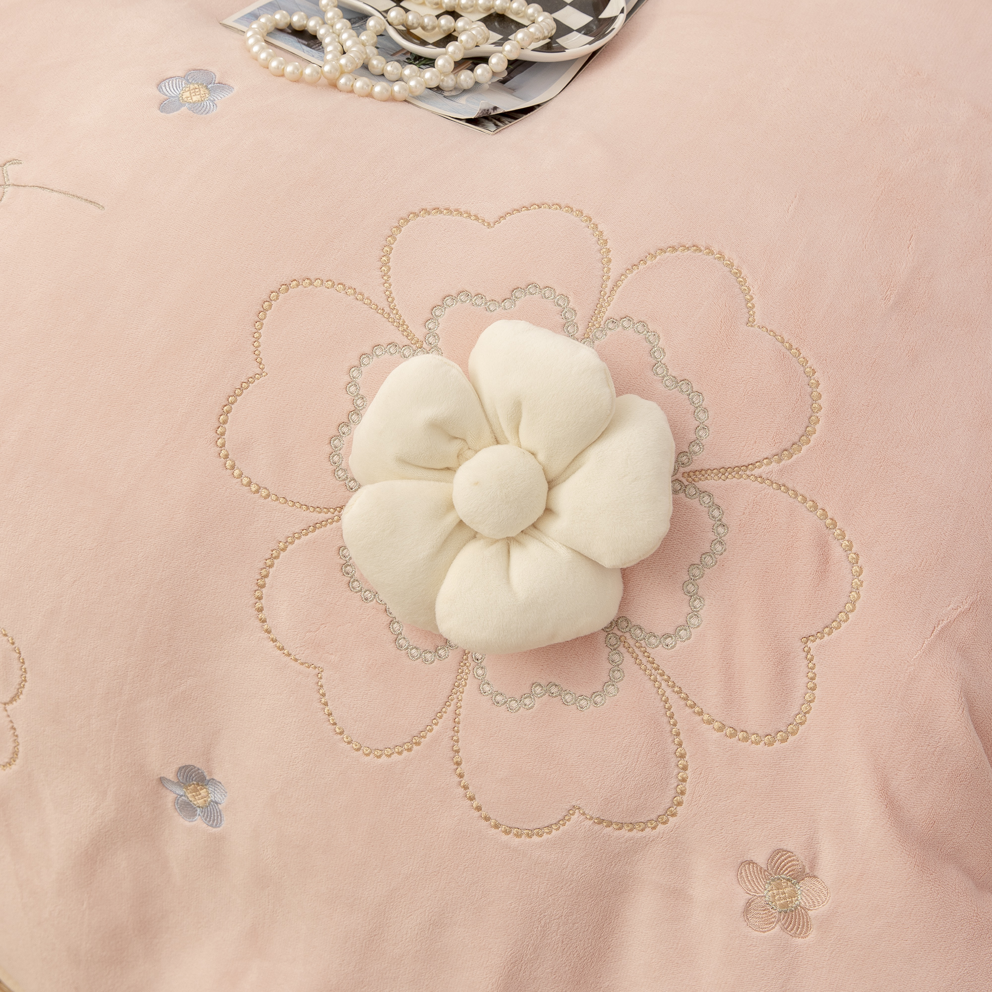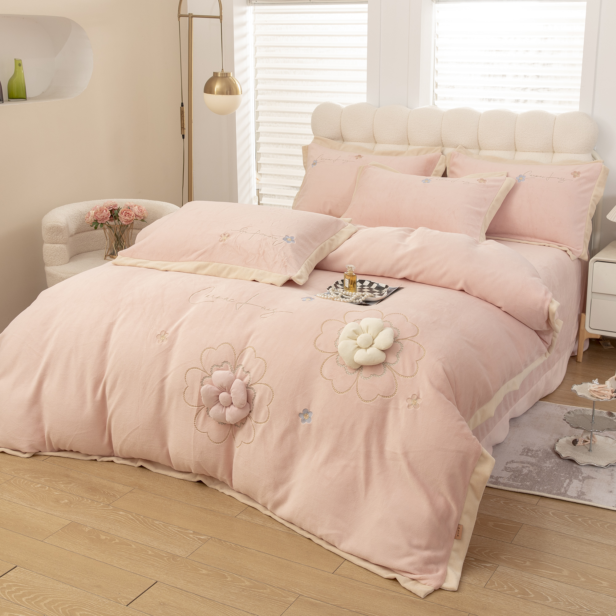 商品名称:贝尔 2025新款花之语-纯色高克重全消光蚕丝绒(赠送拎袋)-段角刺绣四件套 粉色