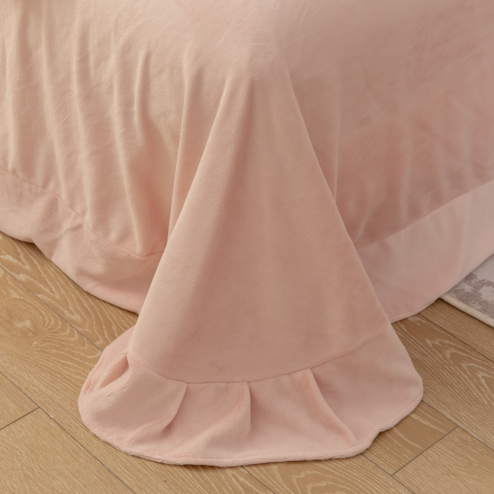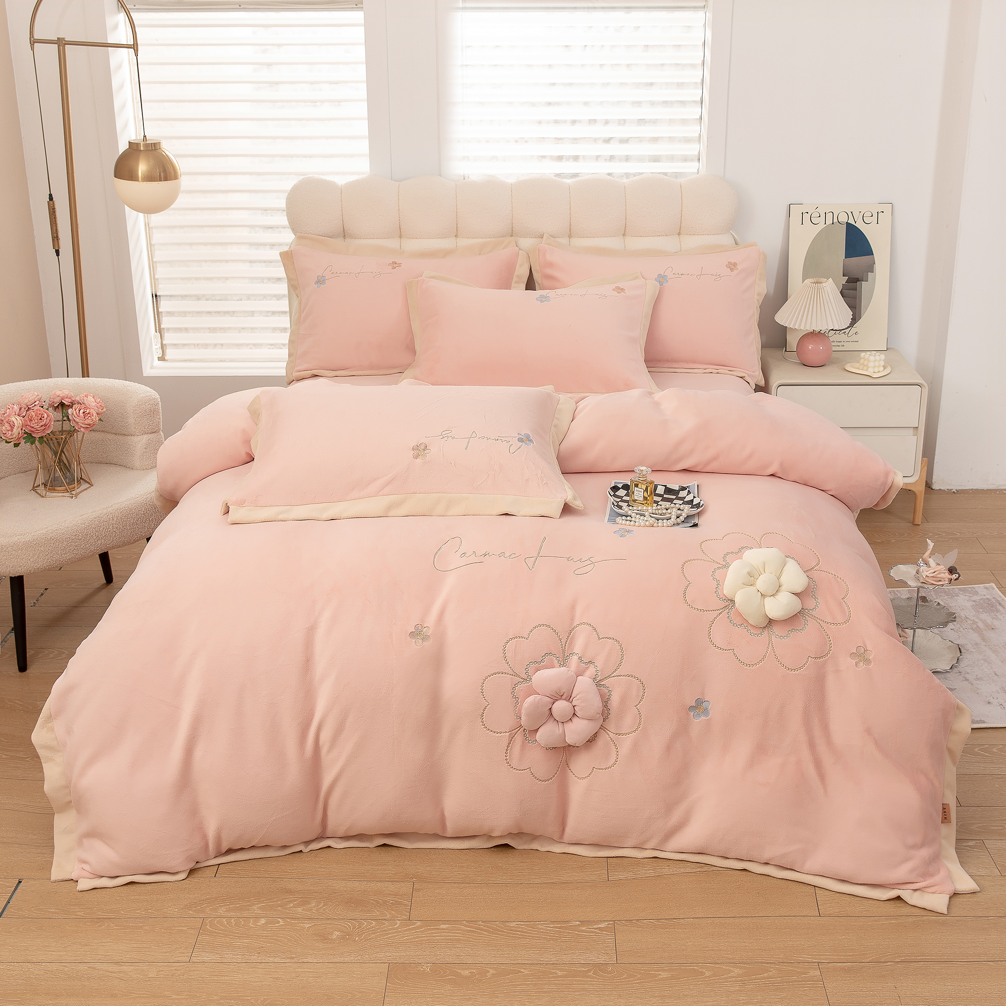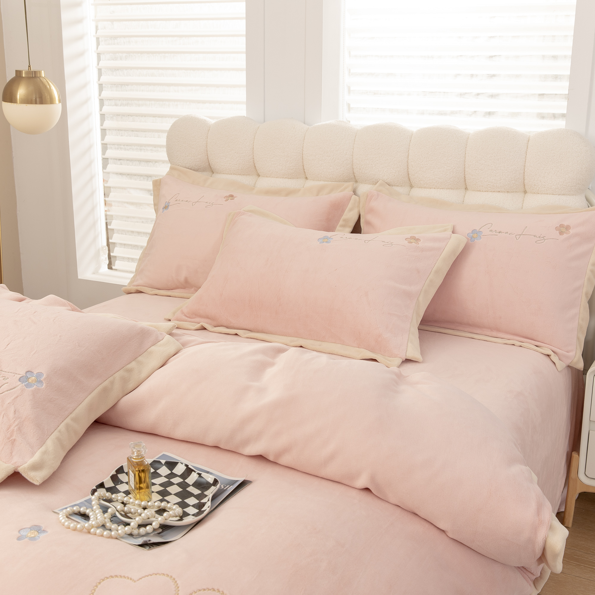 商品名称:贝尔 2025新款花之语-纯色高克重全消光蚕丝绒(赠送拎袋)-段角刺绣四件套 粉色