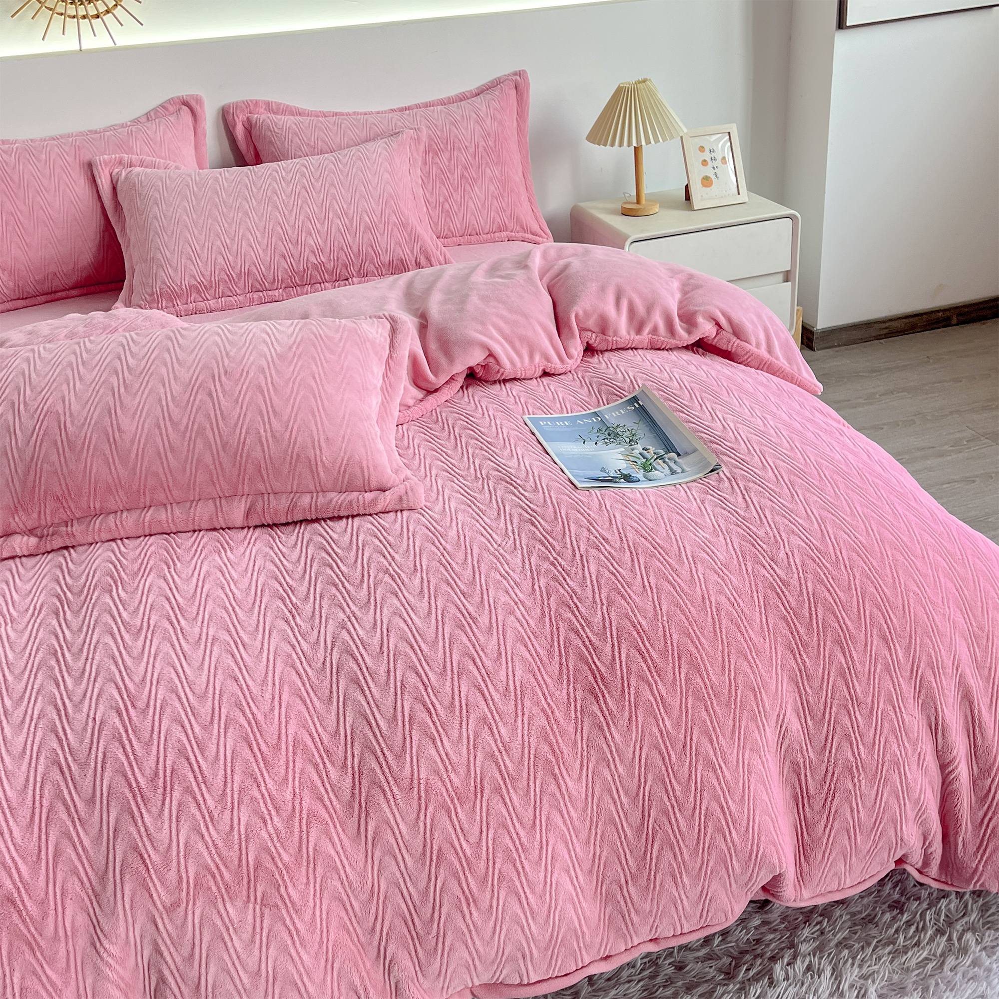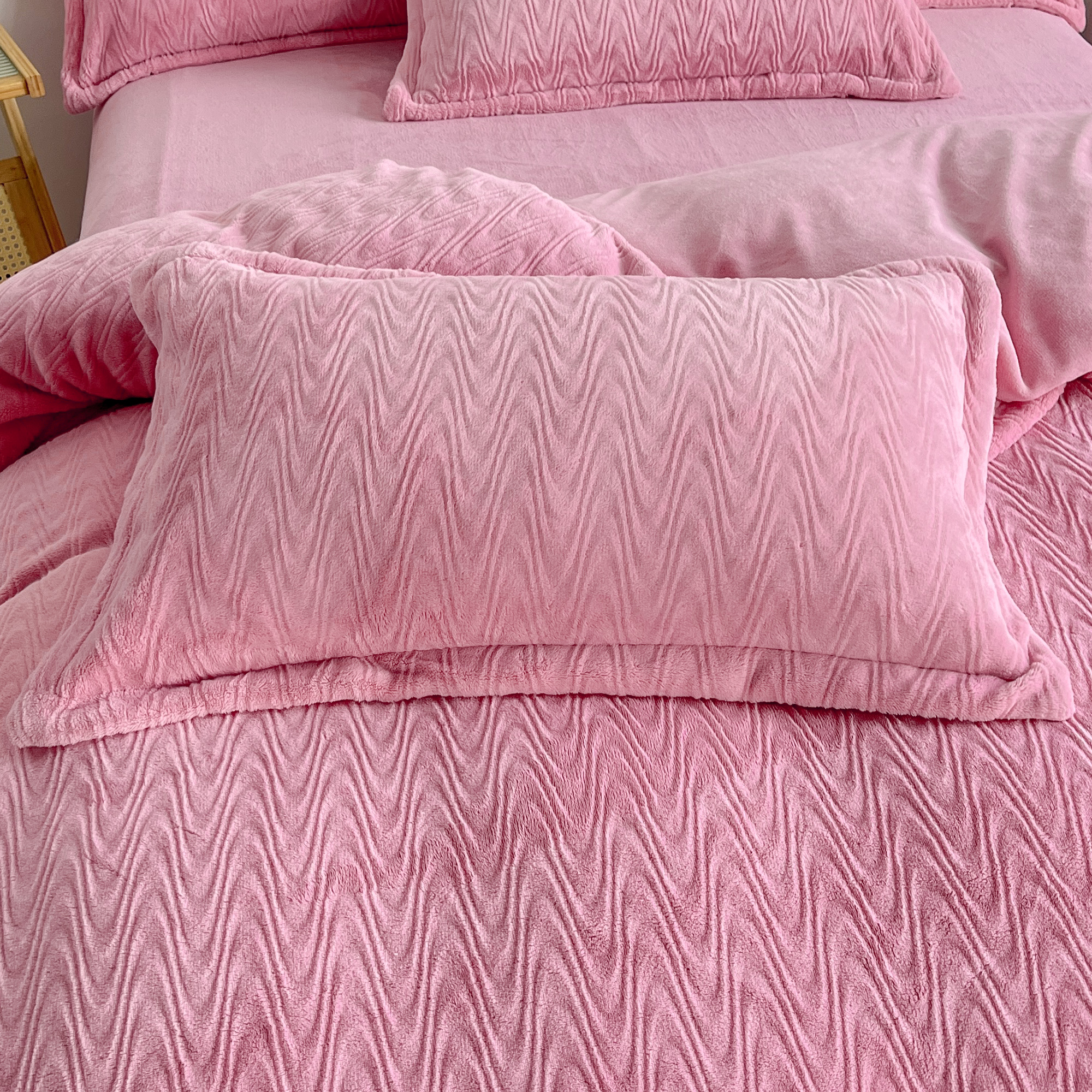 商品名称:2025新款全消光皮草绒纯色高克重四件套(赠送拎袋)——波纹 仙女粉
