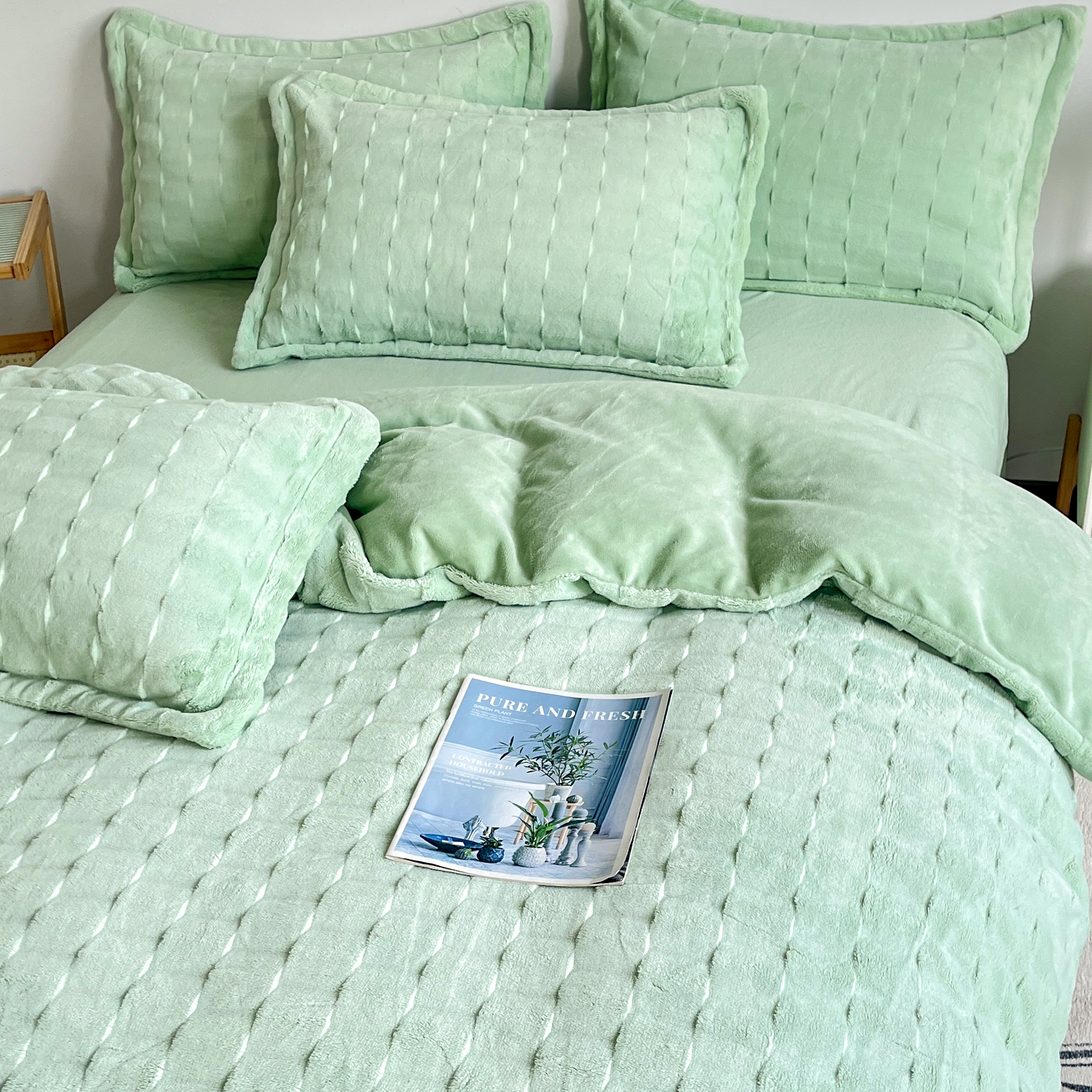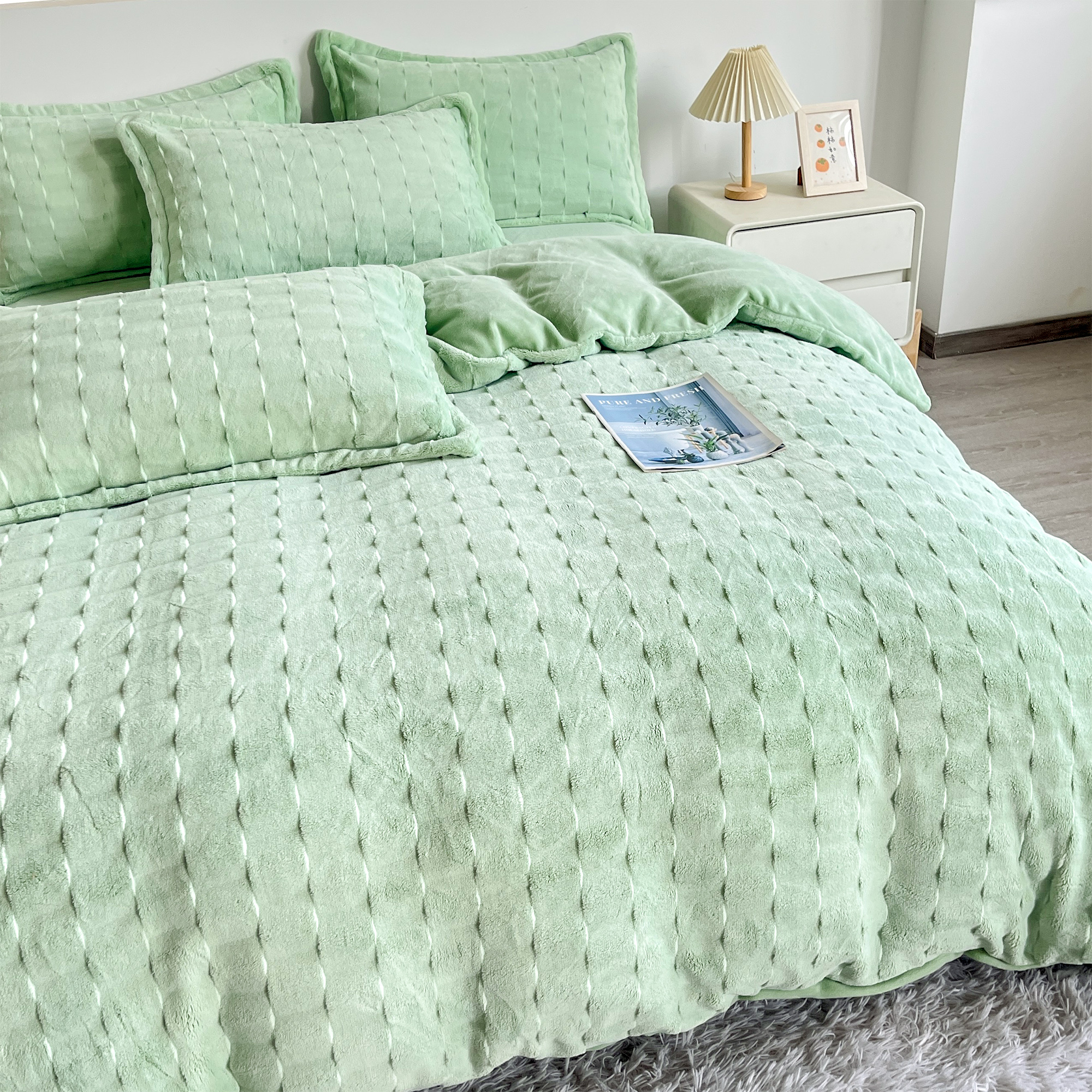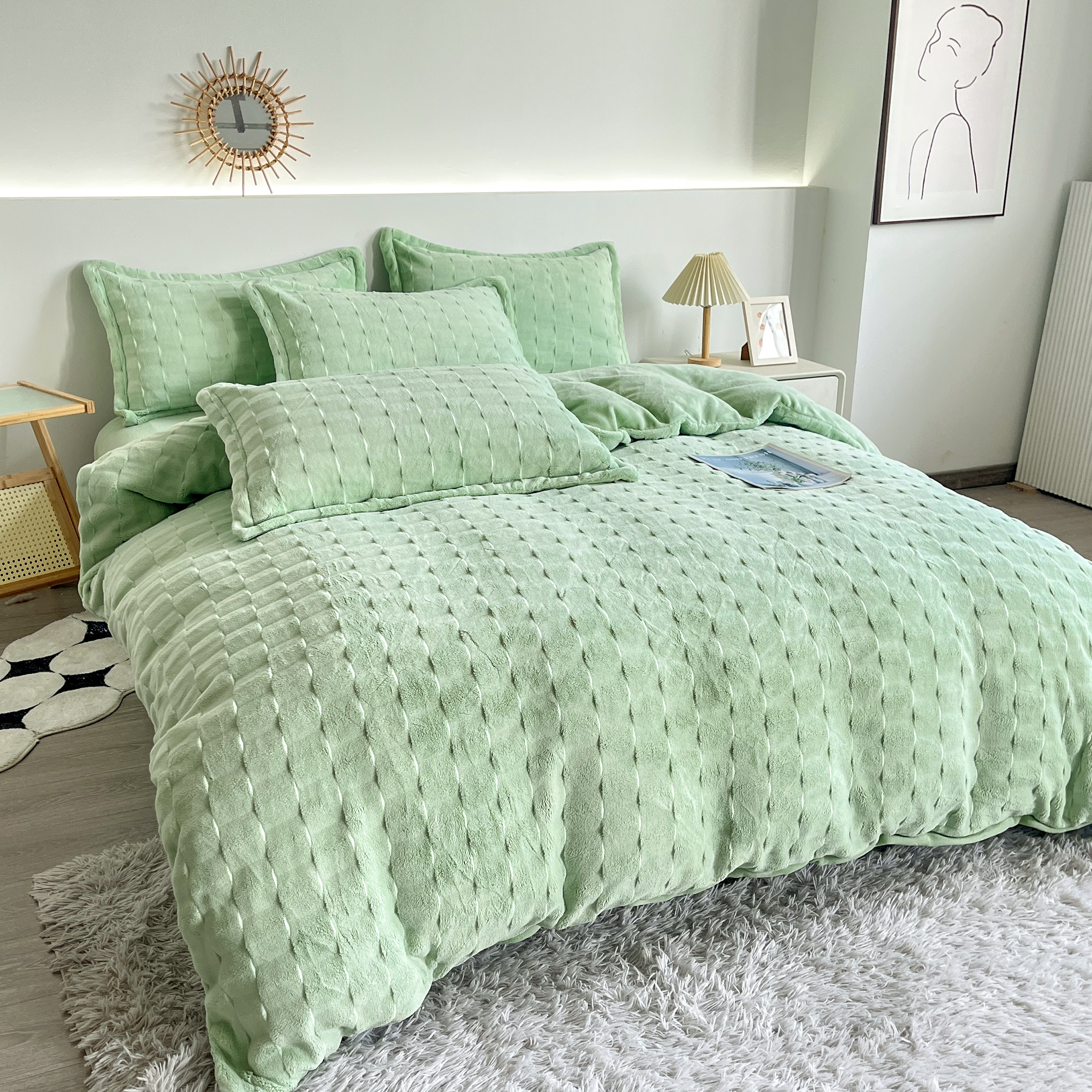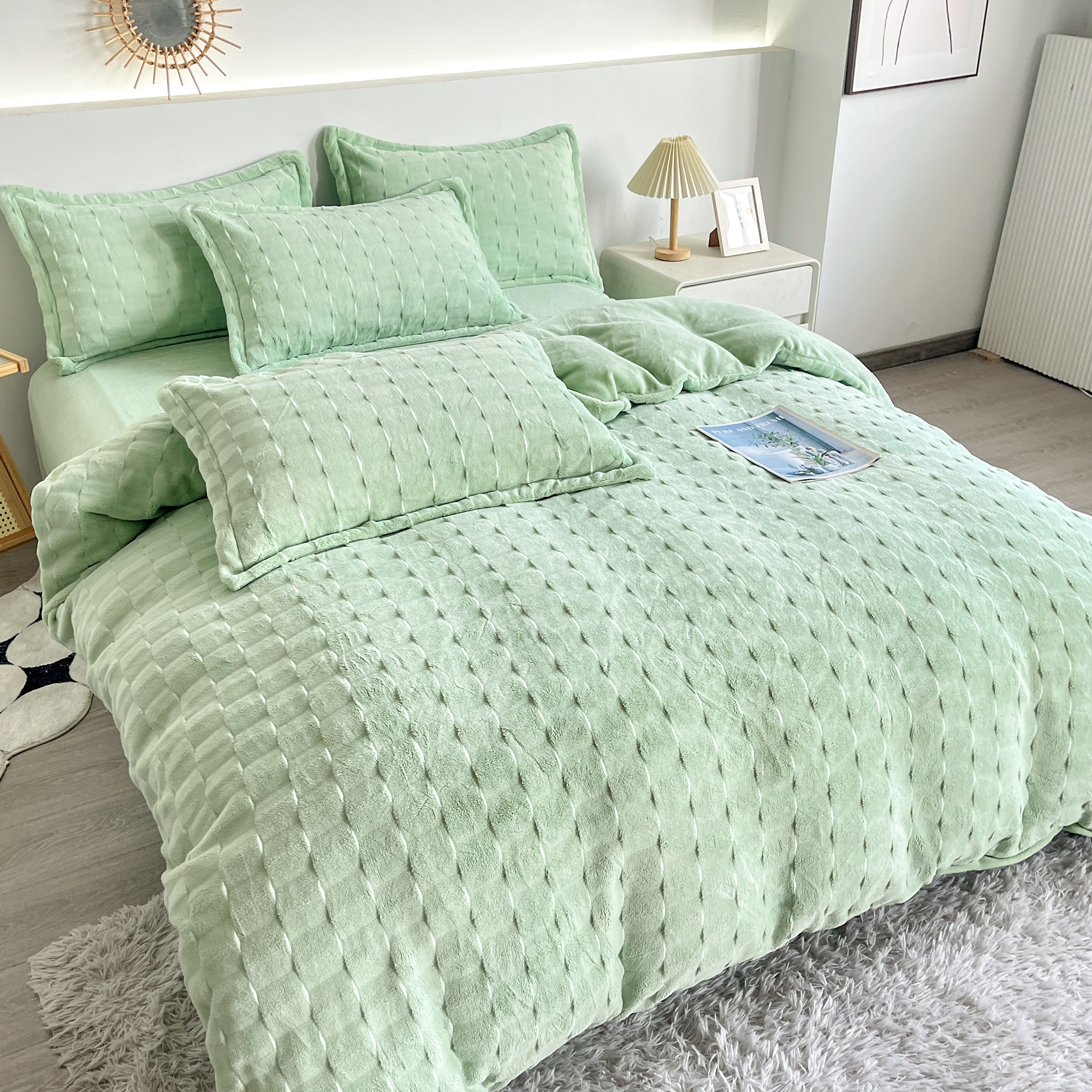 2025新款全消光皮草绒纯色高克重四件套(赠送拎袋)——方格 抹茶绿