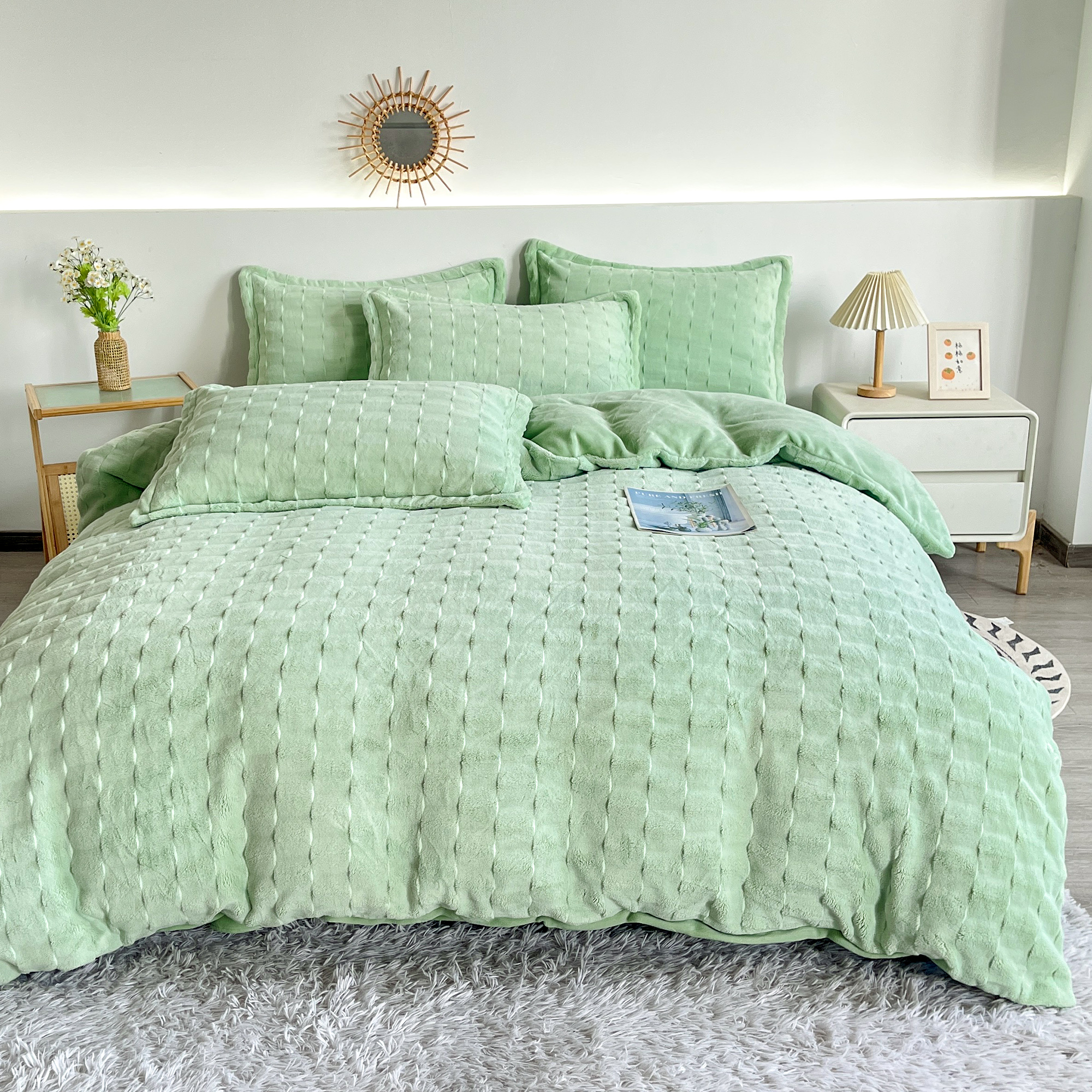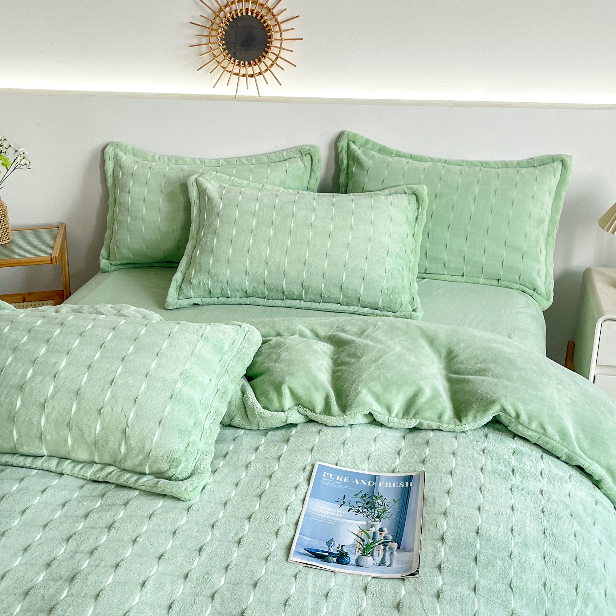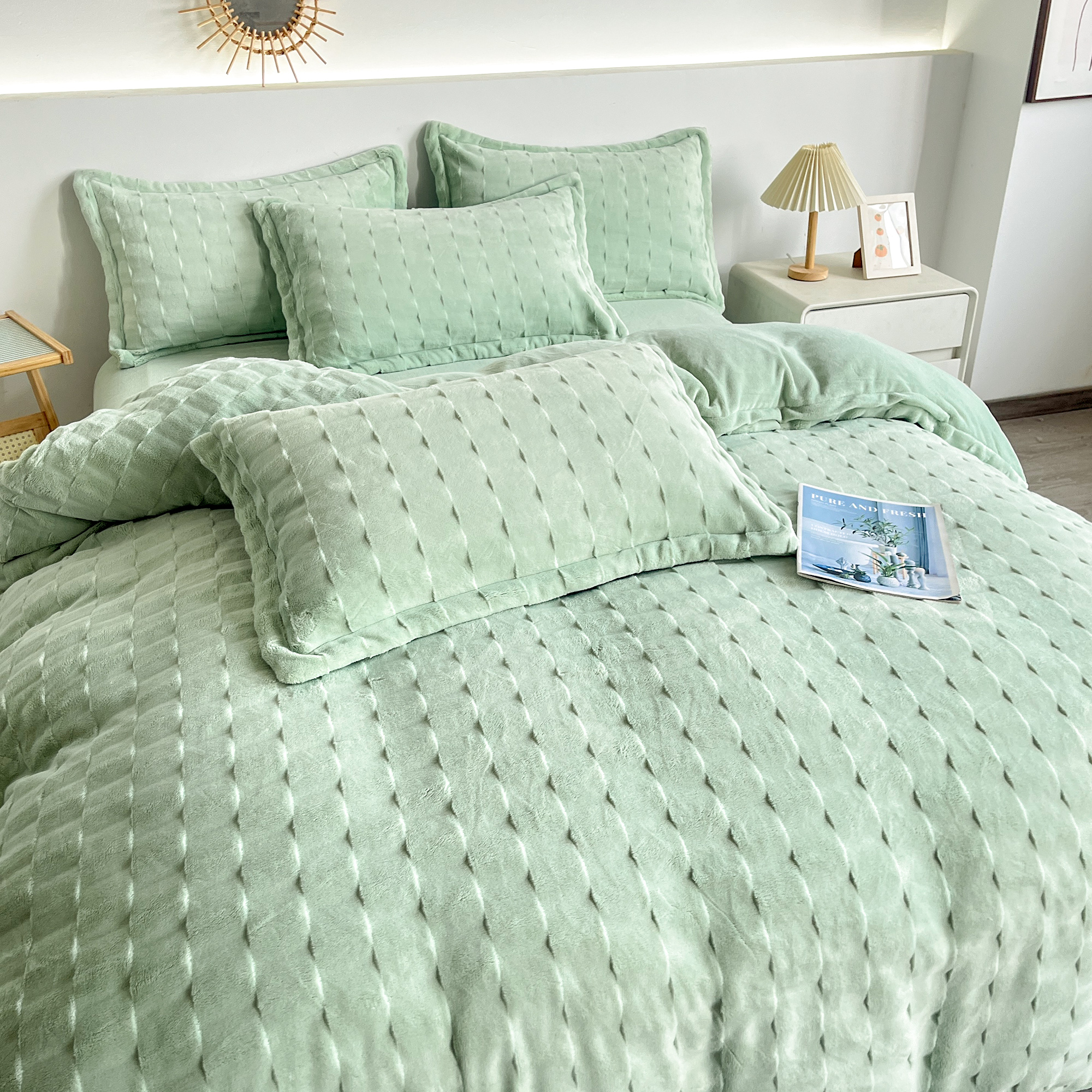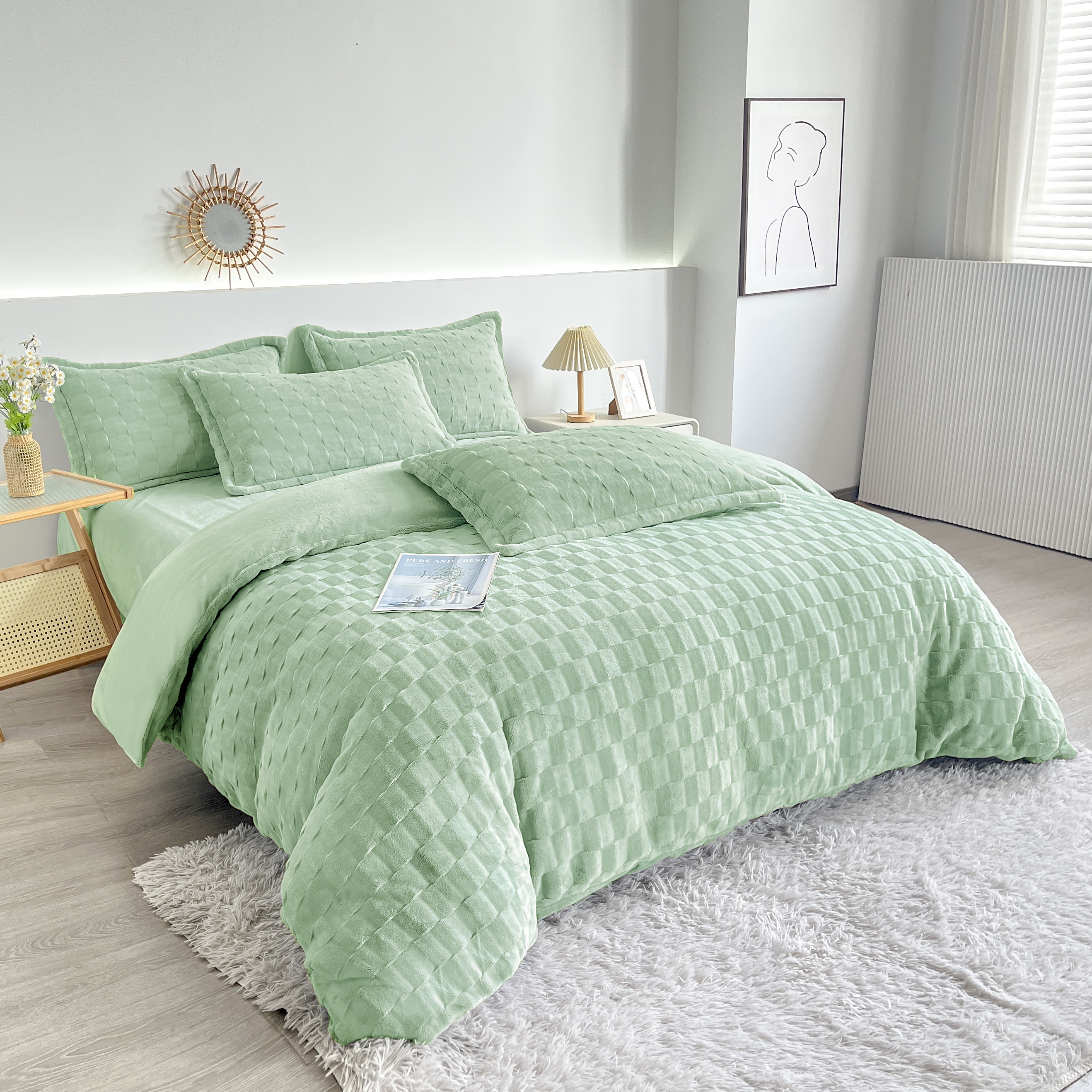 2025新款全消光皮草绒纯色高克重四件套(赠送拎袋)——方格 抹茶绿