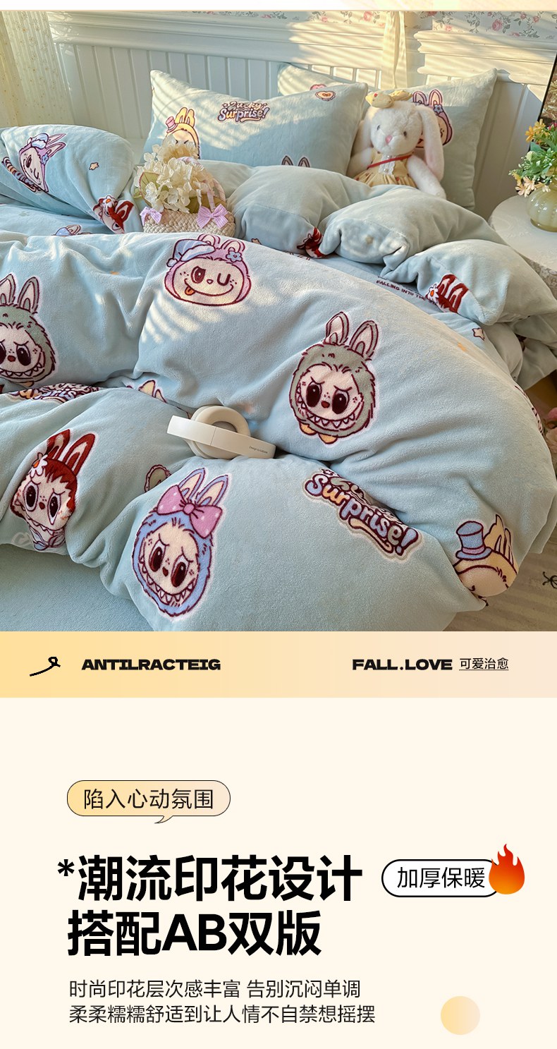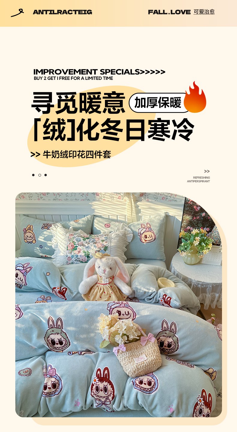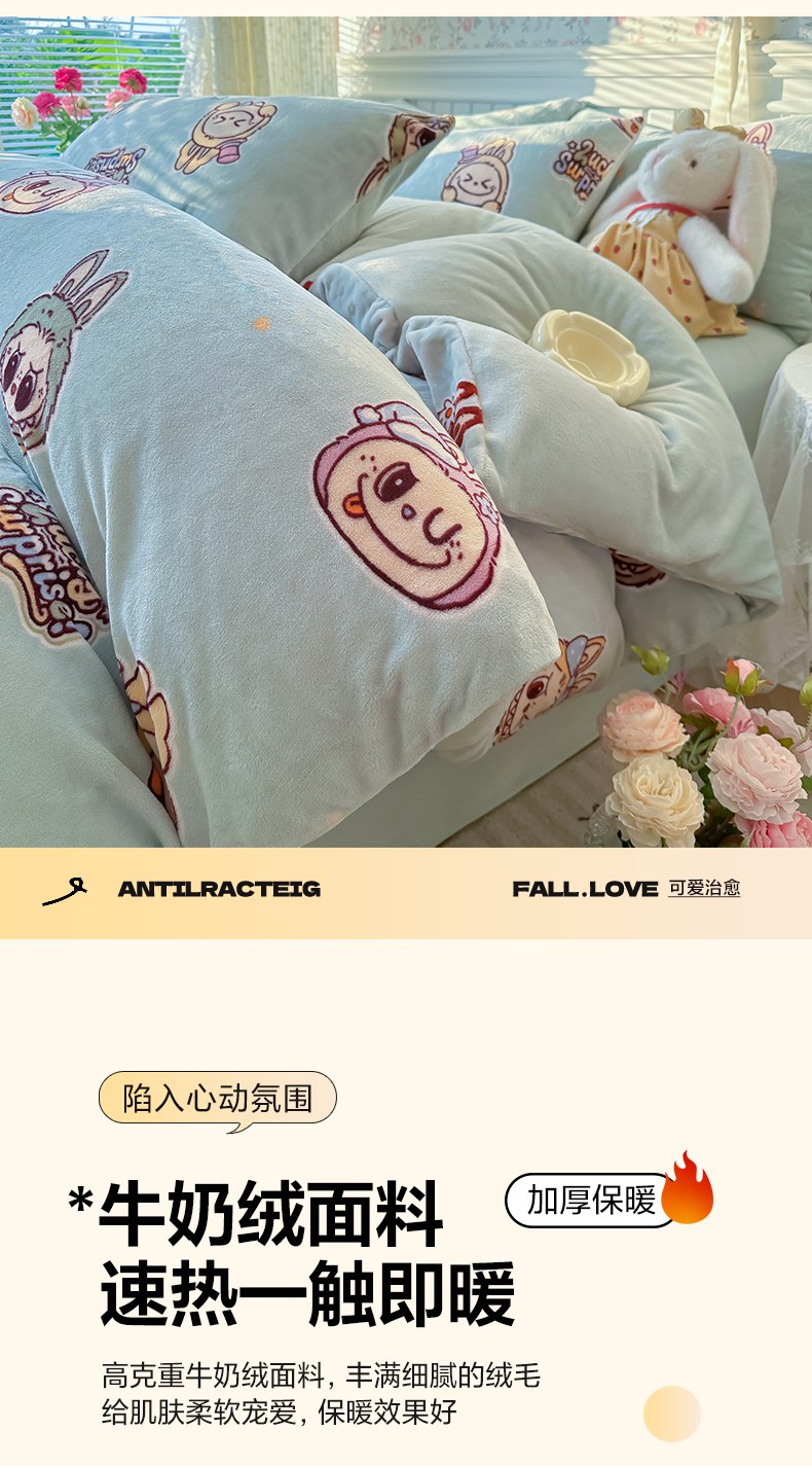 当前位置: 91家纺网 > 商品网购 > 床品套件 > 四件套 > 牛奶绒四件套 > 韩巢家纺 2025新款高克重印花牛奶绒床品四件套 拉布布