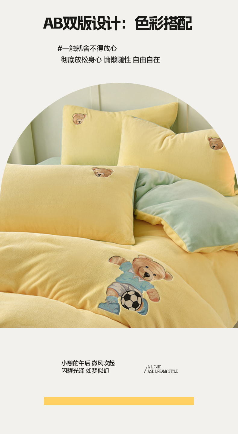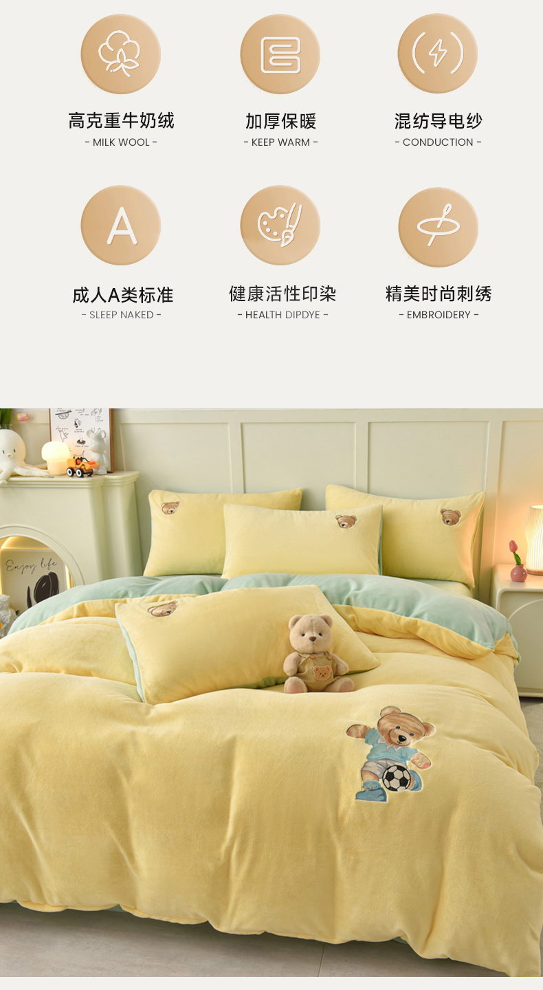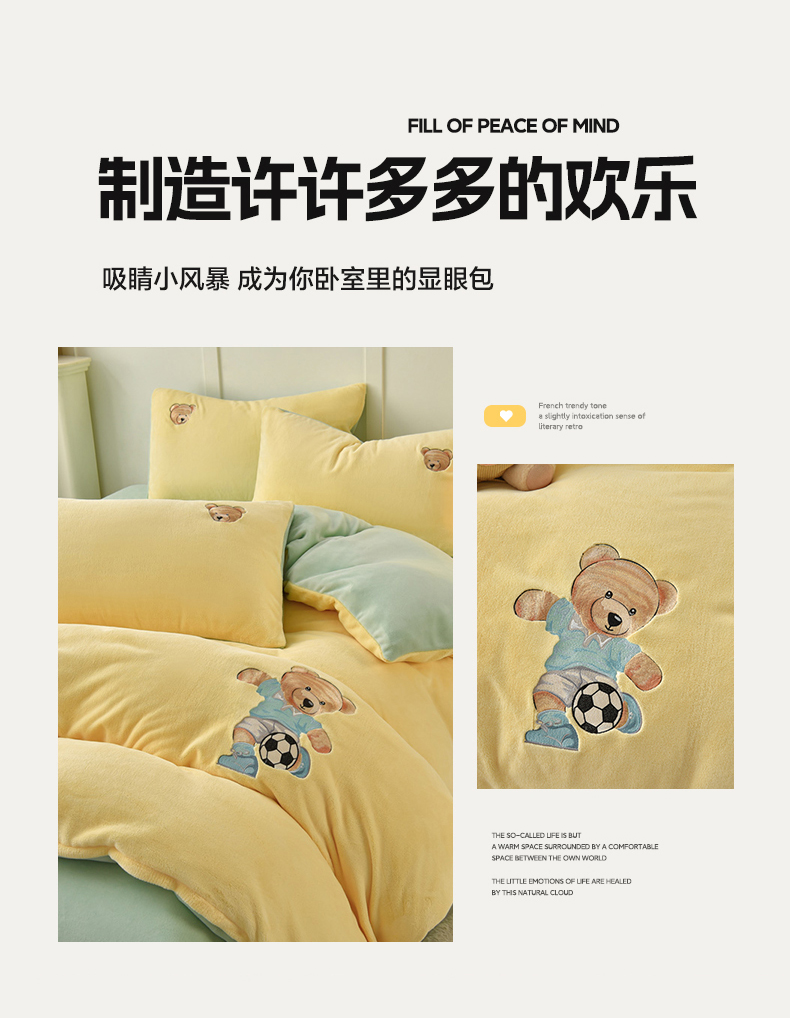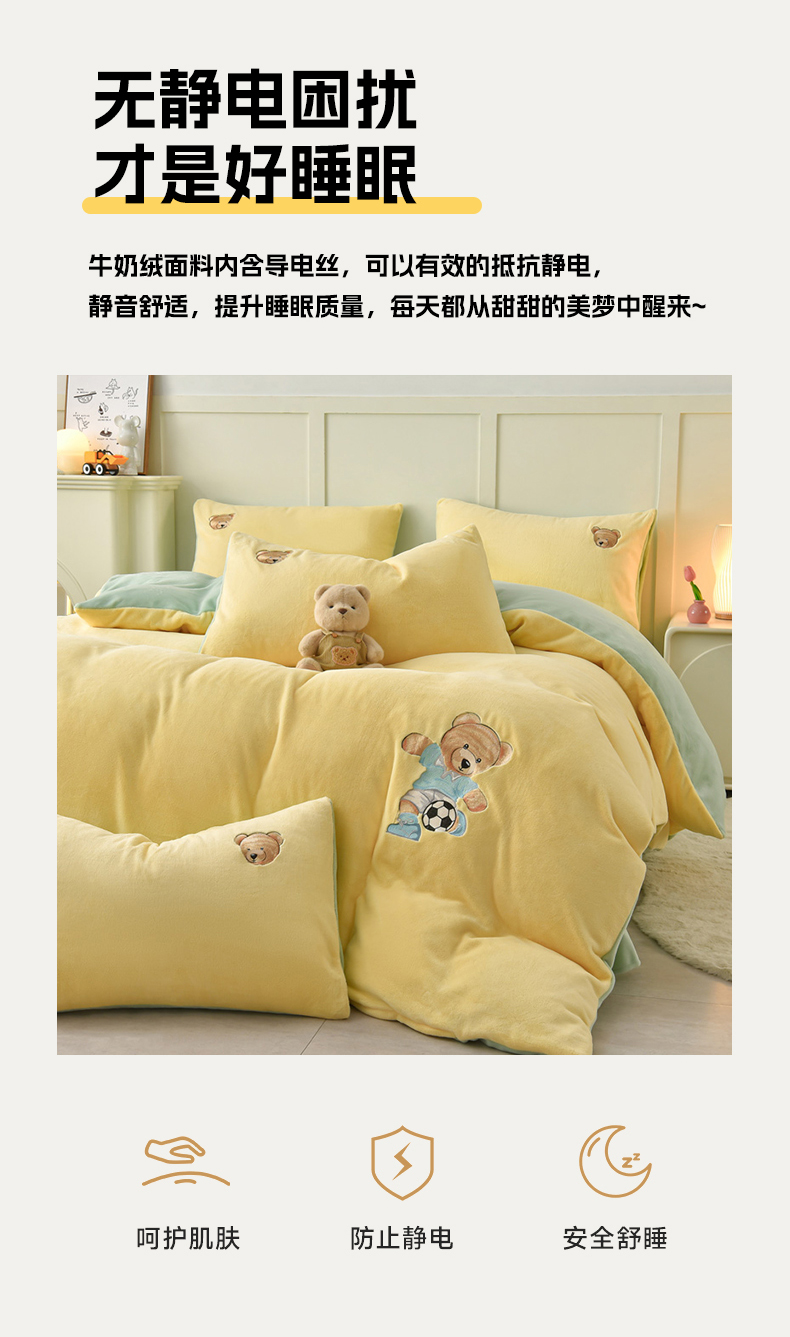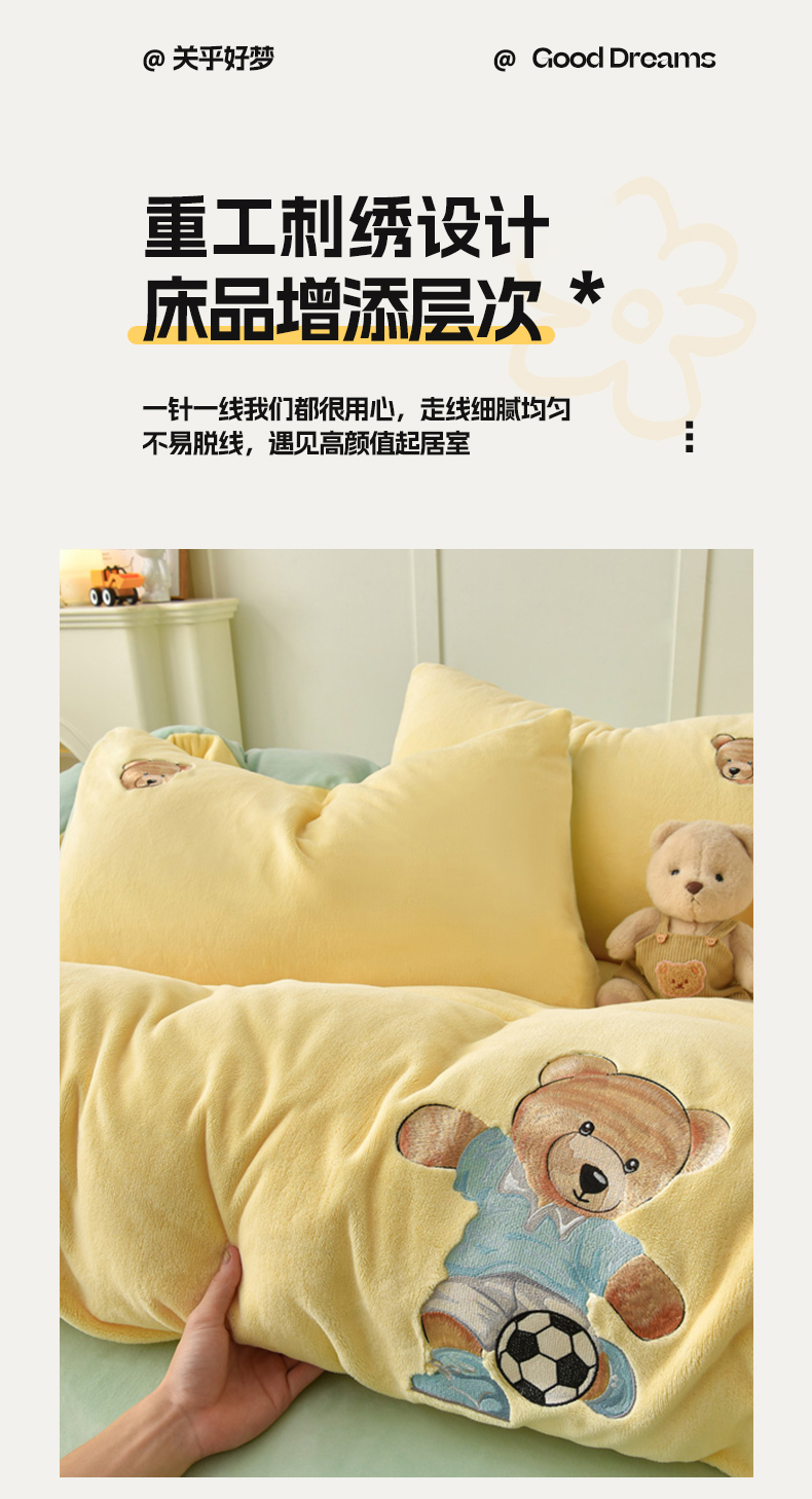 商品名称:牵依 2025新款高克重绣花牛奶绒四件套 足球小熊-奶油黄