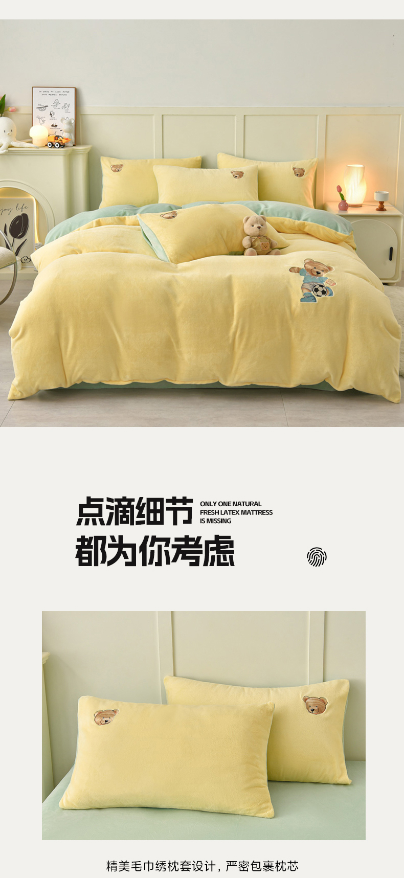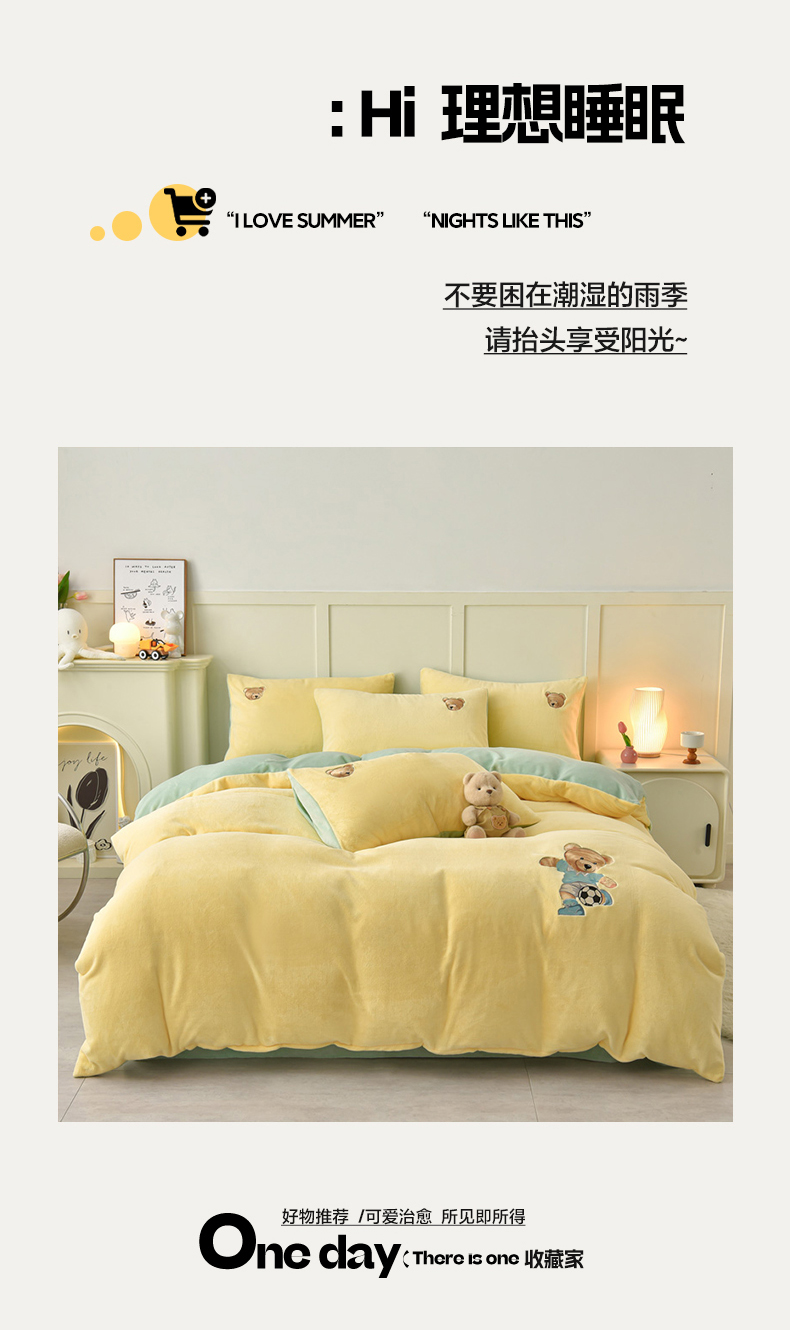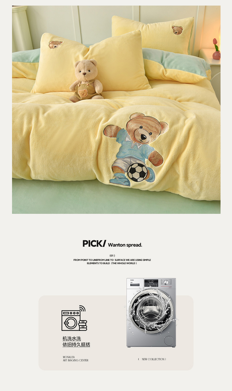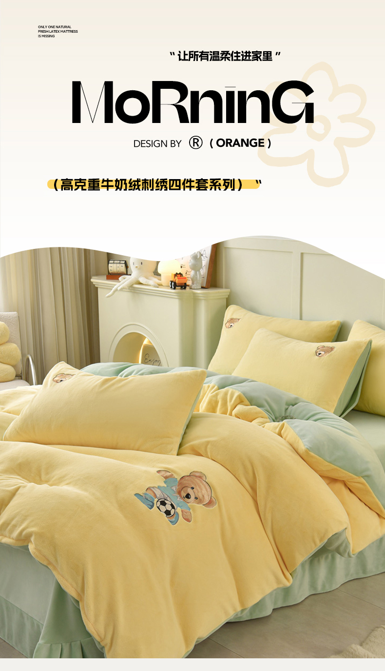 商品名称:牵依 2025新款高克重绣花牛奶绒四件套 足球小熊-奶油黄