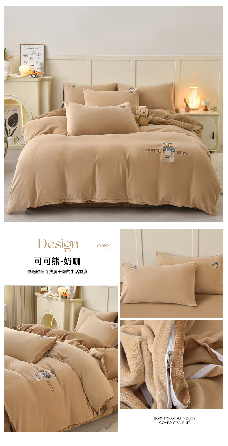 (总)牵依 2025新款高克重绣花牛奶绒四件套,可可熊-宾利蓝,足球小熊-奶油黄,苏姑娘-奶咖,足球小熊-果绿,苏姑娘-浅紫,可可熊-浅灰,可可熊-奶咖
