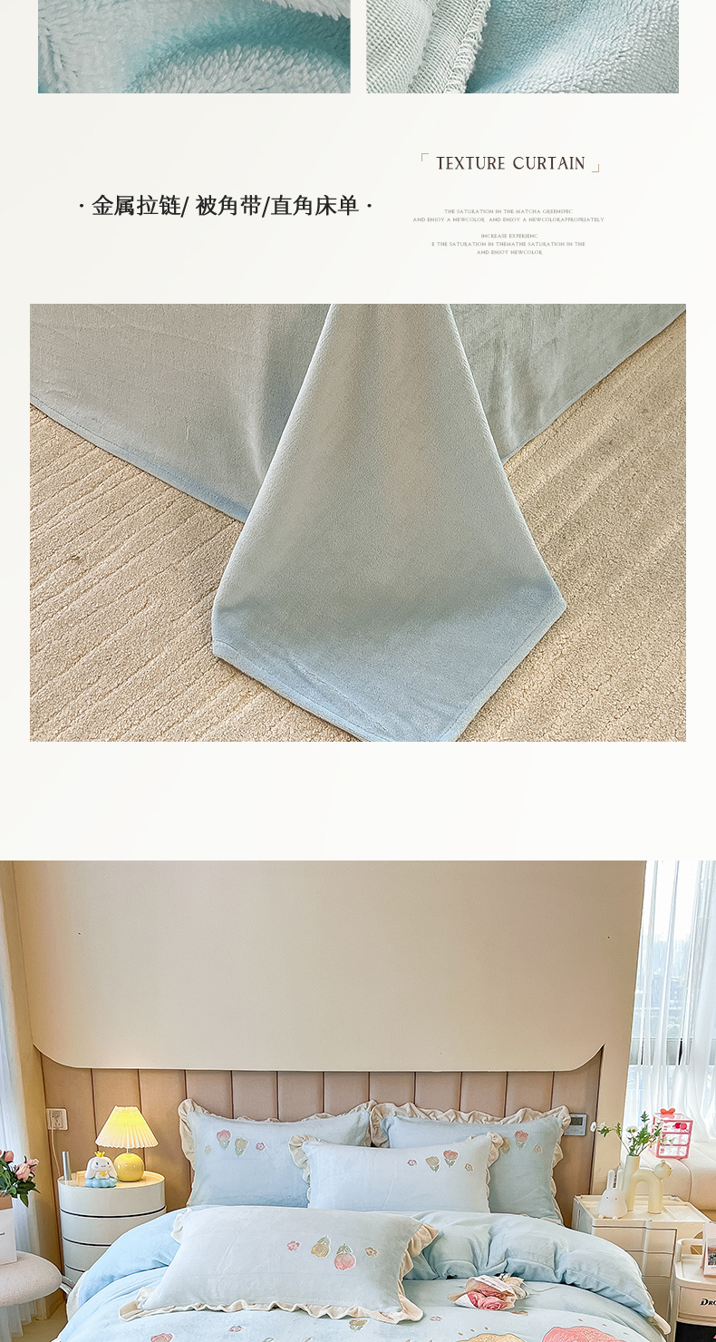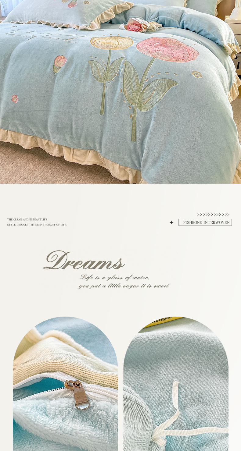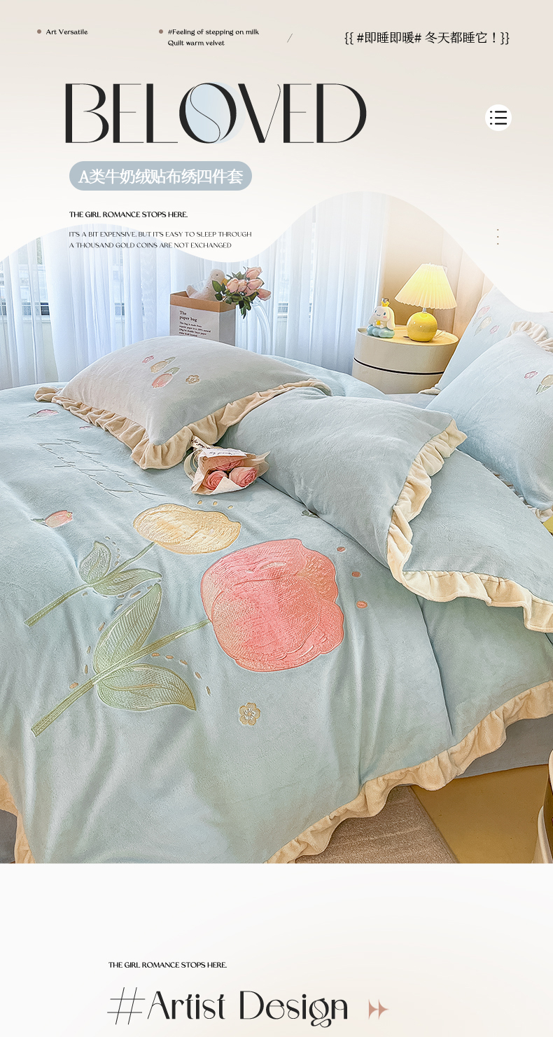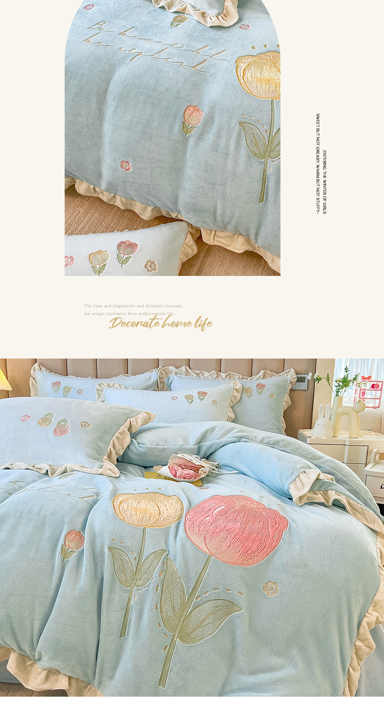 曲之慕 2025新款韩版牛奶绒花朵贴布绣四件套 郁金香-天空蓝