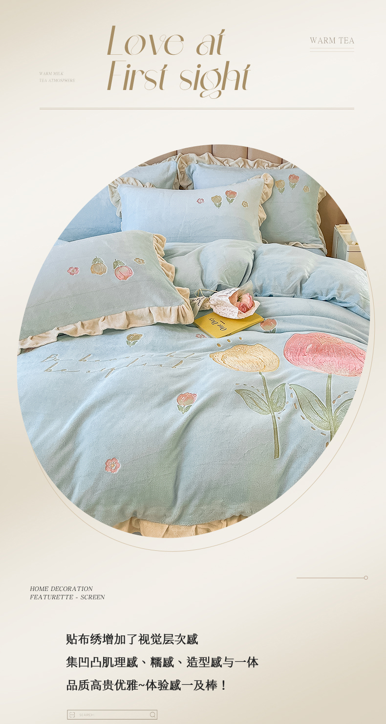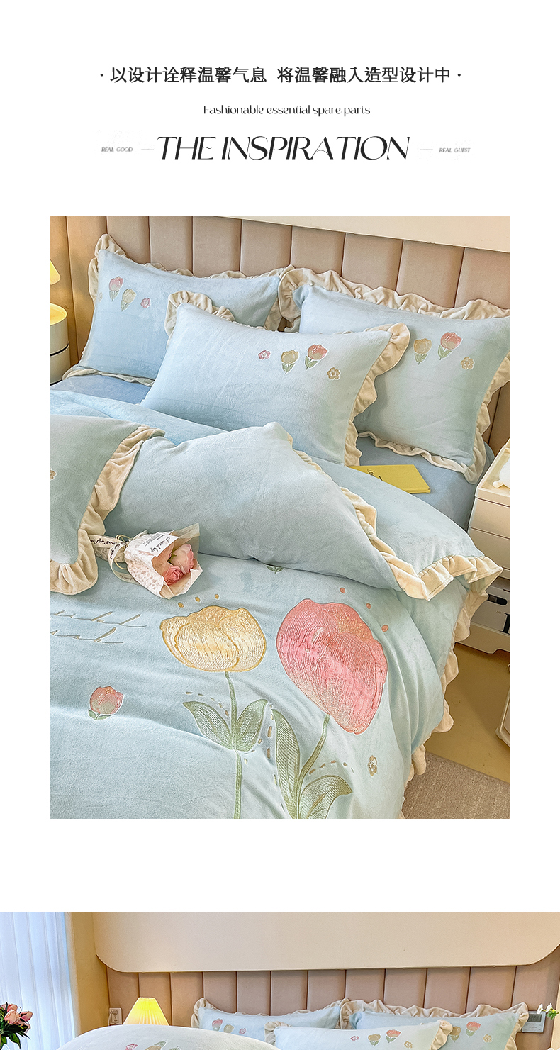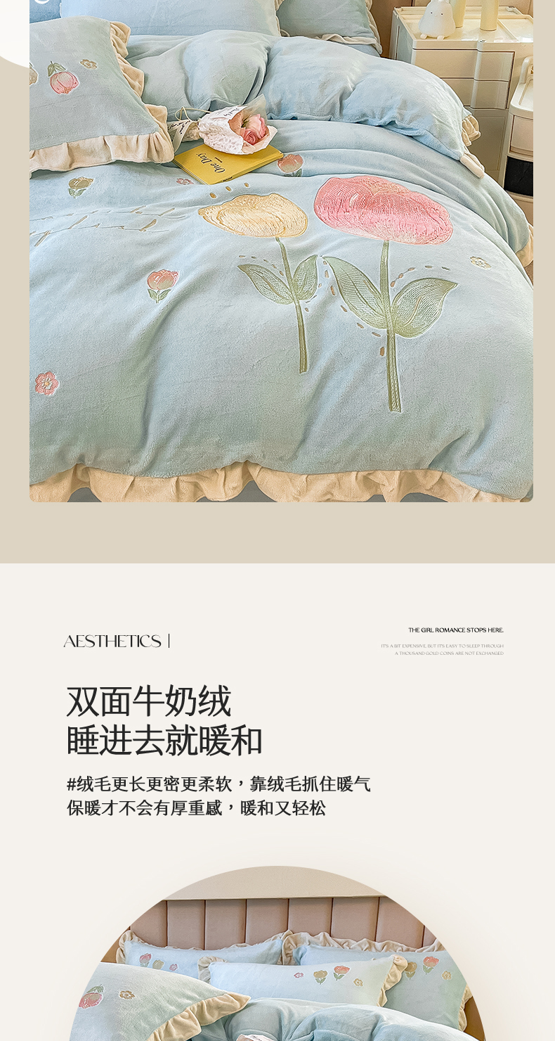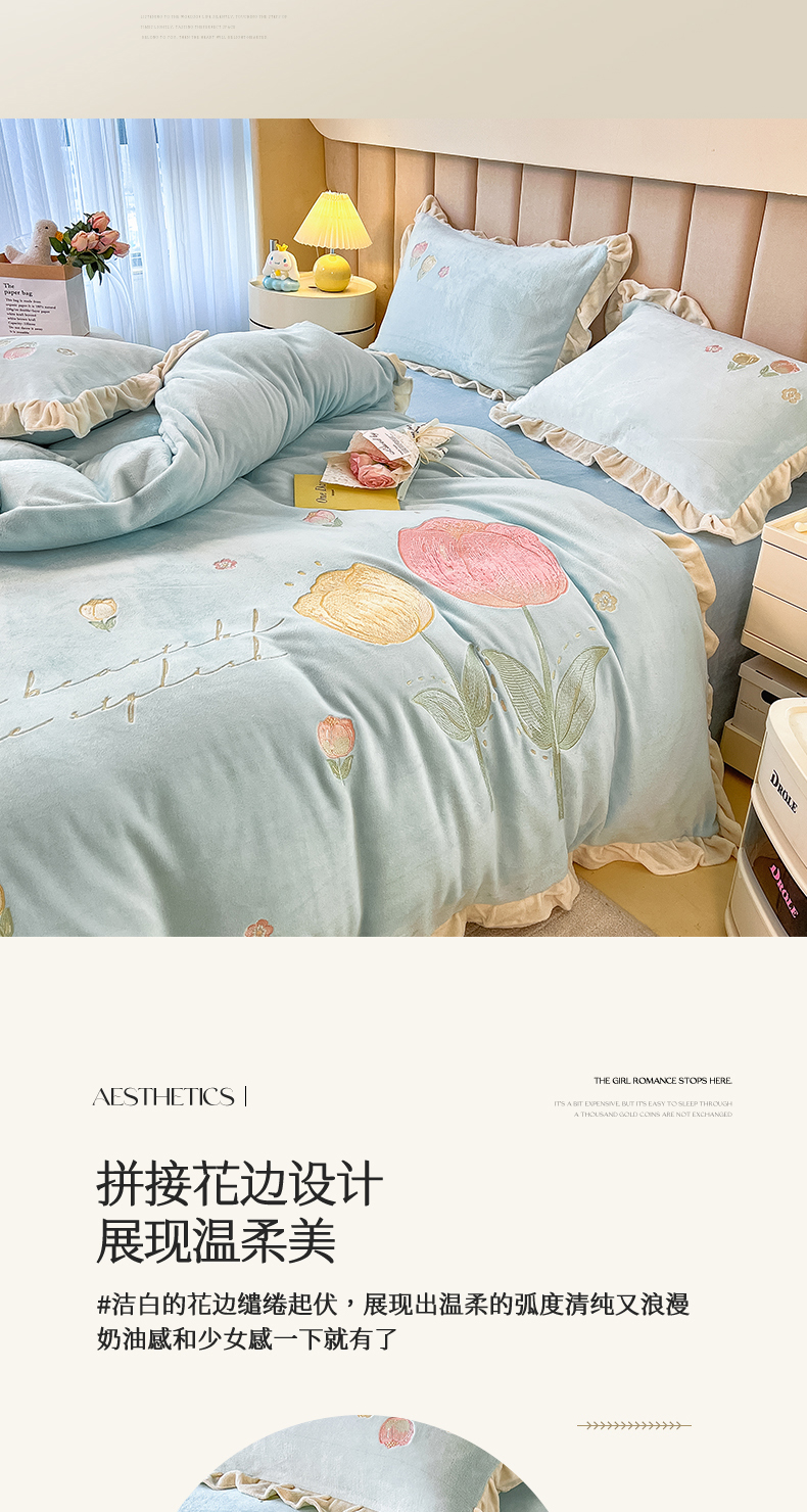 商品名称:曲之慕 2025新款韩版牛奶绒花朵贴布绣四件套 郁金香-天空蓝