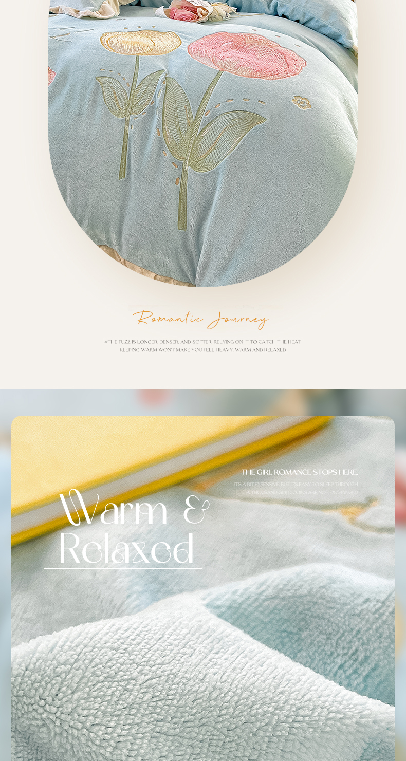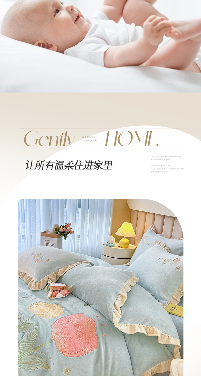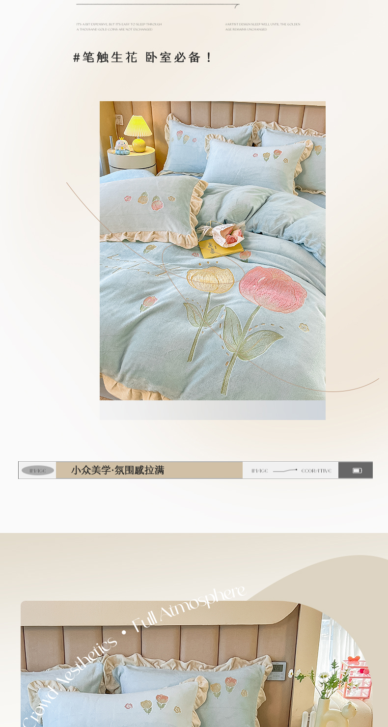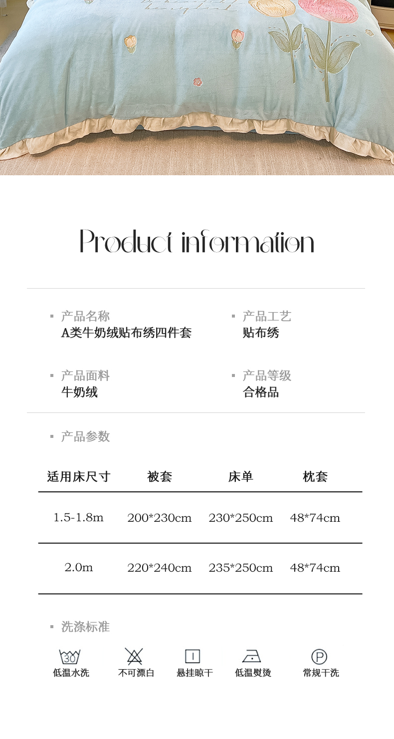 商品名称:曲之慕 2025新款韩版牛奶绒花朵贴布绣四件套 郁金香-天空蓝