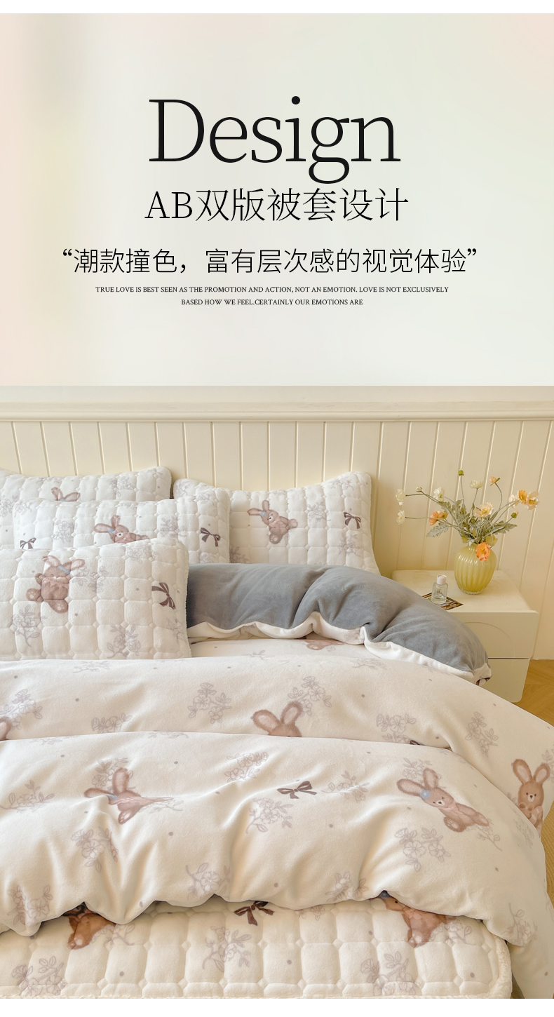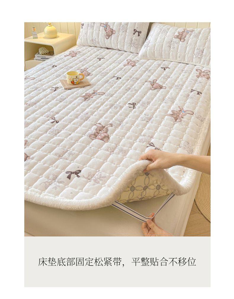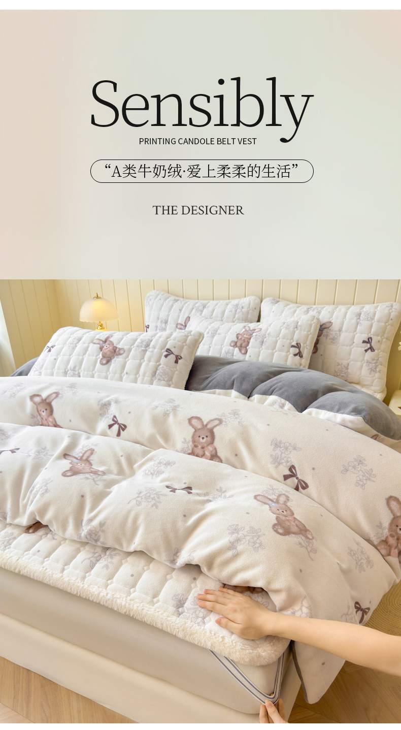 商品名称:LIFE.丽芙 2025秋冬新款A类牛奶绒加厚夹棉床褥垫+被套组合四件套 花环小兔