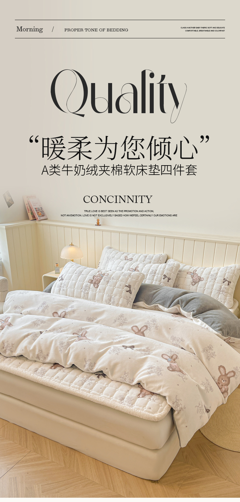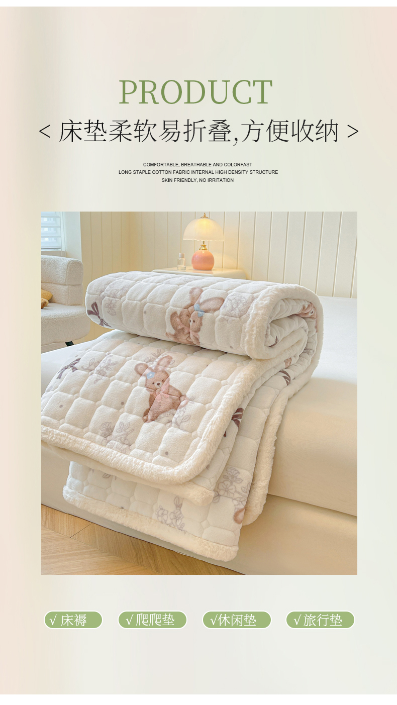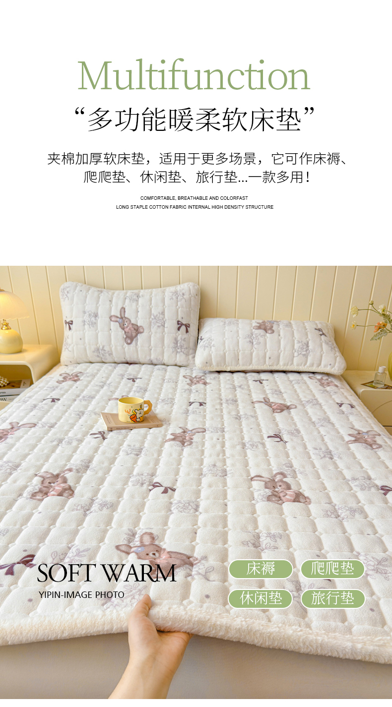 商品名称:LIFE.丽芙 2025秋冬新款A类牛奶绒加厚夹棉床褥垫+被套组合四件套 花环小兔