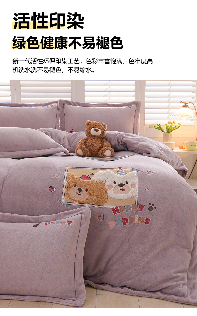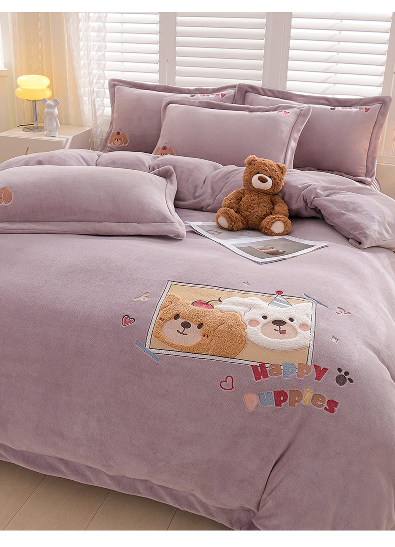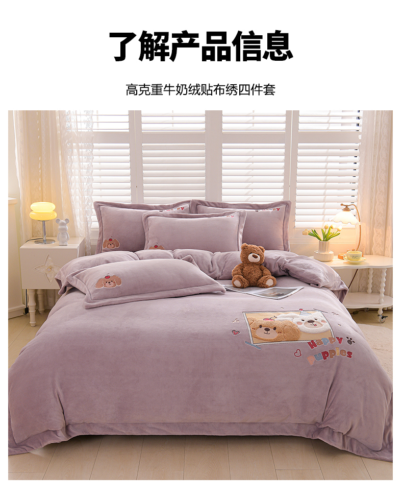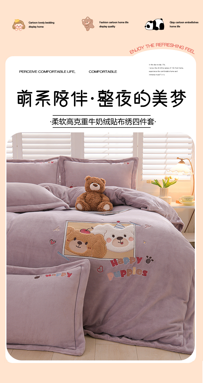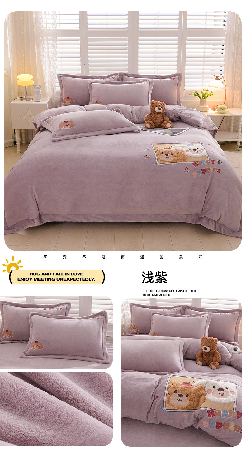 当前位置: 91家纺网 > 商品网购 > 床品套件 > 四件套 > 牛奶绒四件套 > 金昱纺 2025新款230克柔软高克重牛奶绒贴布绣四件套 可爱联盟-浅紫