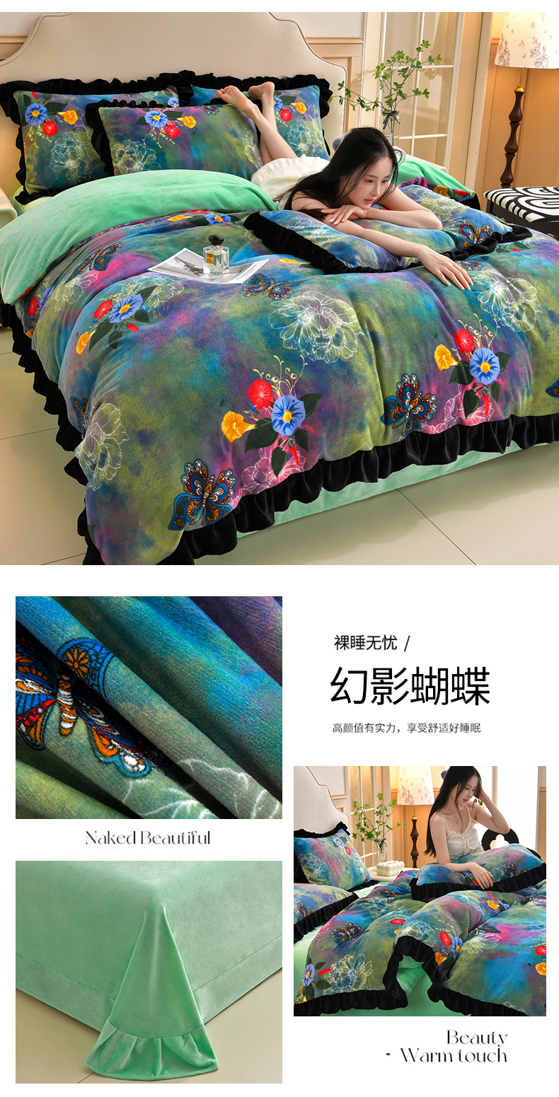 商品名称:曼尼 2025新款韩版花边牛奶绒四件套 韩版-幻影蝴蝶
