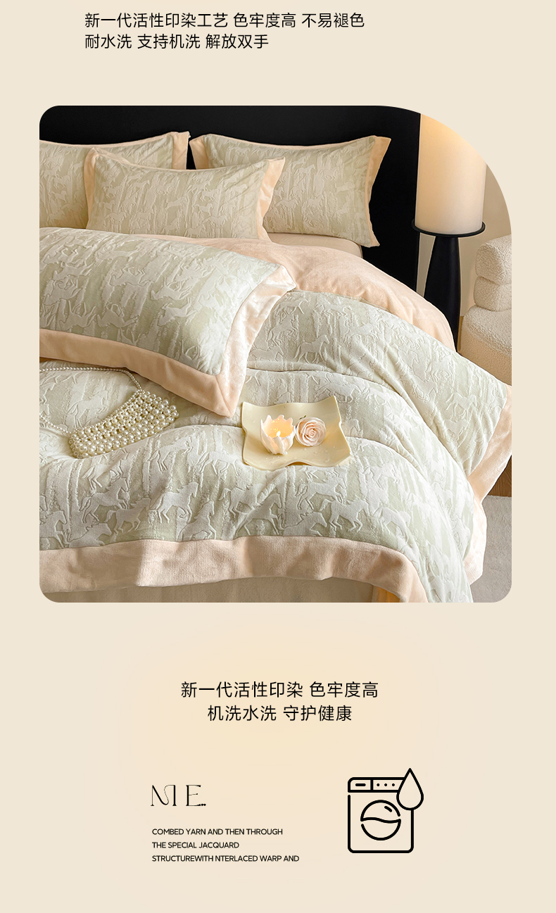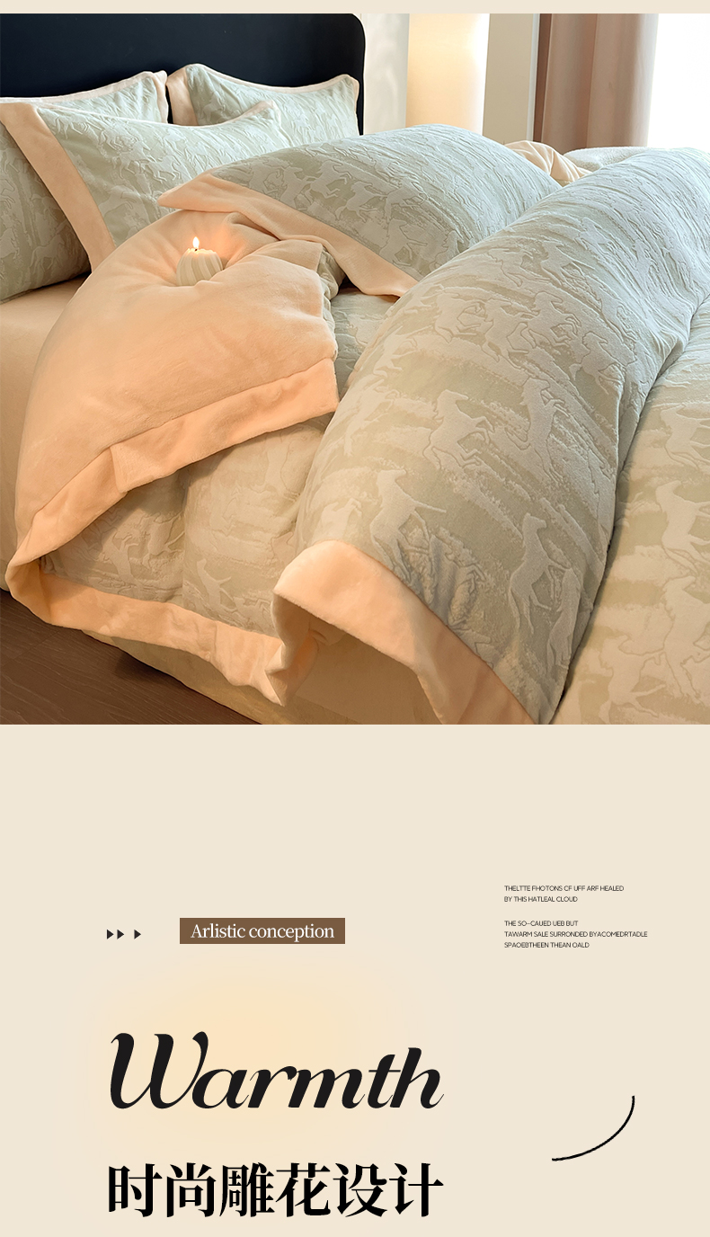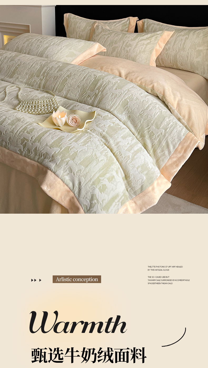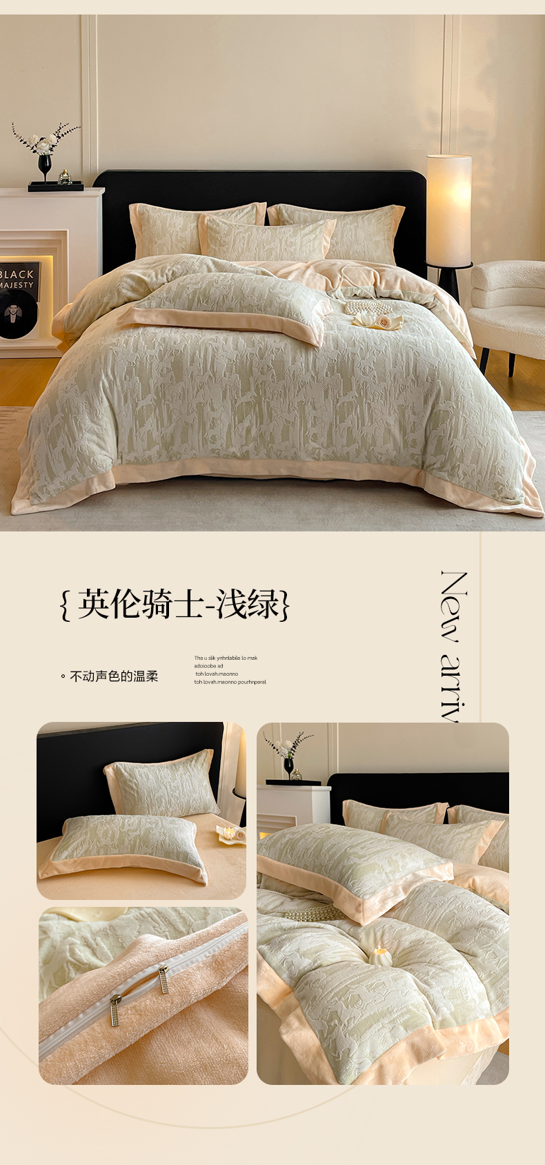 商品名称:民新家纺 2025新款牛奶绒宽包边雕花四件套 英伦骑士-浅绿