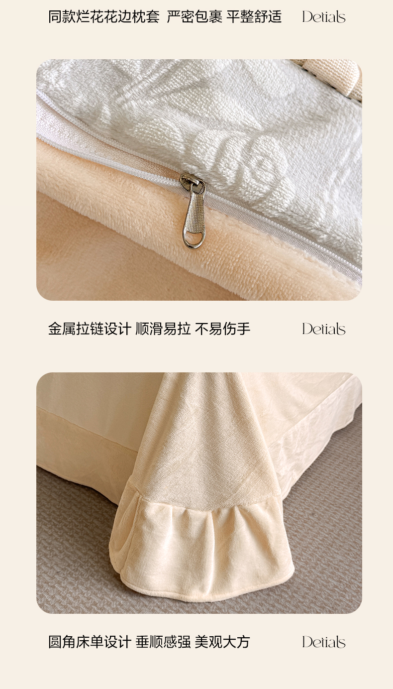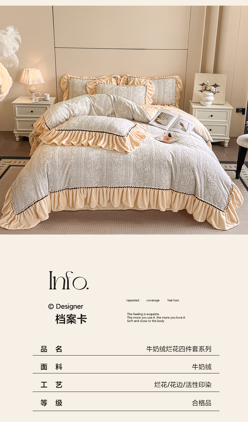 商品名称:畅畅家纺 2025新款轻奢高档烂花牛奶绒花边款四件套 臻爱花园 -浅灰