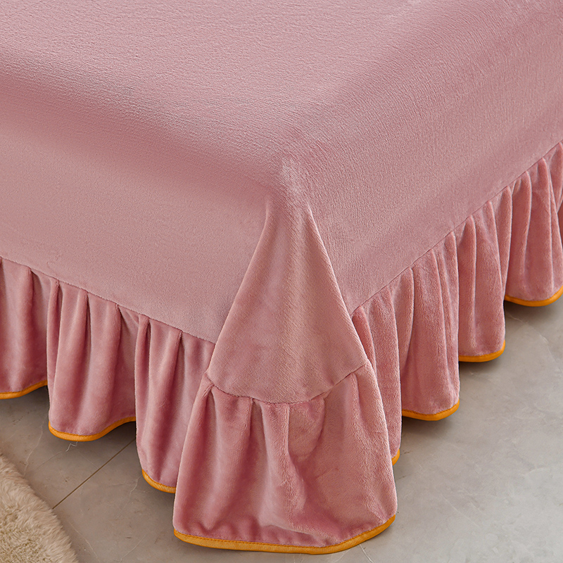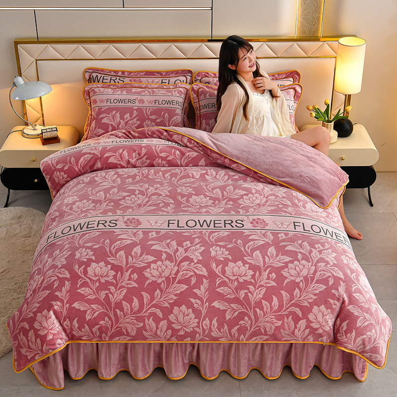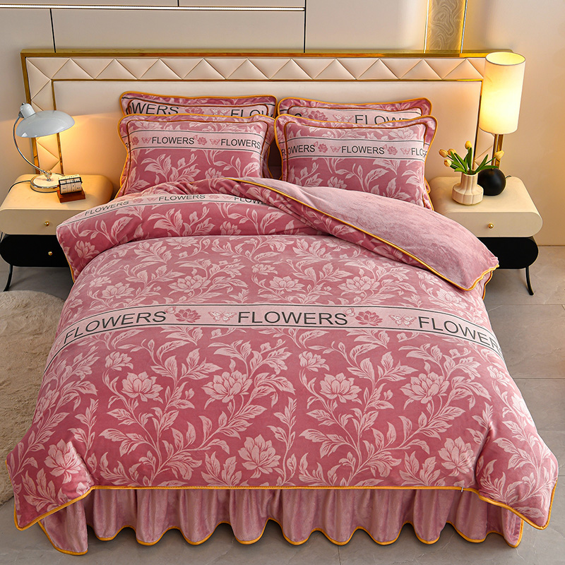 商品名称:妮恒美 2025新款牛奶绒印花床裙款四件套法莱绒四件套珊瑚金貂绒四件套 暖暖时光